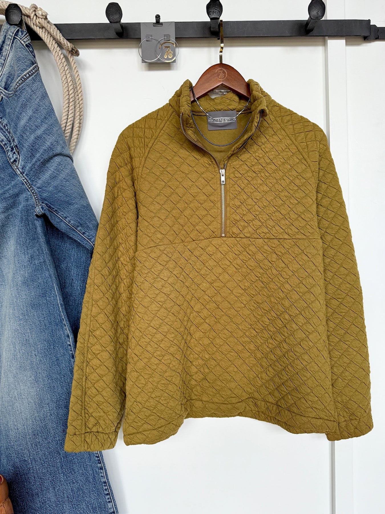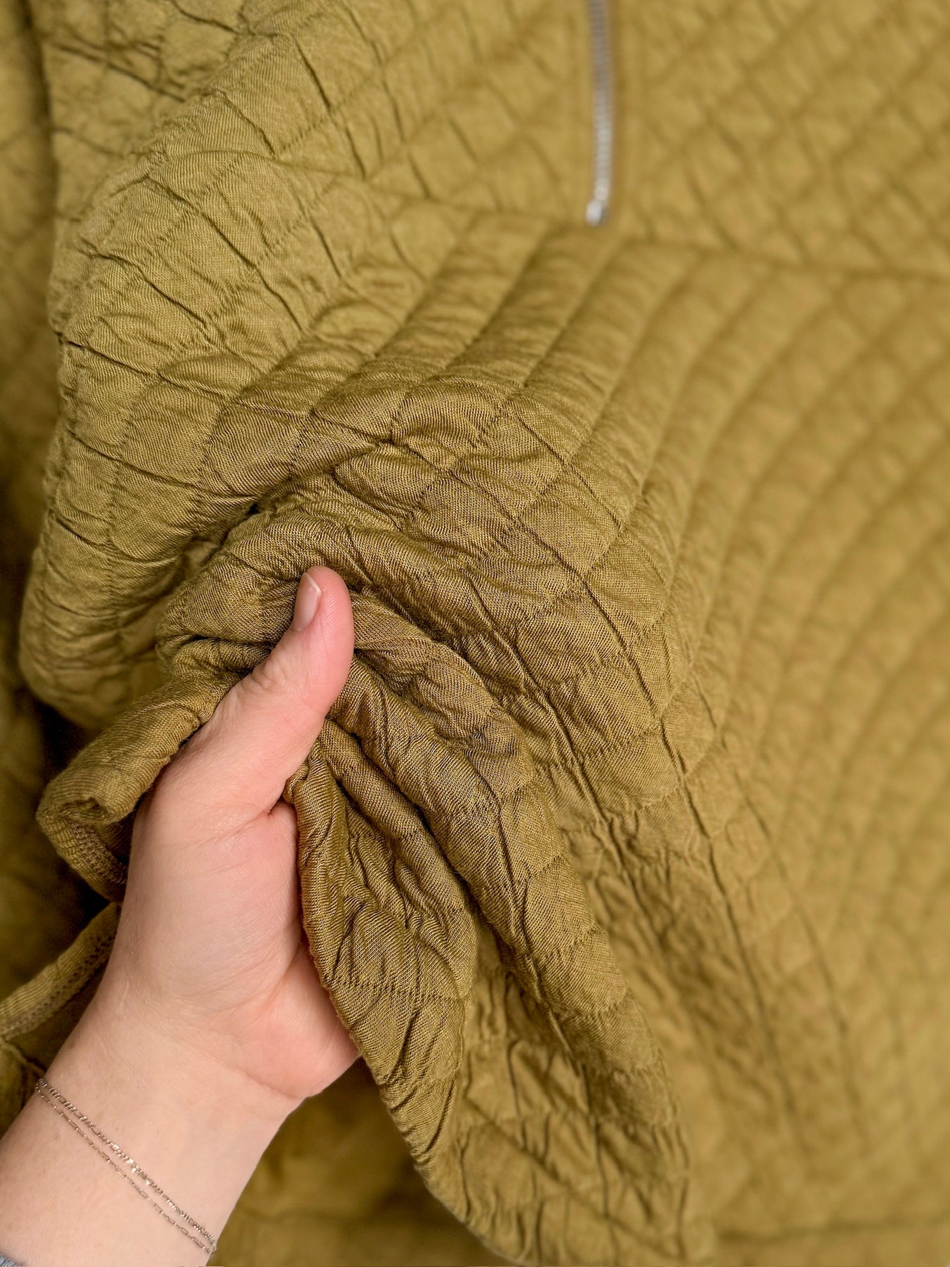 Chartreuse olive quilted long sleeve quarter zip pullover.