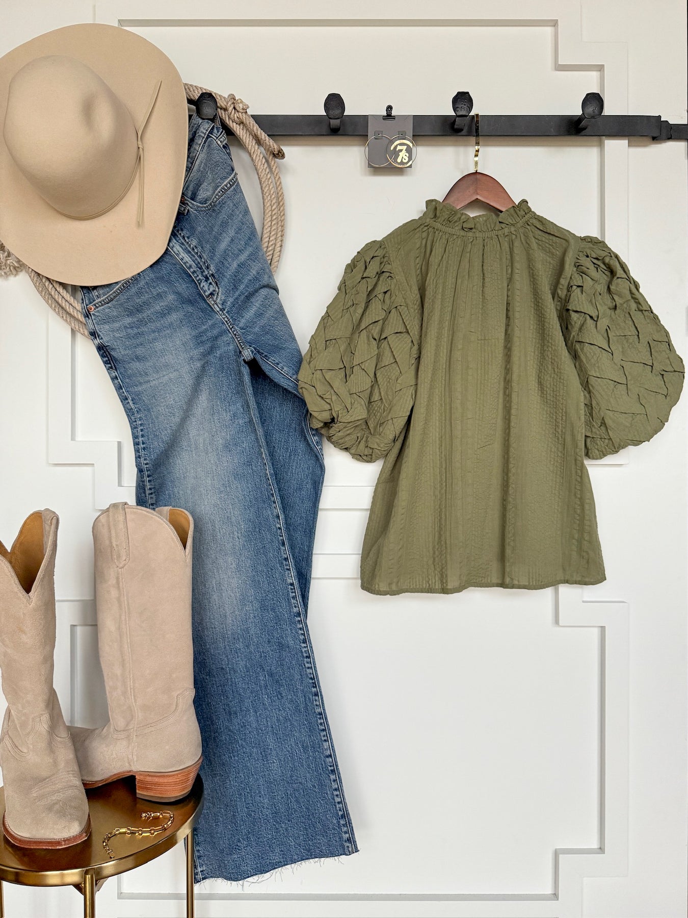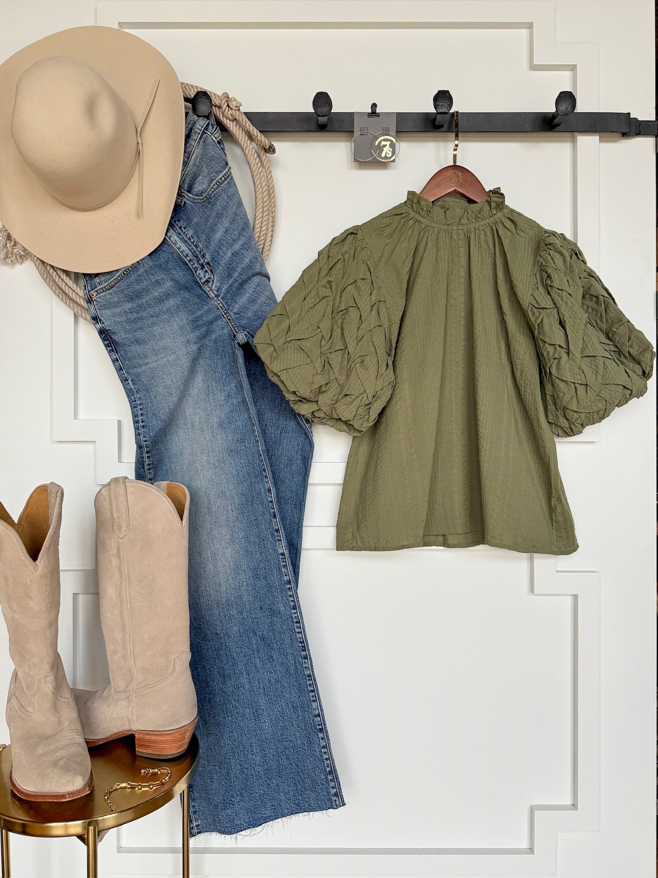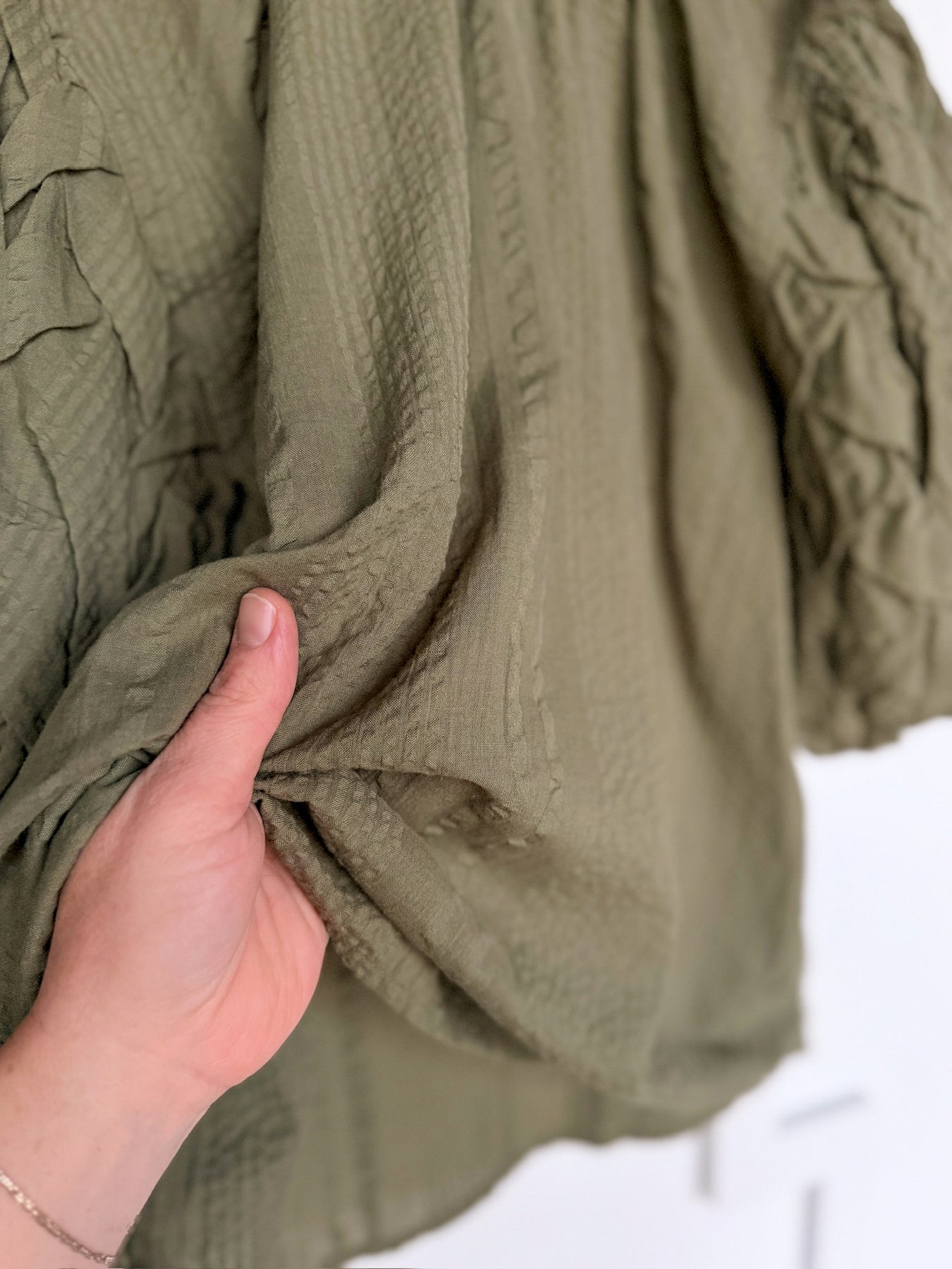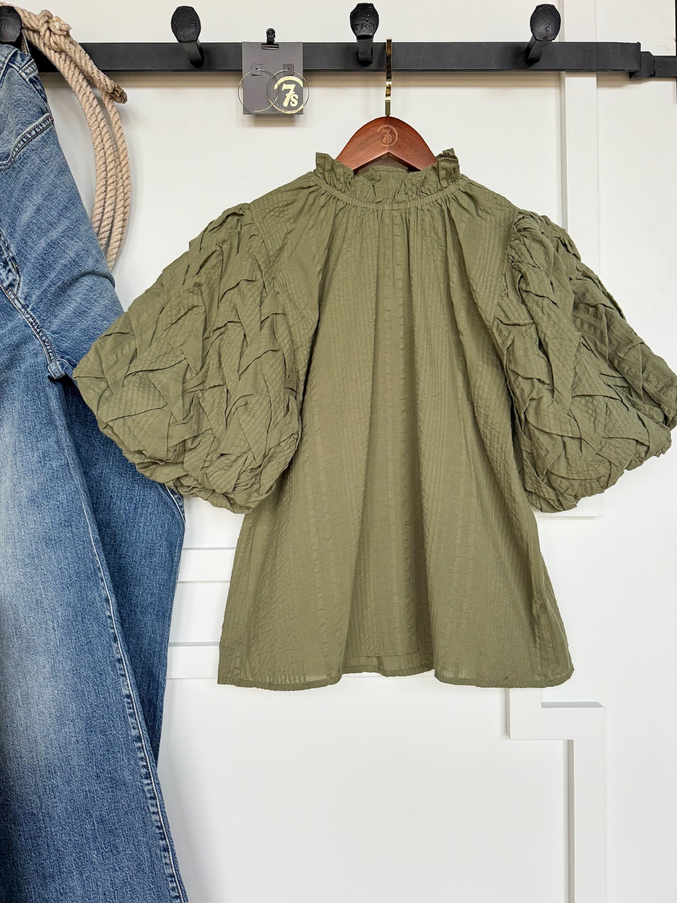 Exaggerated puff sleeves with a cross weave pattern and elastic cuffs.