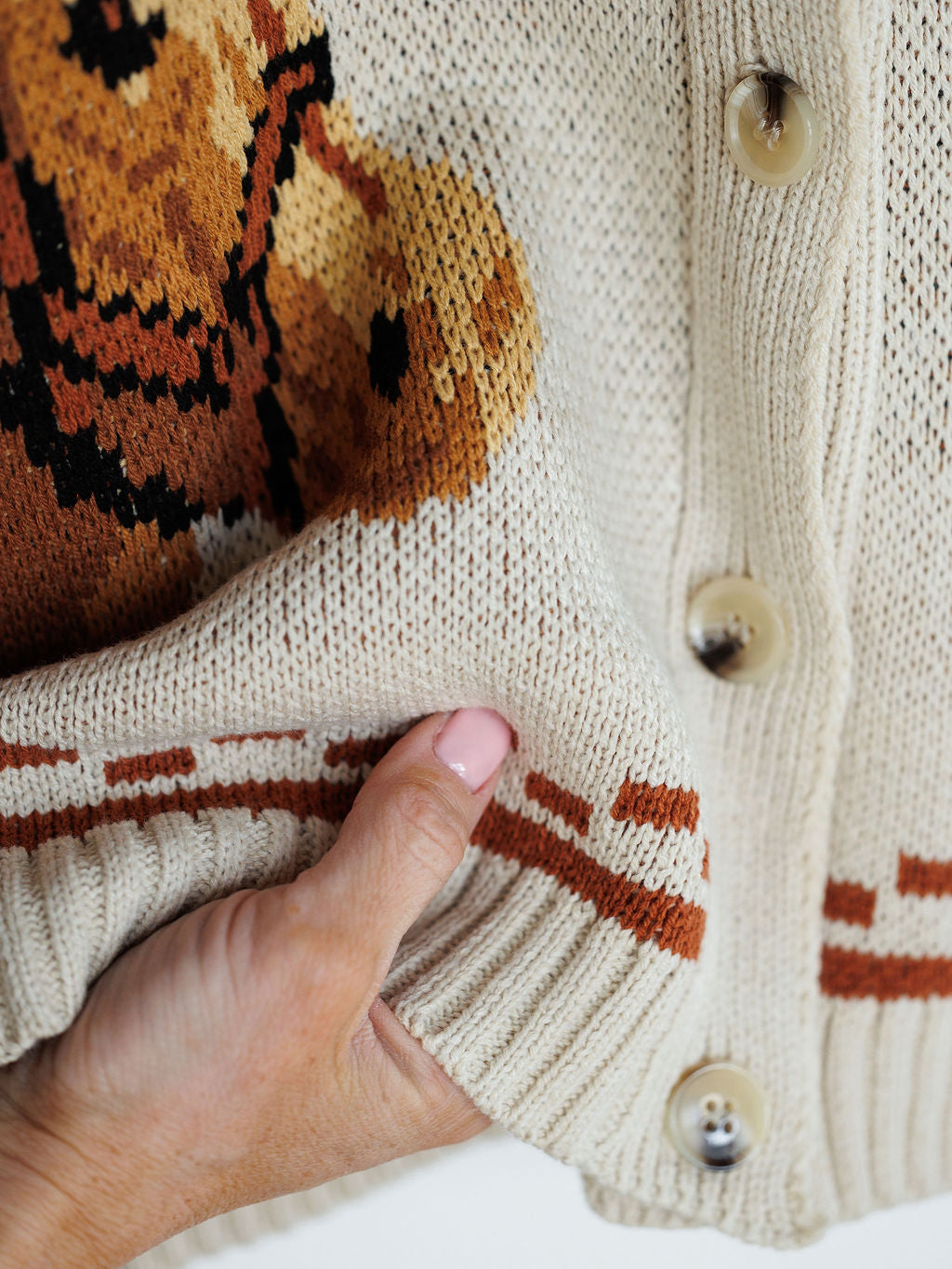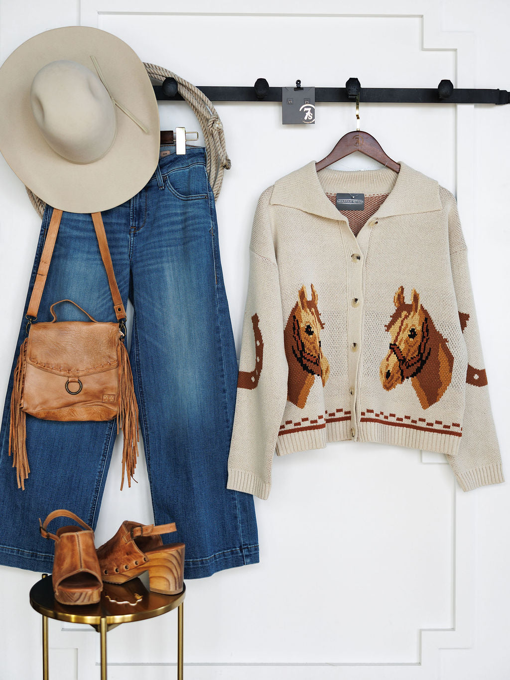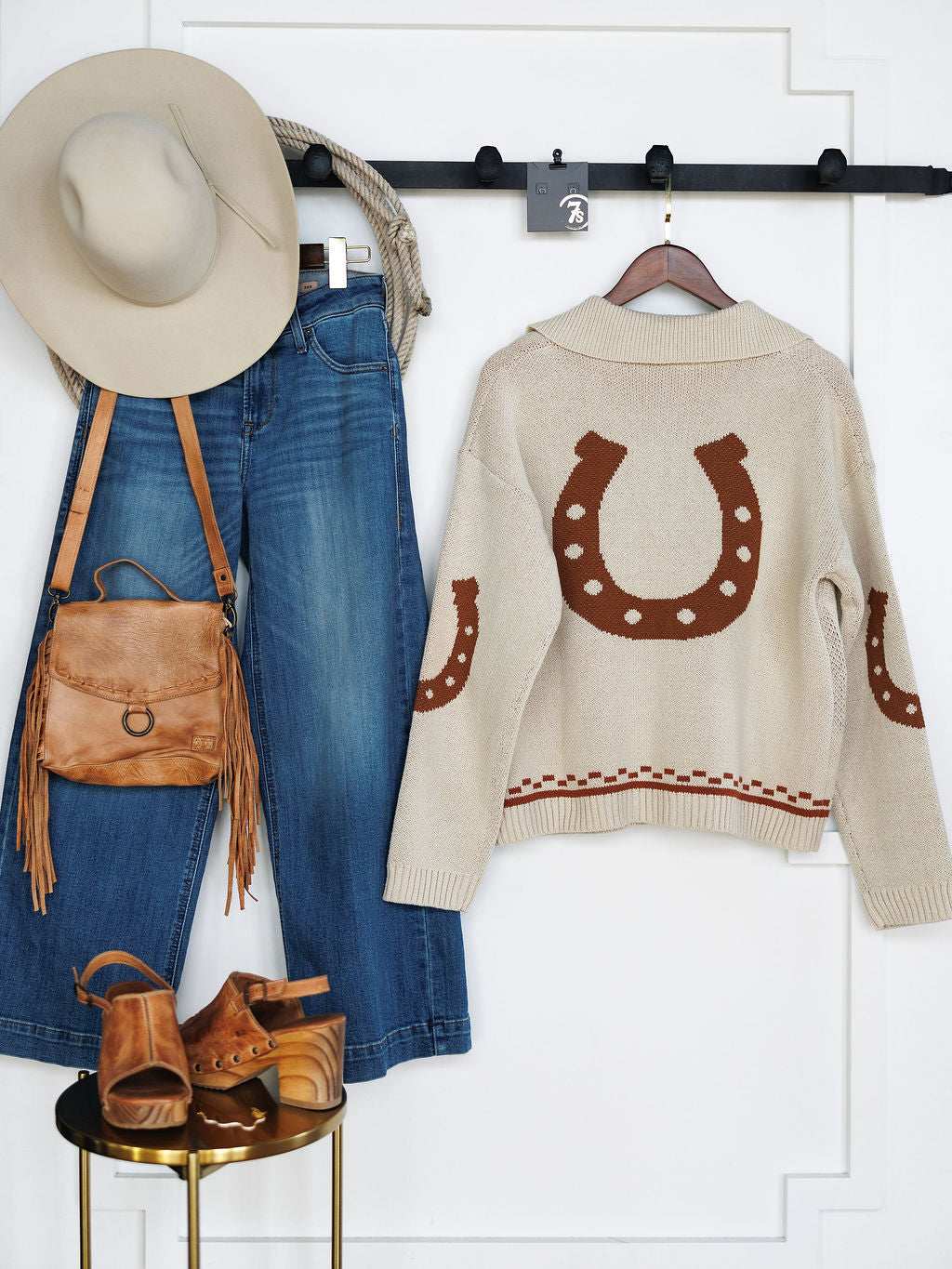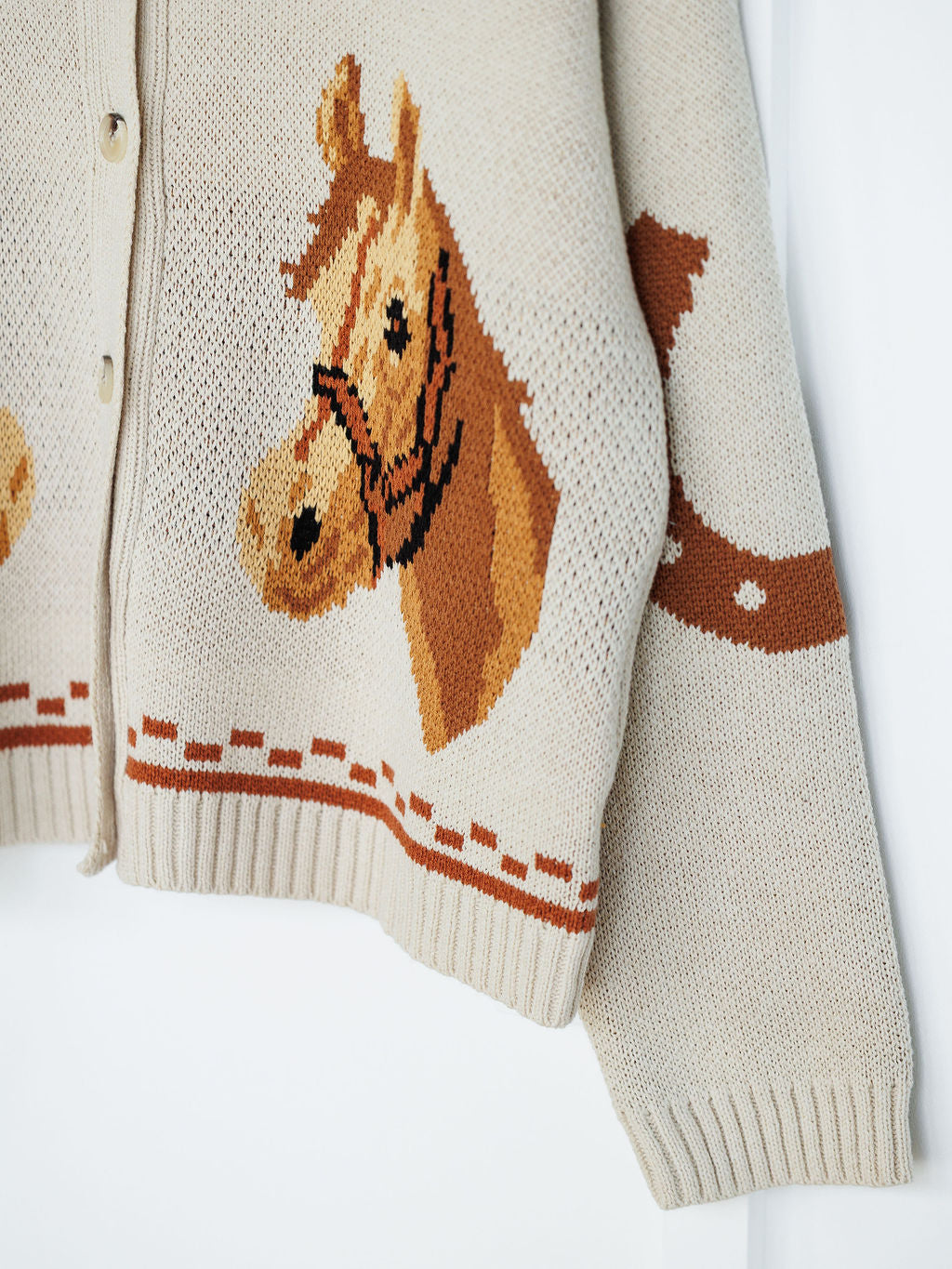 Horse knit design in the front, horseshoe knit design in the back and on the sleeves.