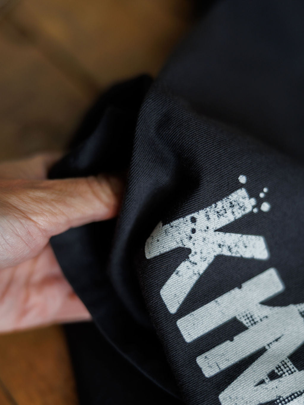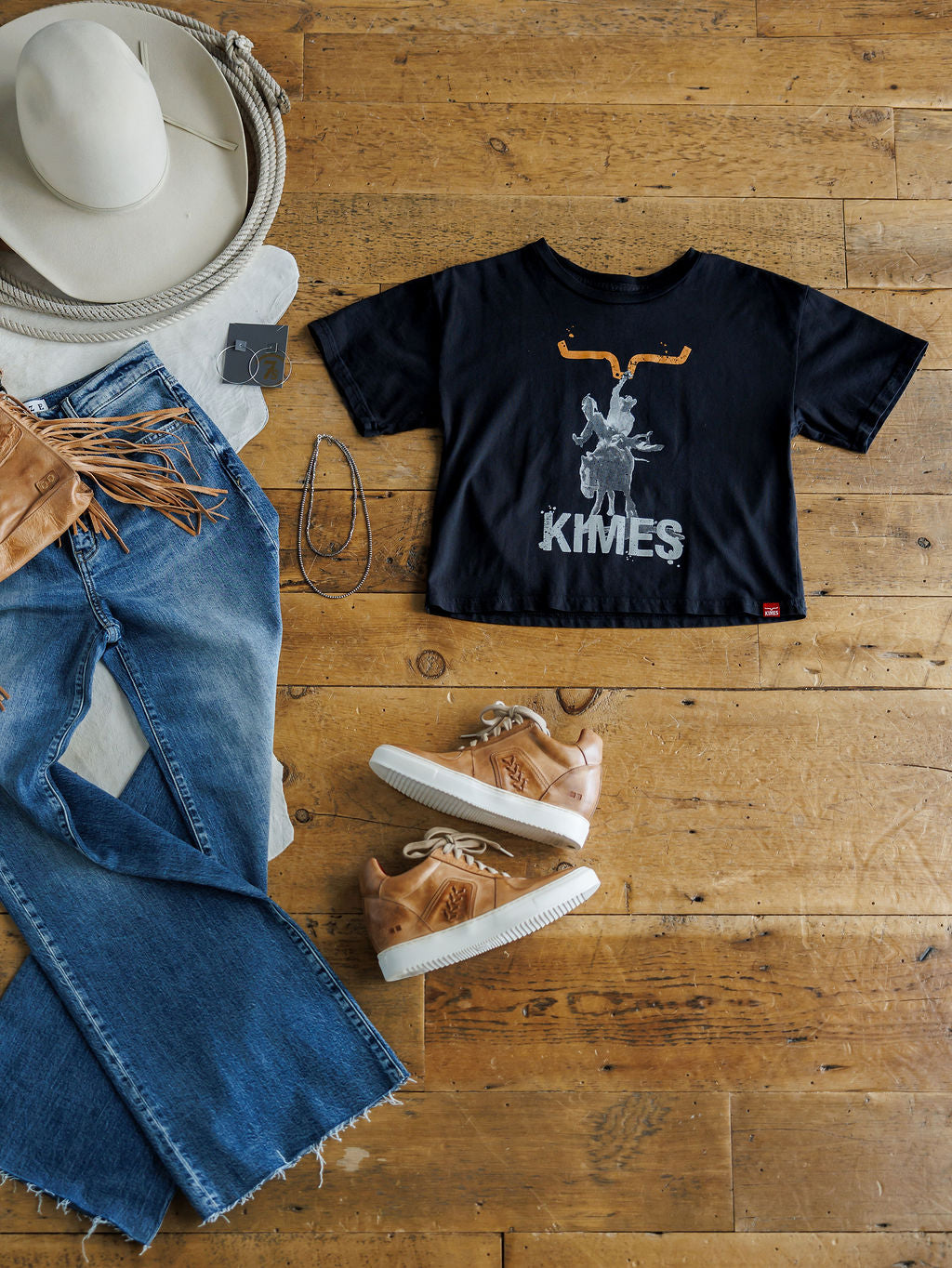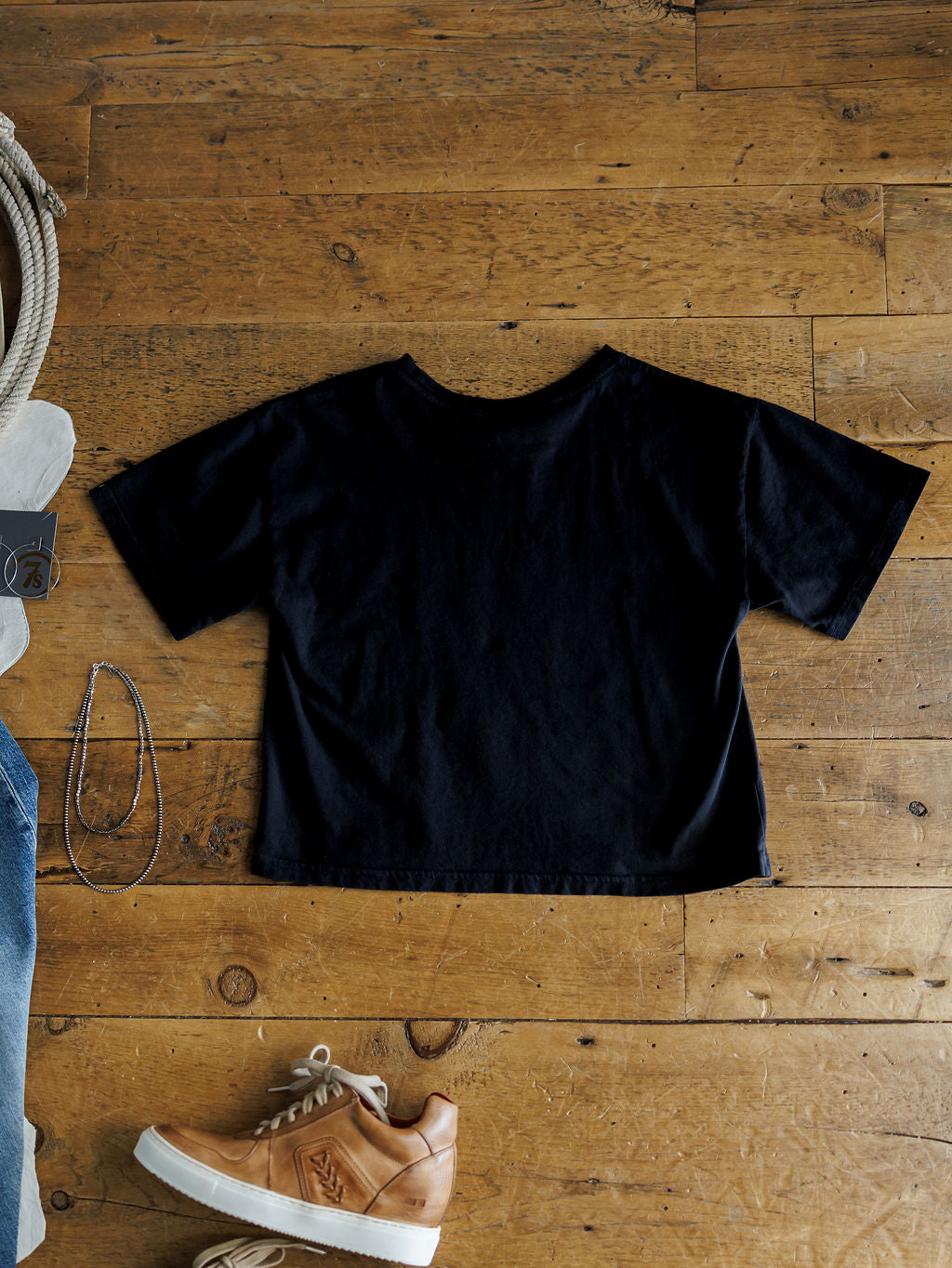Longer crop fit, shows little to no skin if worn with high rise denim.