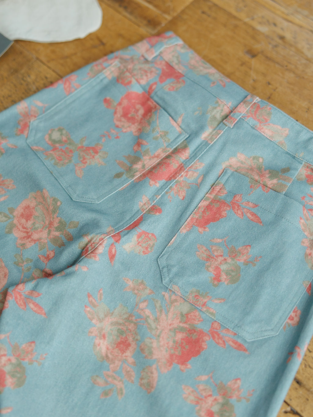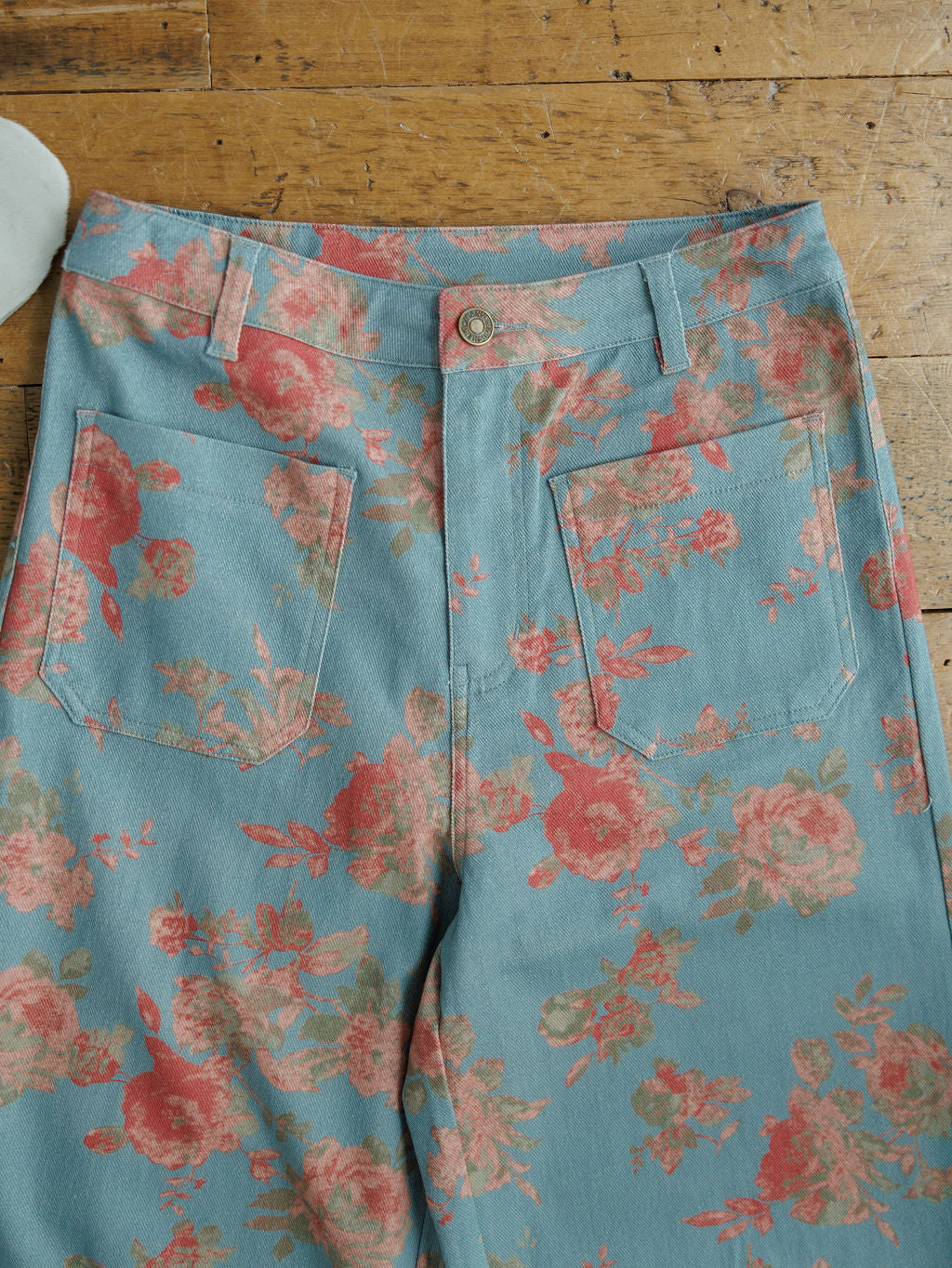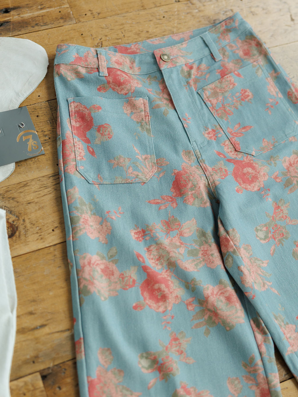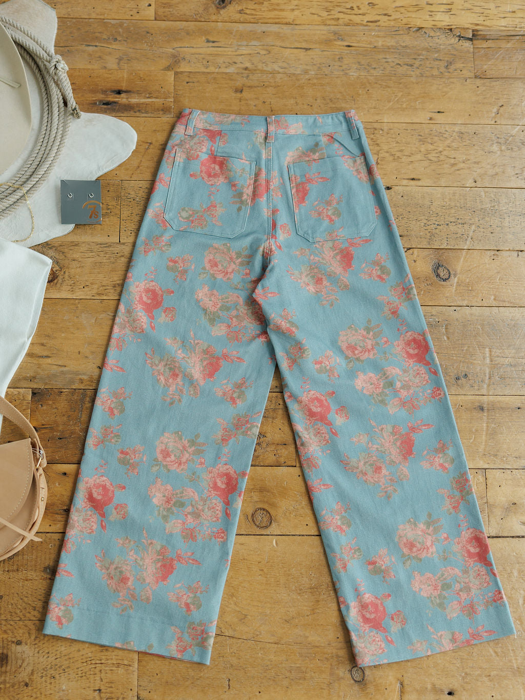 Slate blue floral print high waisted wide leg pants.