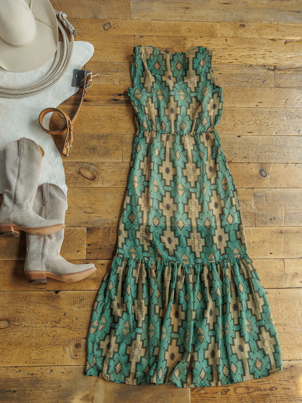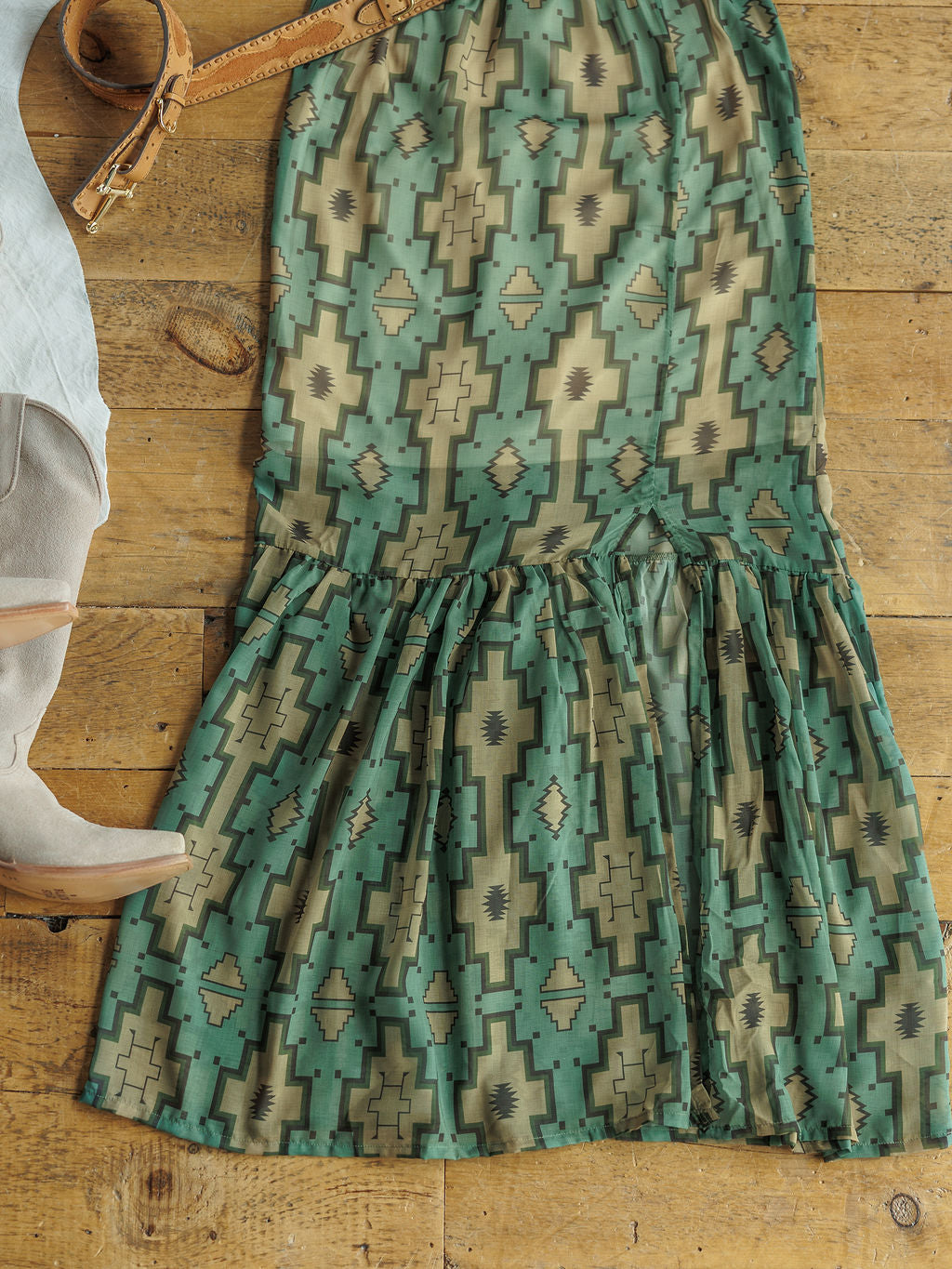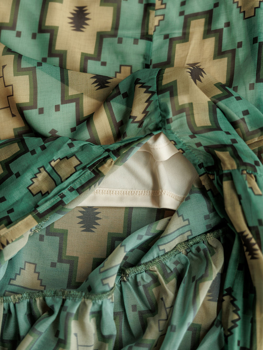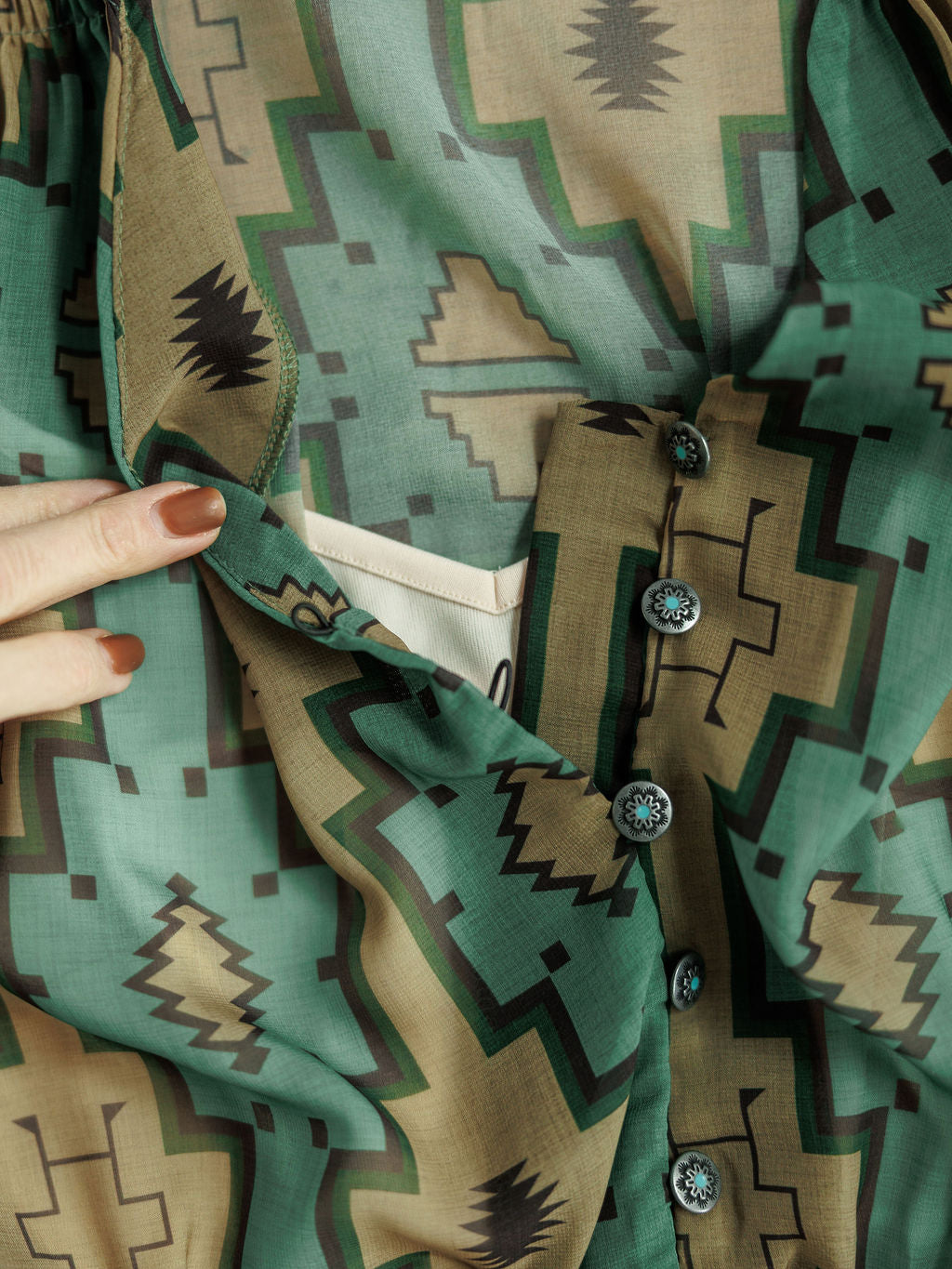 Fern green with black, olive, and tan southwest patterns throughout.