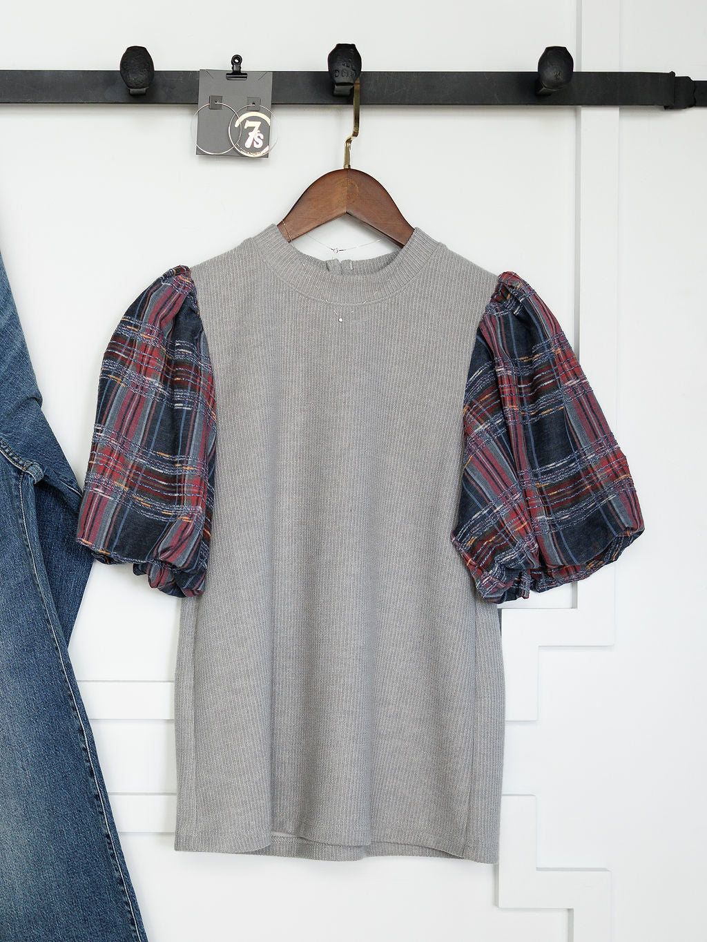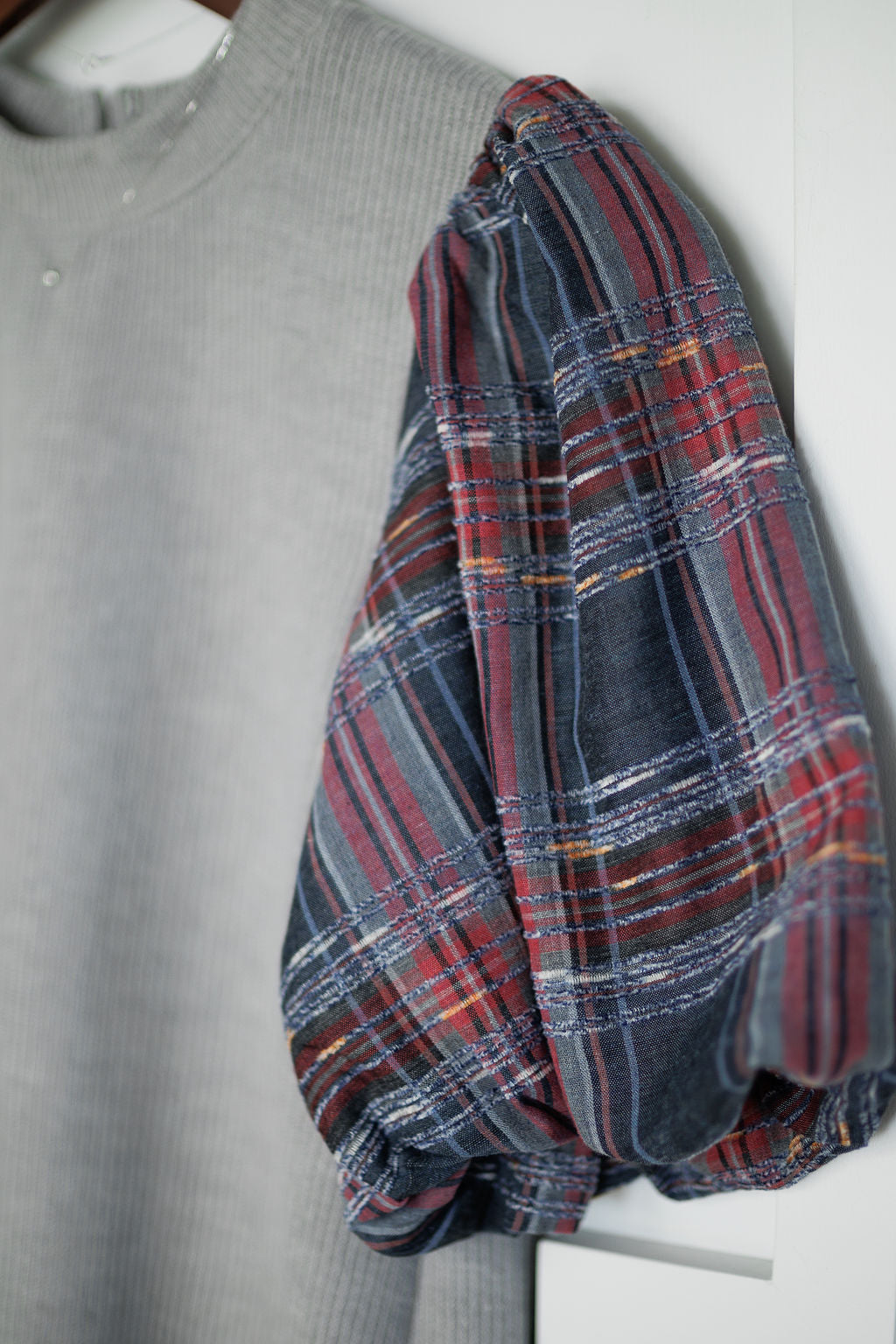 Plaid puff sleeves with elastic cuffs.