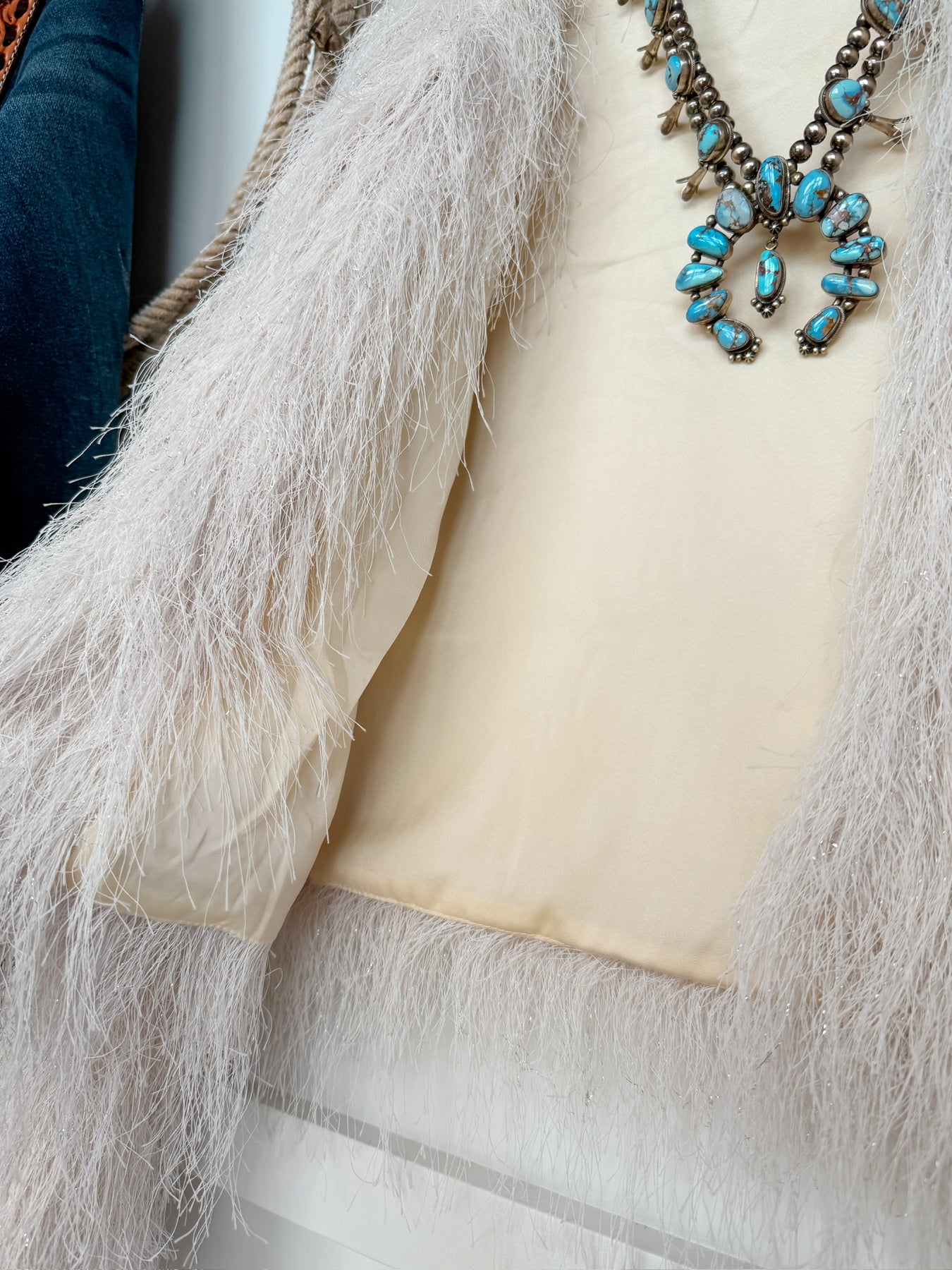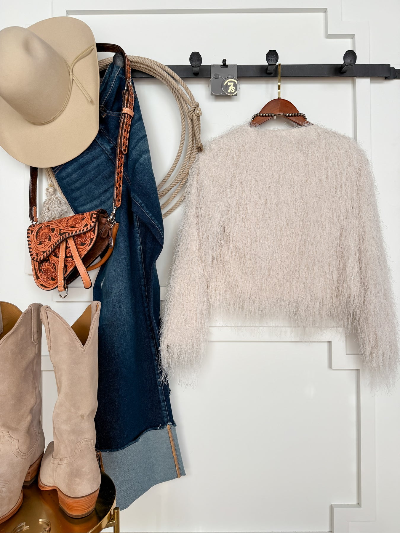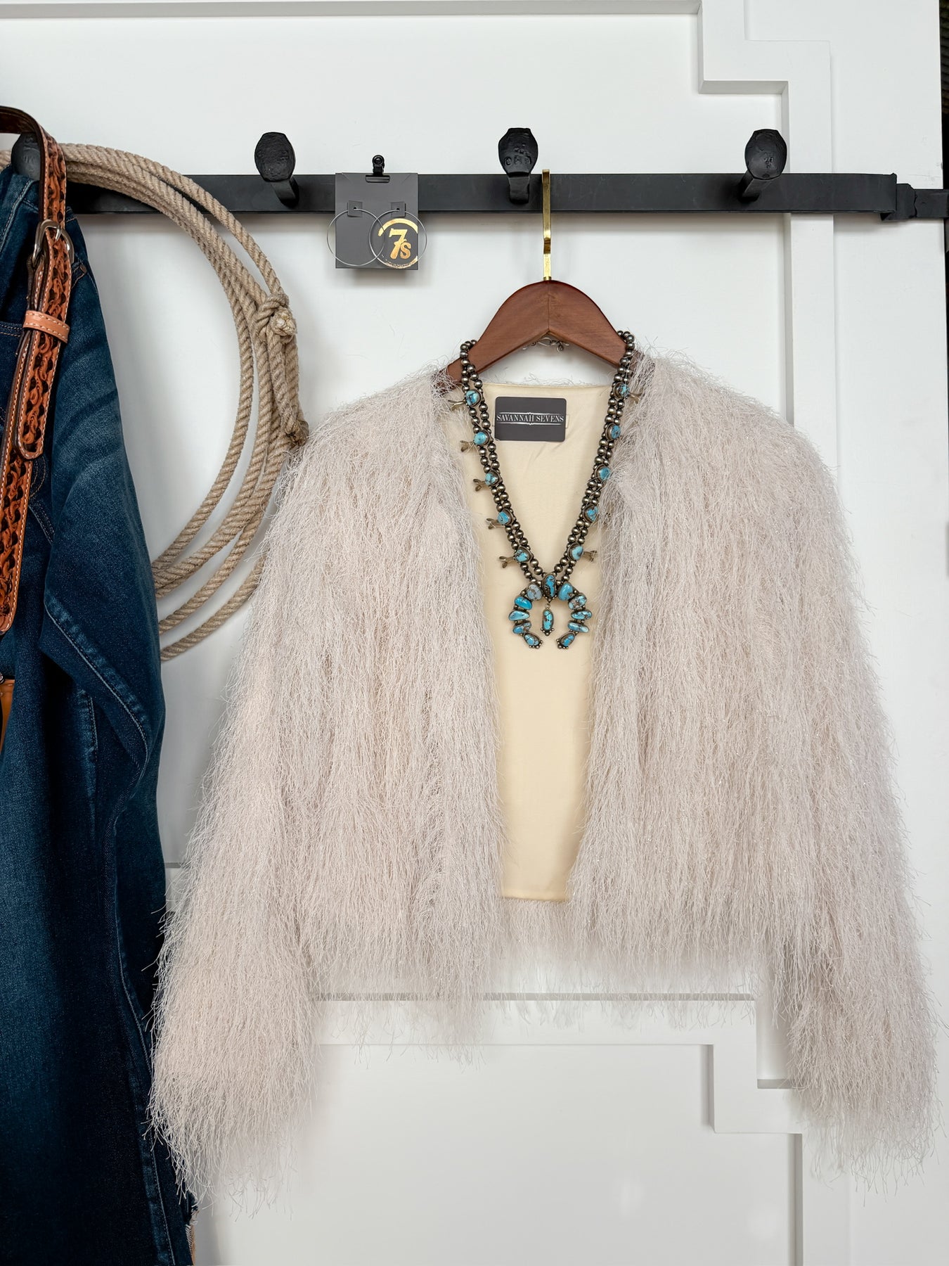 Shaggy knit fabric with silver metallic detail woven throughout.