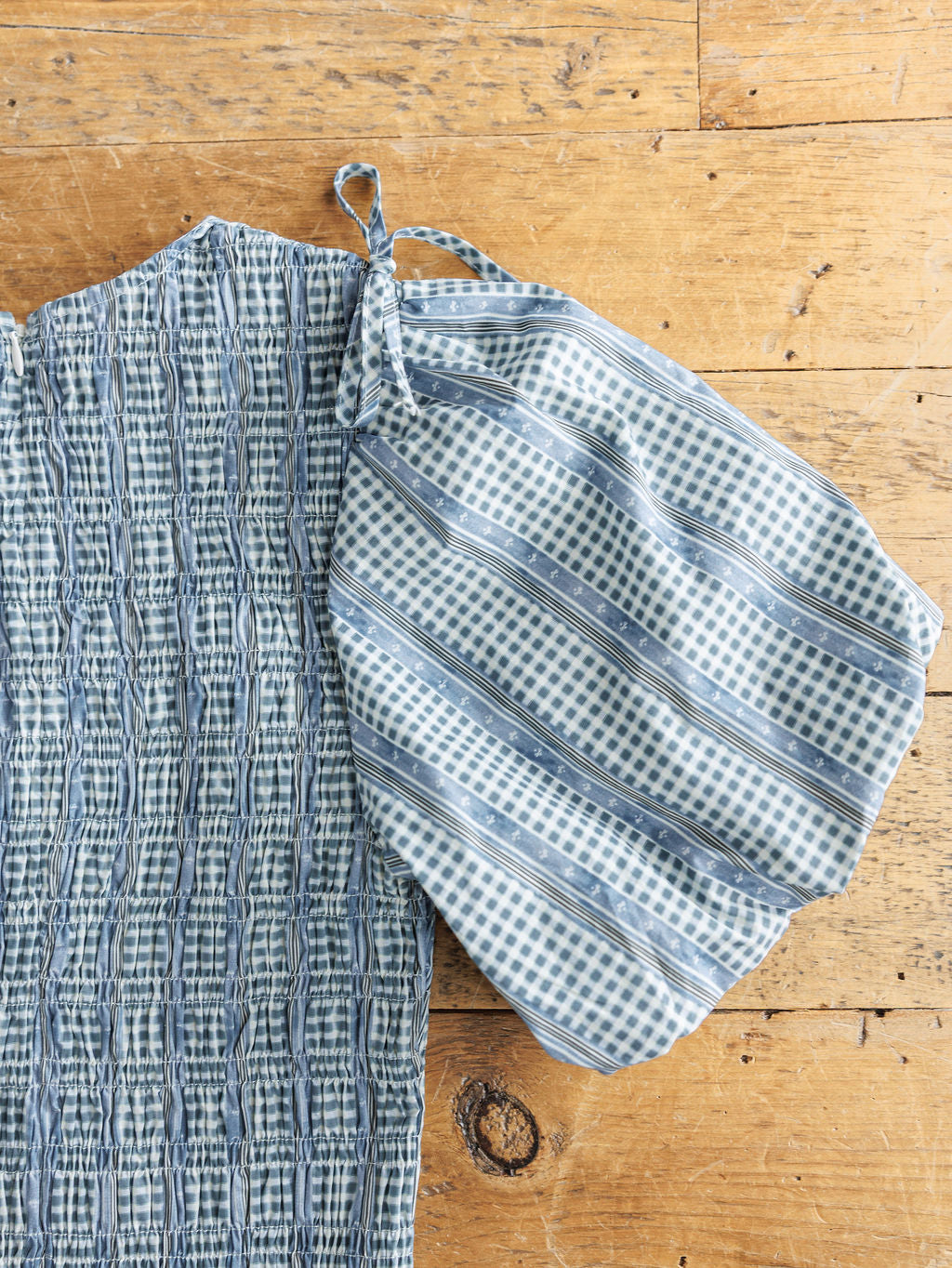 Puff sleeves with elastic cuff and faux tie detail.
