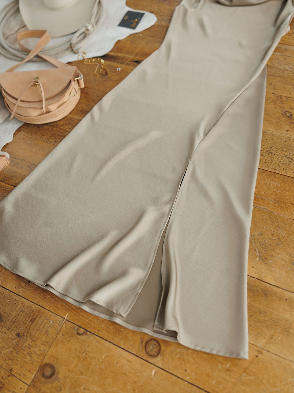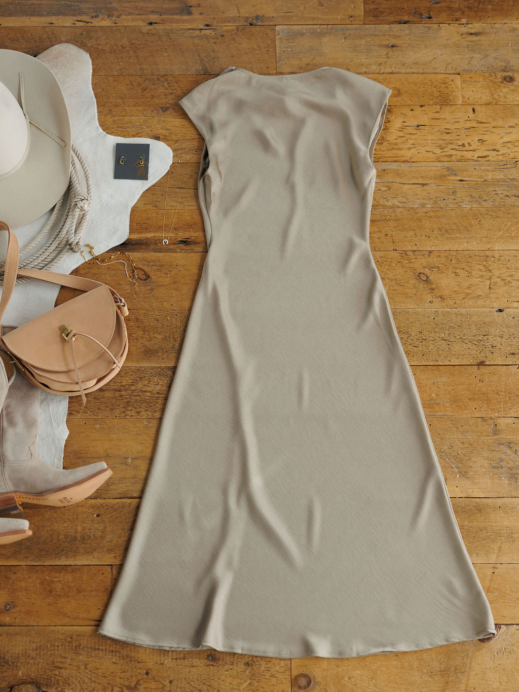 Deep champagne satin cap sleeve midi dress.