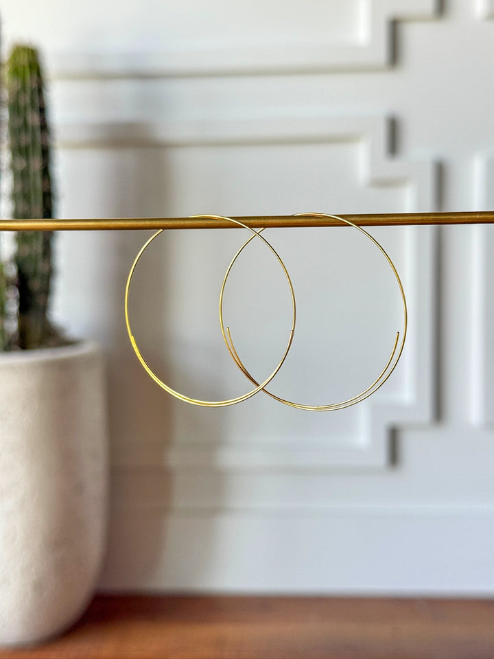 Gold continuous hoop earrings.