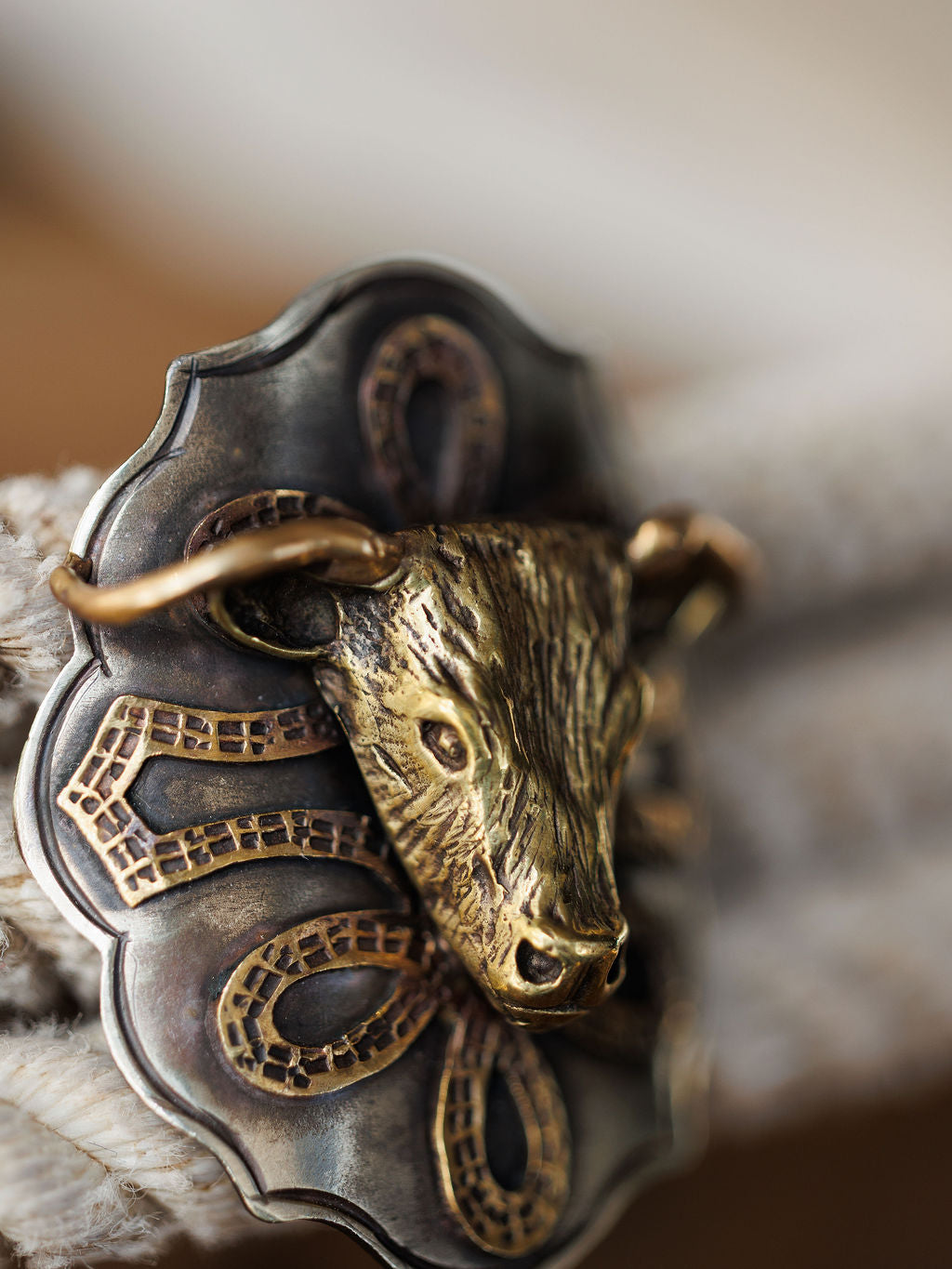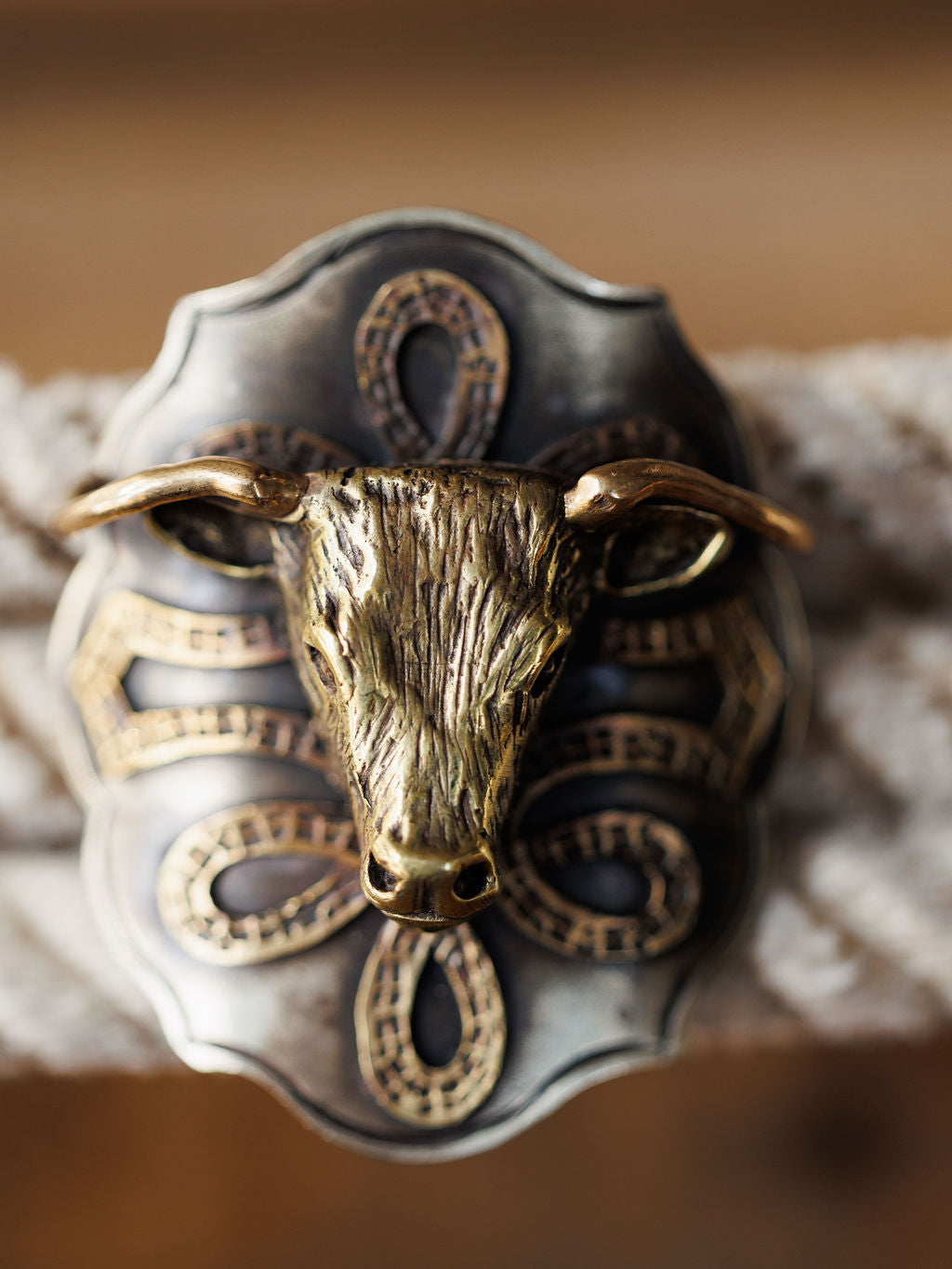 Gold steer head with boot stitch detail.