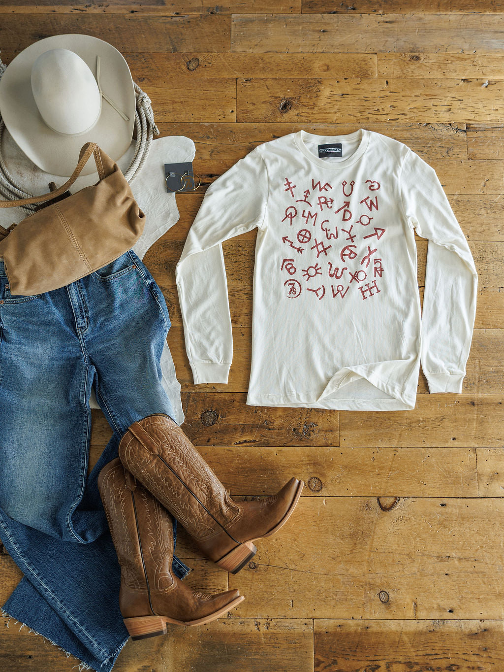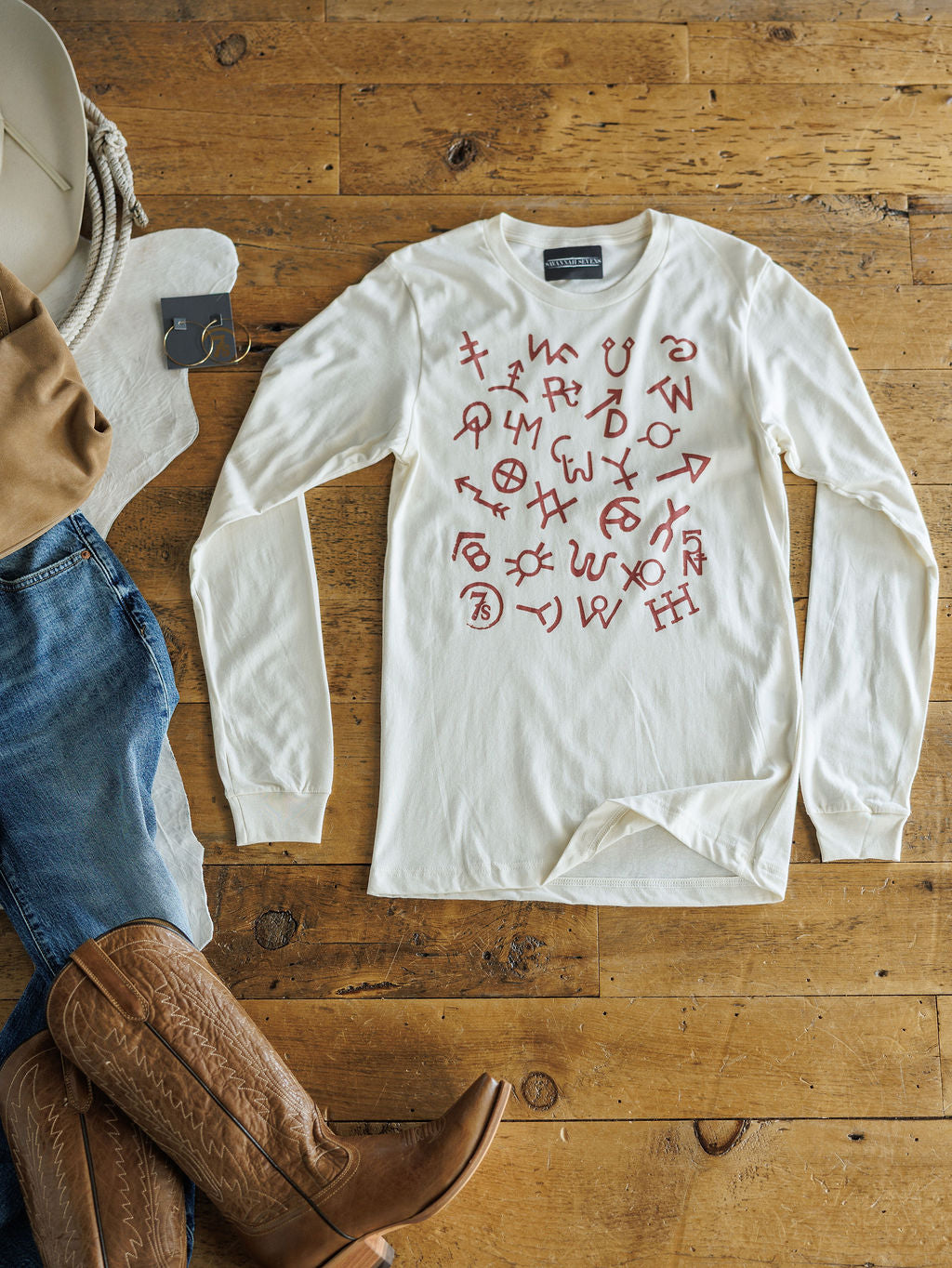 Natural long sleeve tee with Savannah 7s exclusive rust brand graphics.