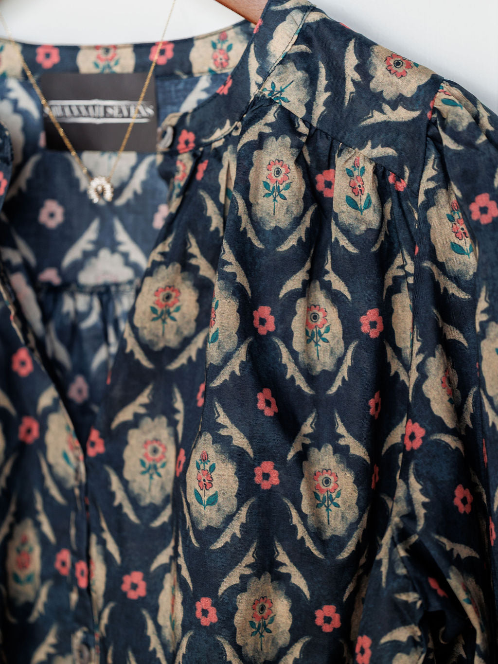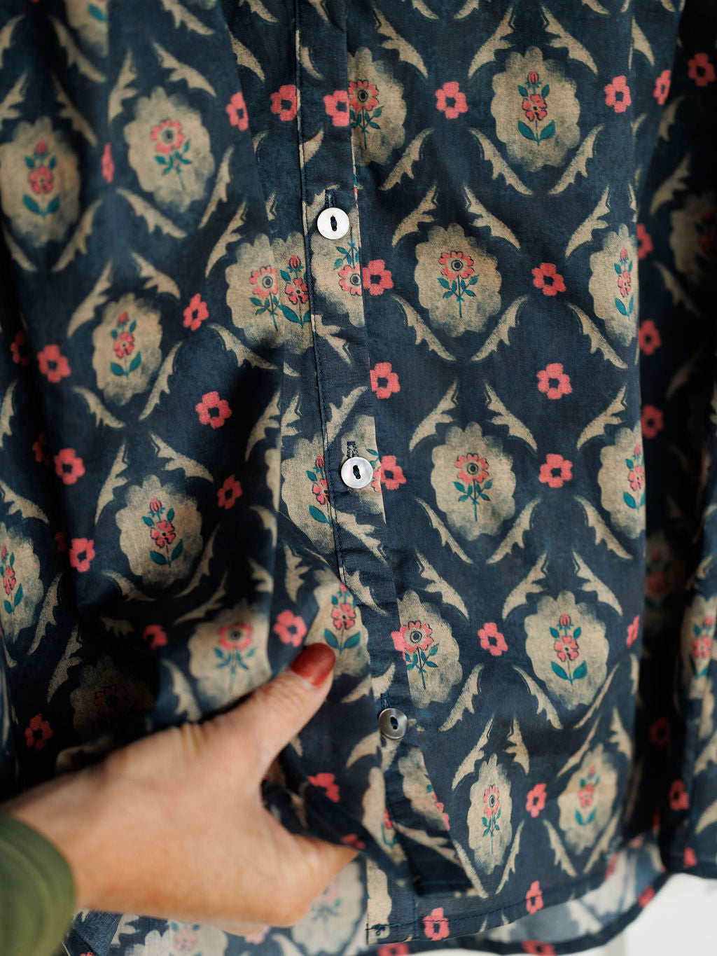Deep navy teal with natural and coral pink southwest floral pattern throughout.
