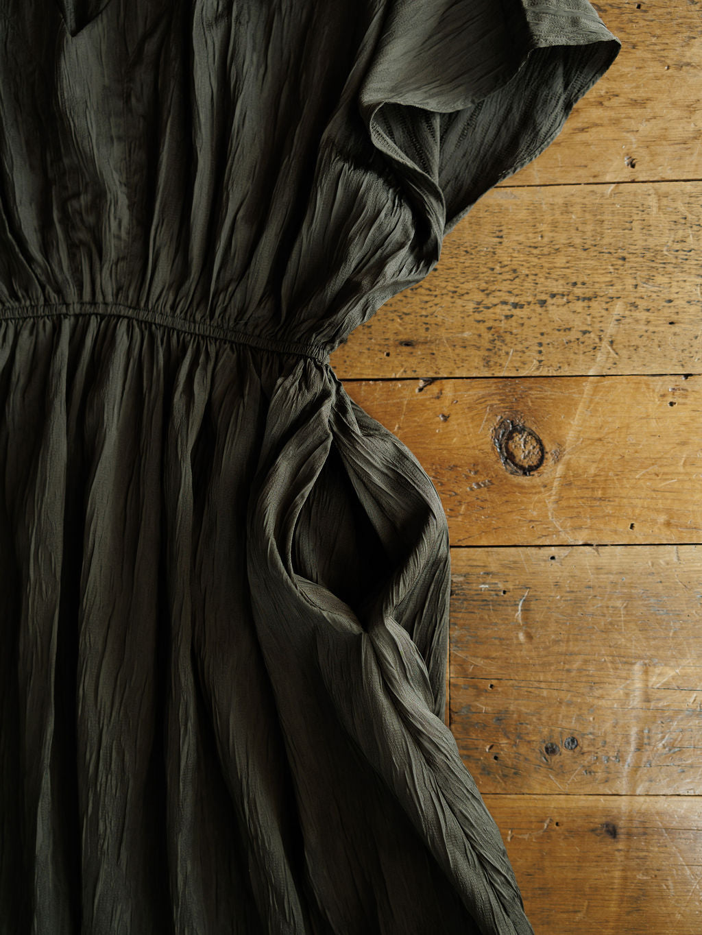 Deep moss satin short sleeve midi dress.