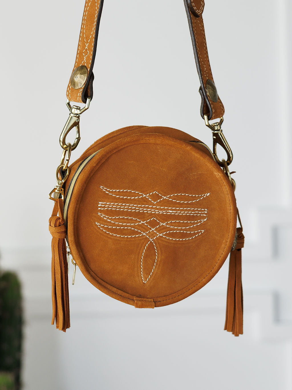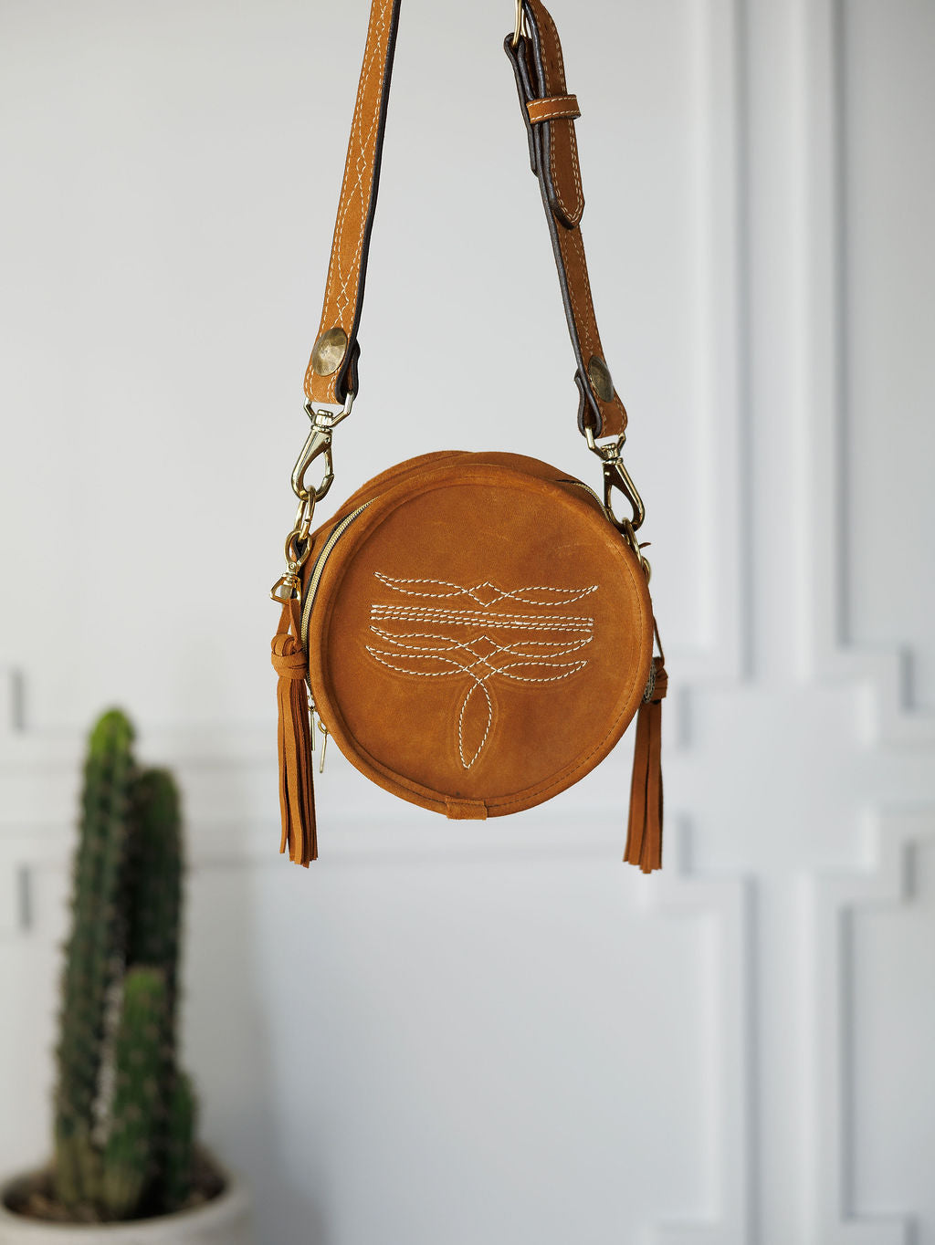 Detachable shoulder strap also has intricate boot stitch detail along with an adjustable buckle.