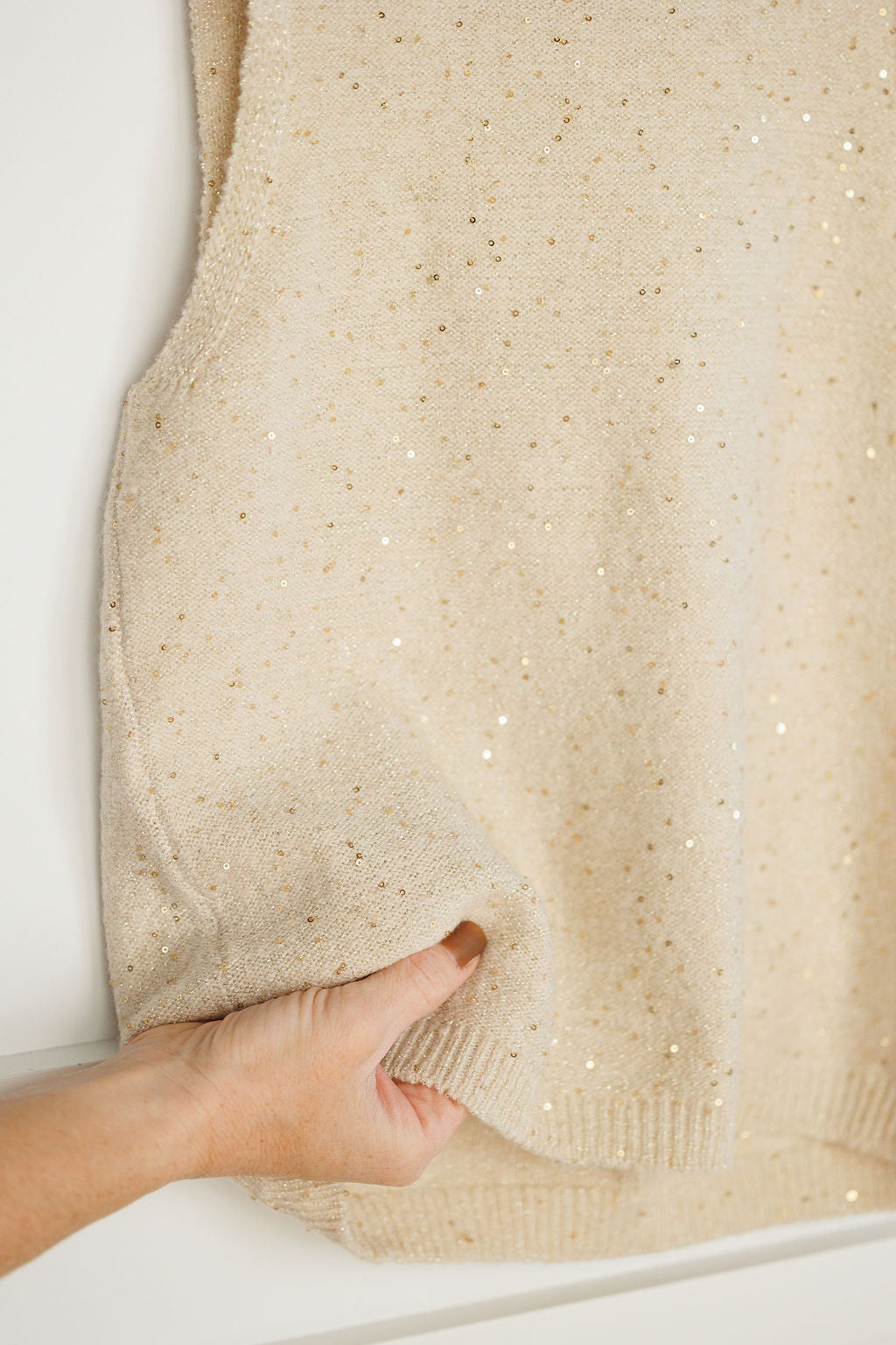 Petite gold sequins and woven metallic thread.