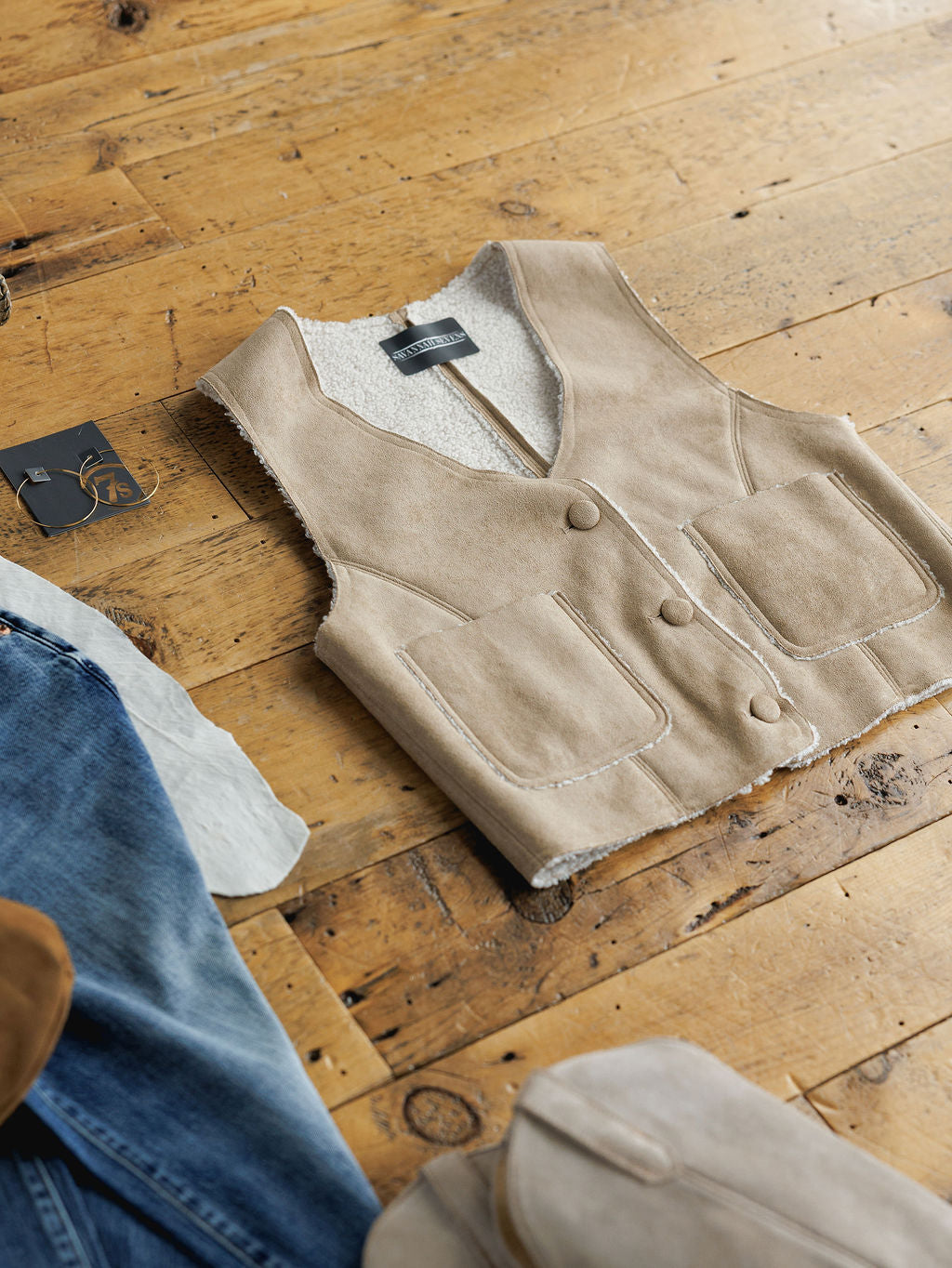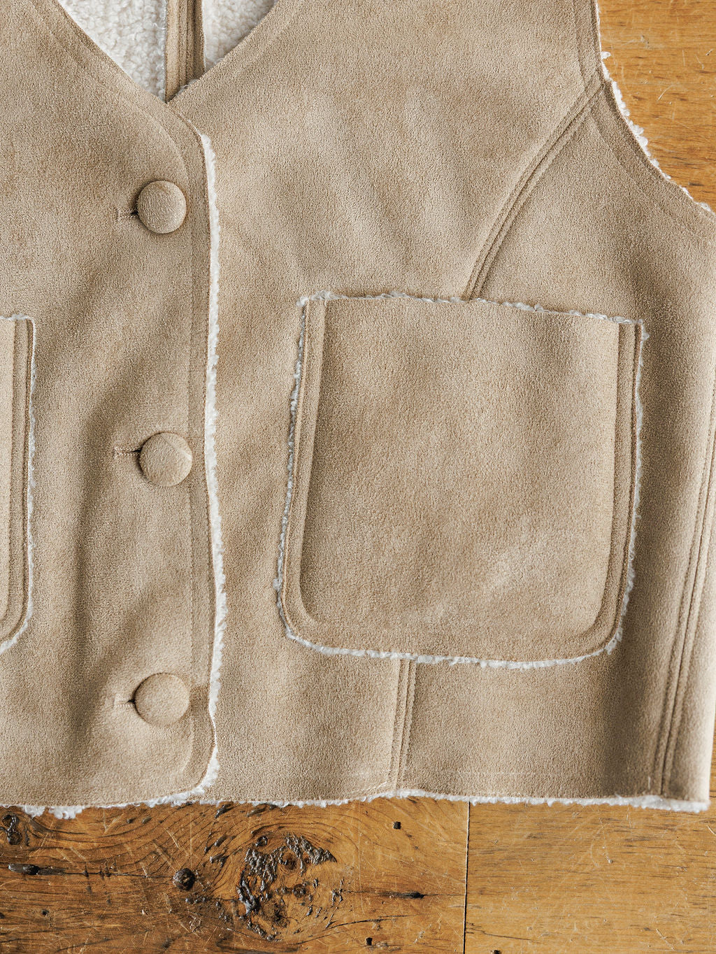 Cool sand faux suede button up vest.
