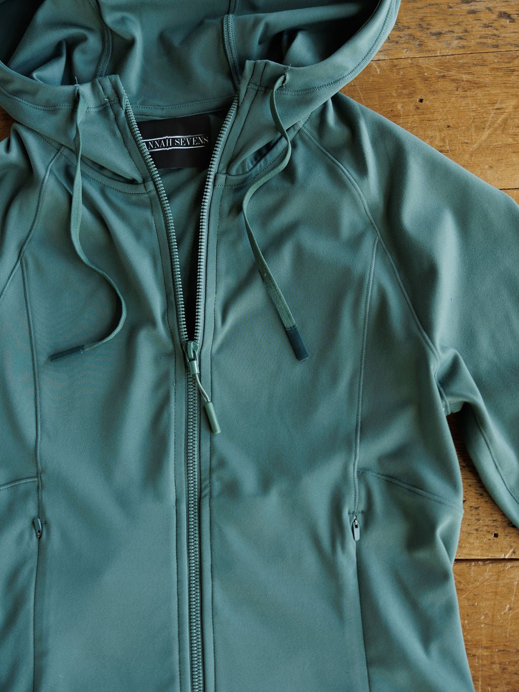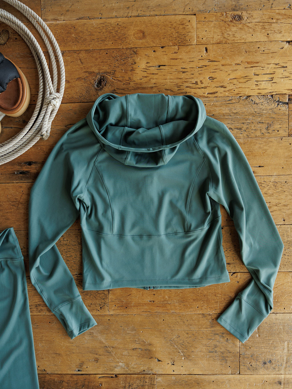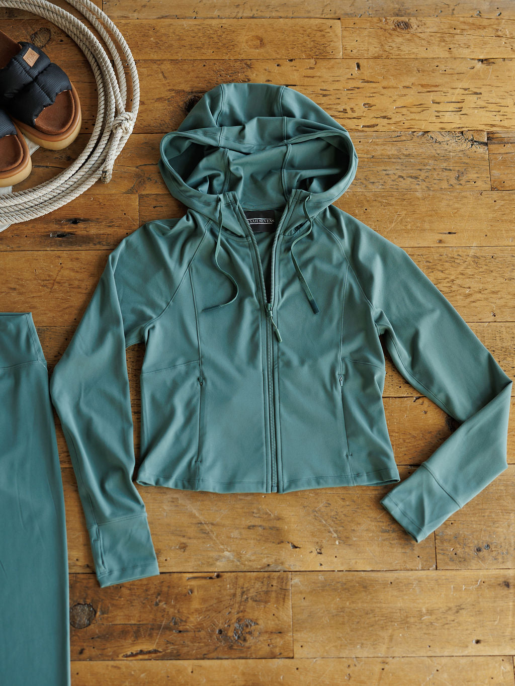 Blue sage full zip jacket and high waisted flare legging activewear set.