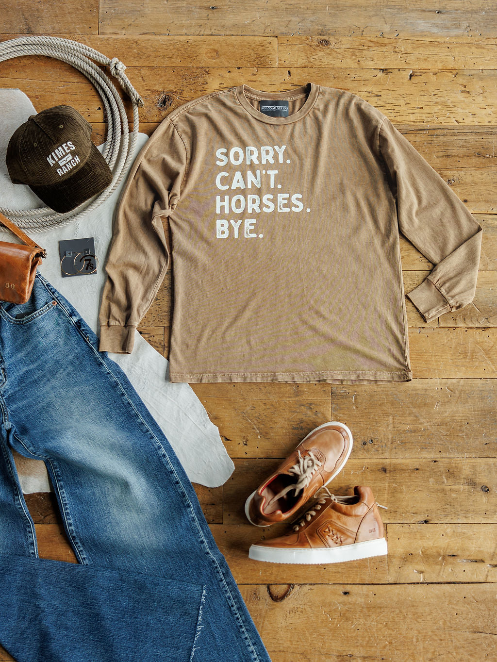 "Sorry. Can't. Horses. Bye." graphic long sleeve top.