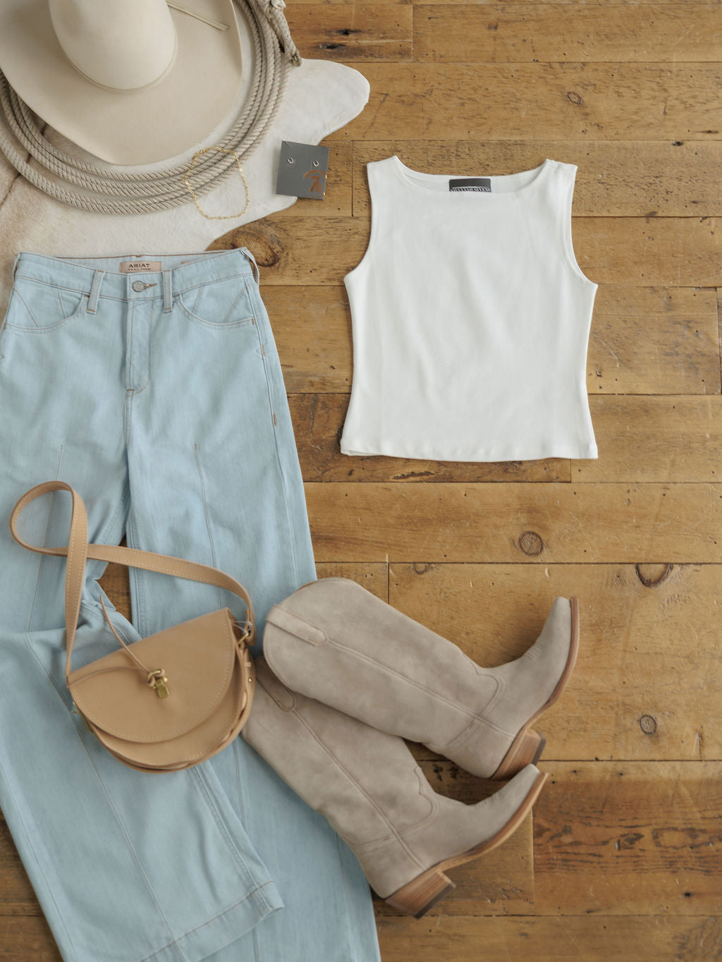 Shorter but not quite cropped; shows no skin if worn with high rise denim.