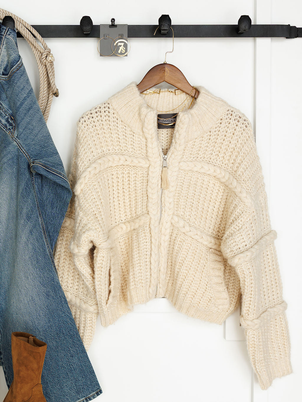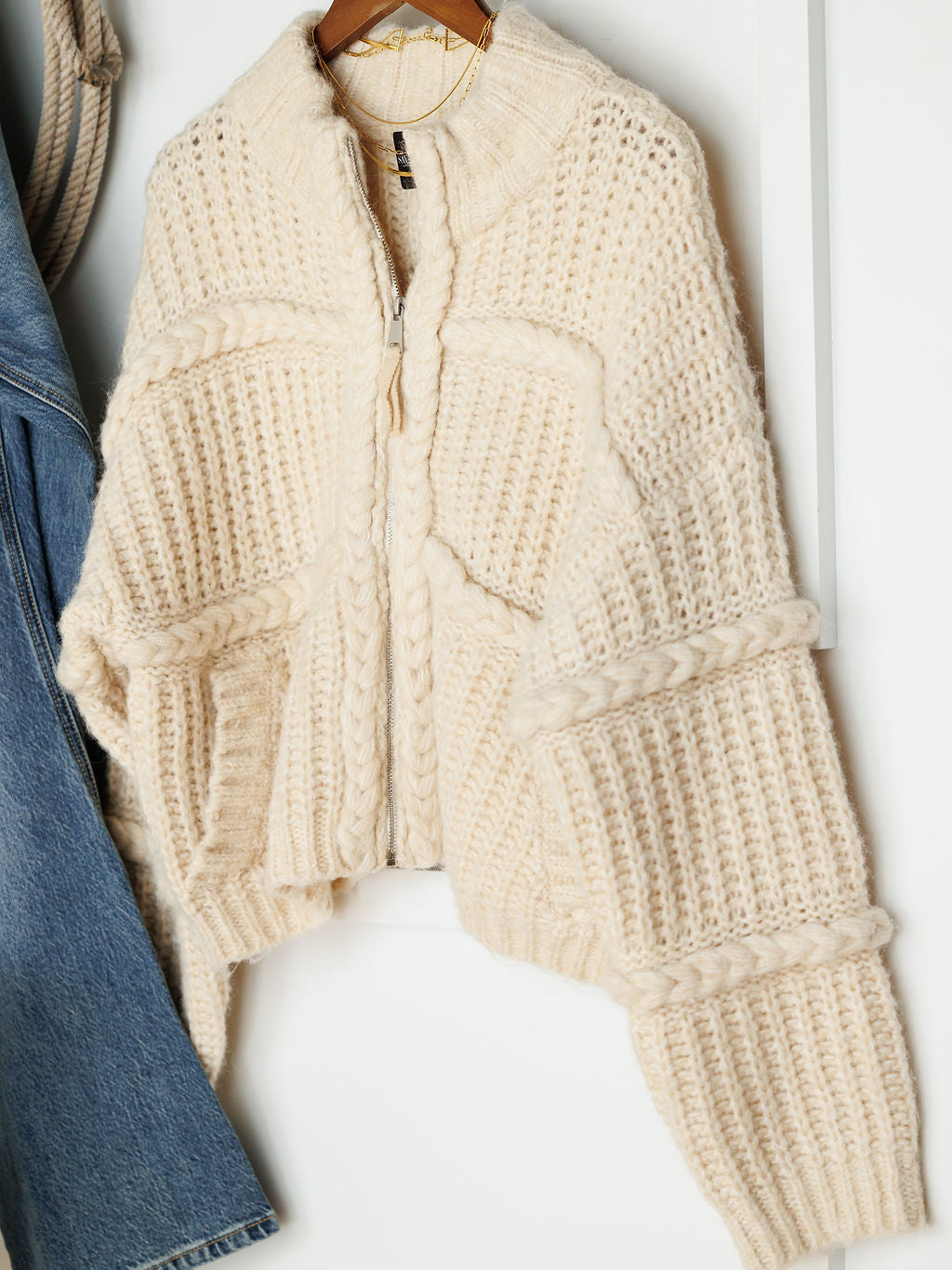 Cream knit full zip sweater jacket.