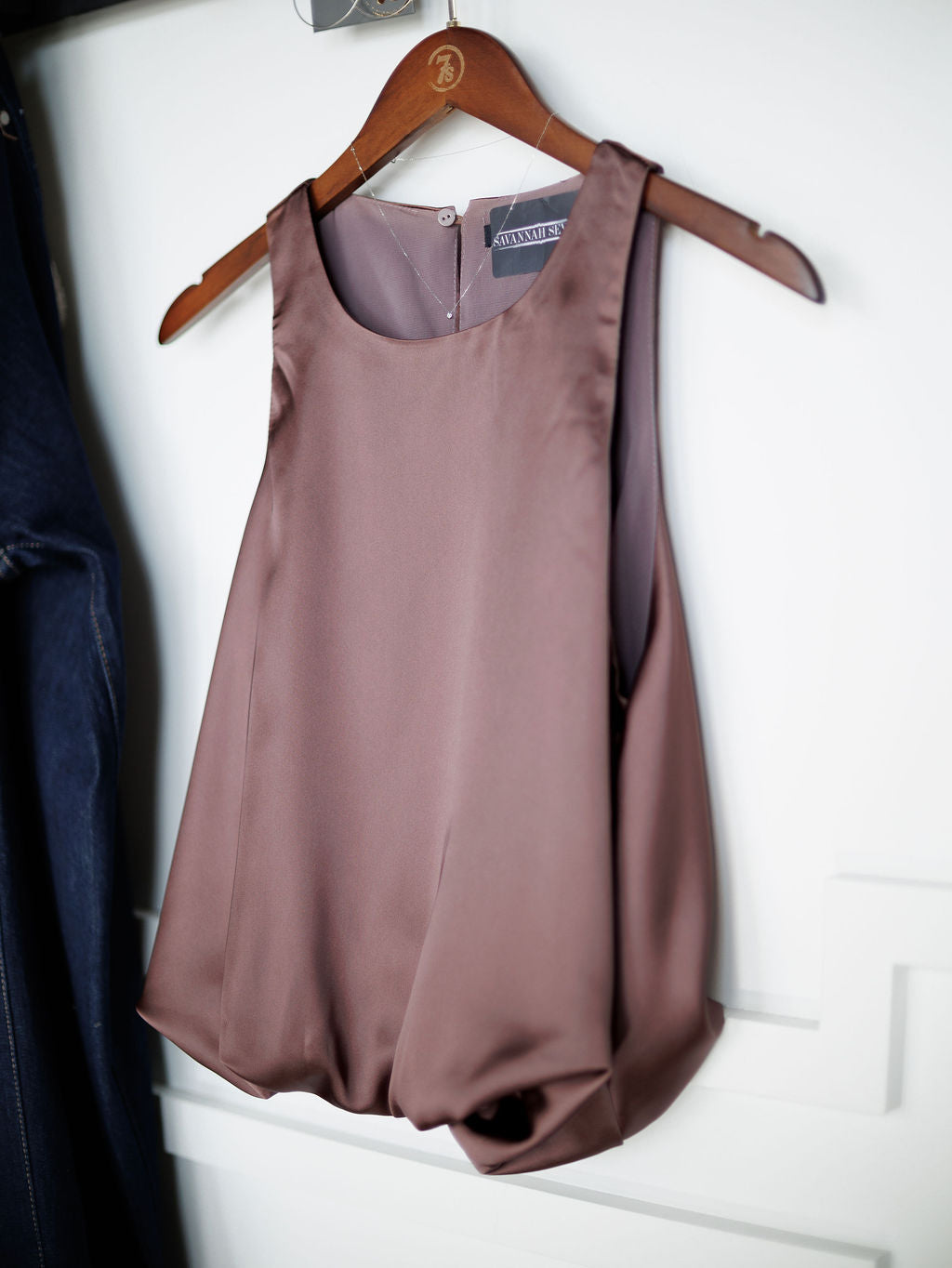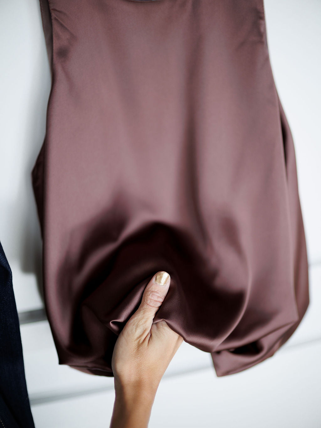 Deep mauve satin sleeveless top.
