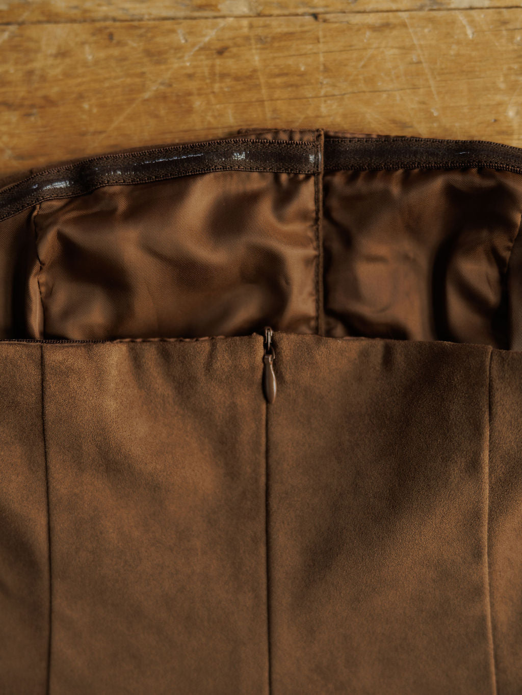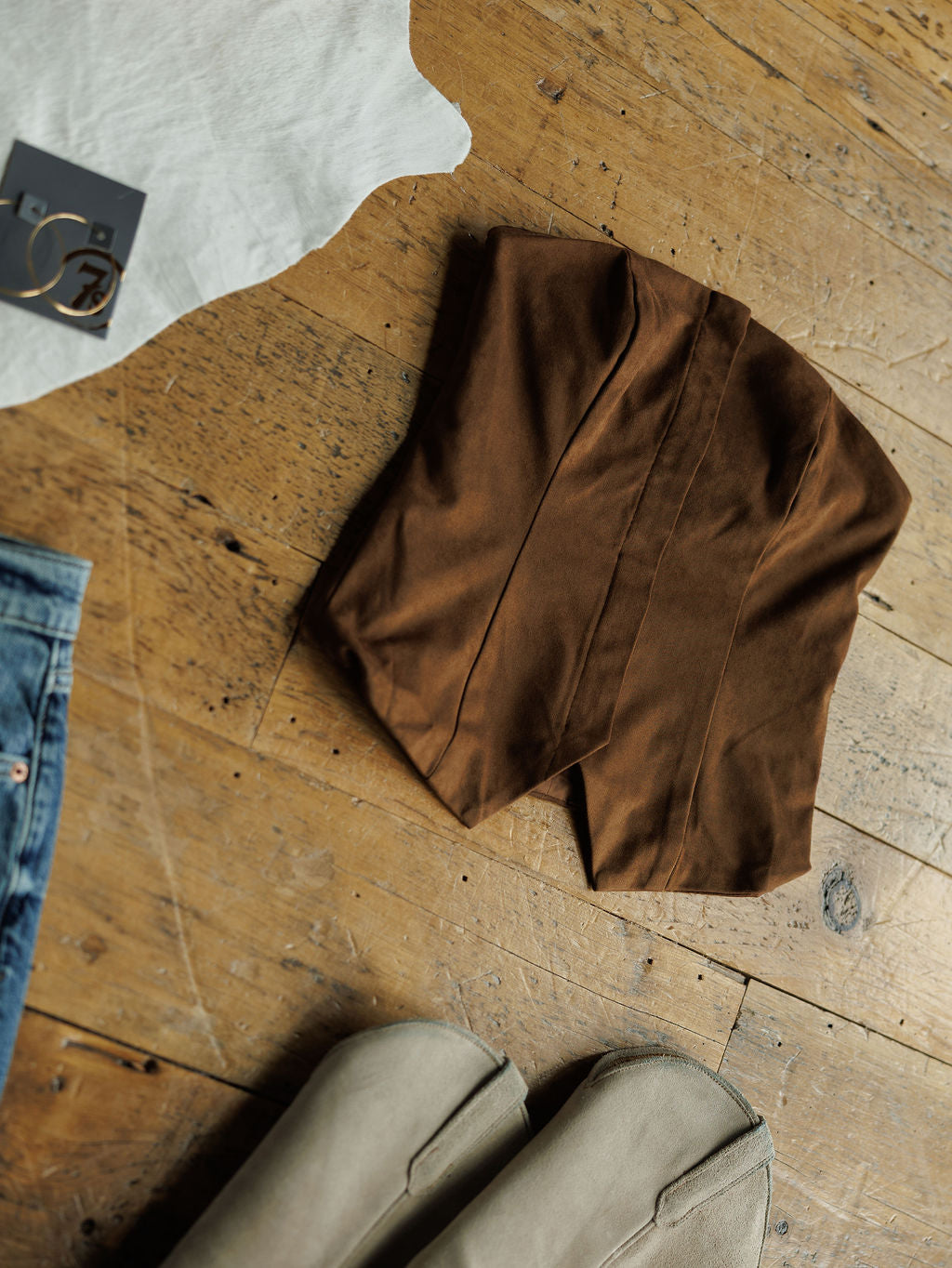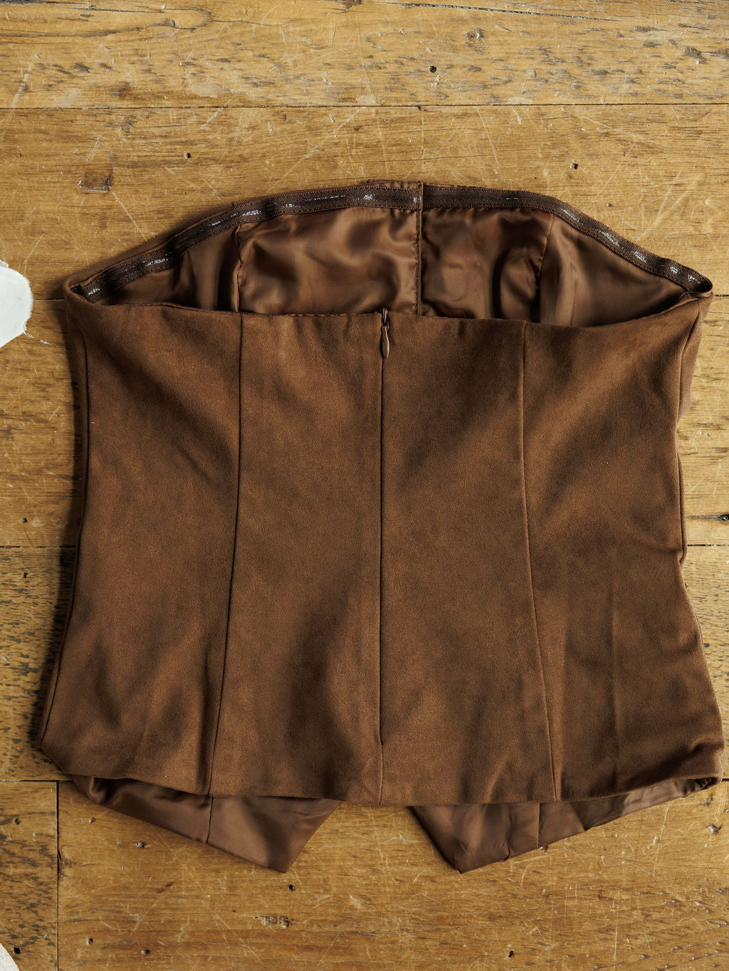 Chocolate faux suede strapless crop top.