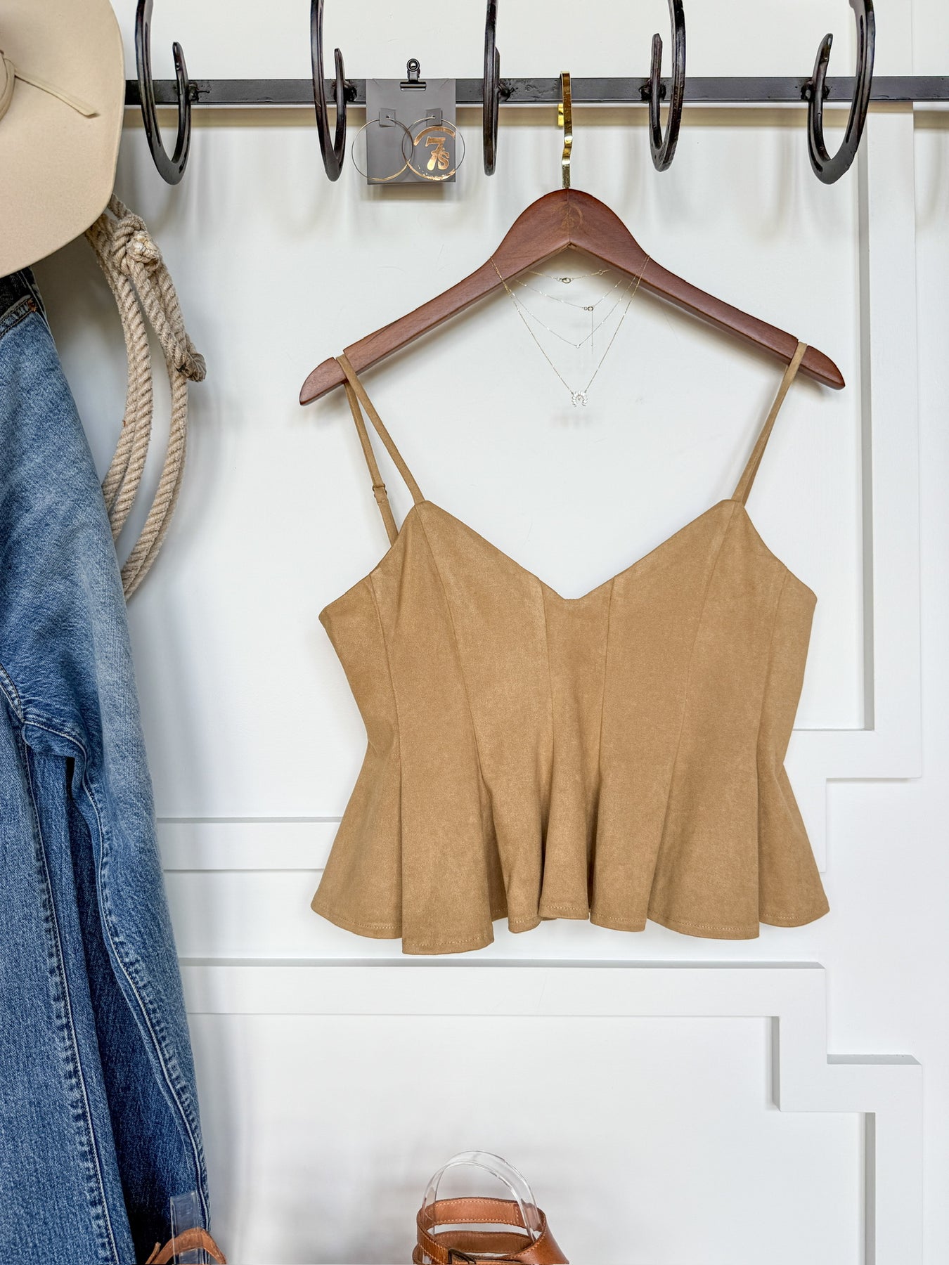 Tan faux suede sleeveless top.
