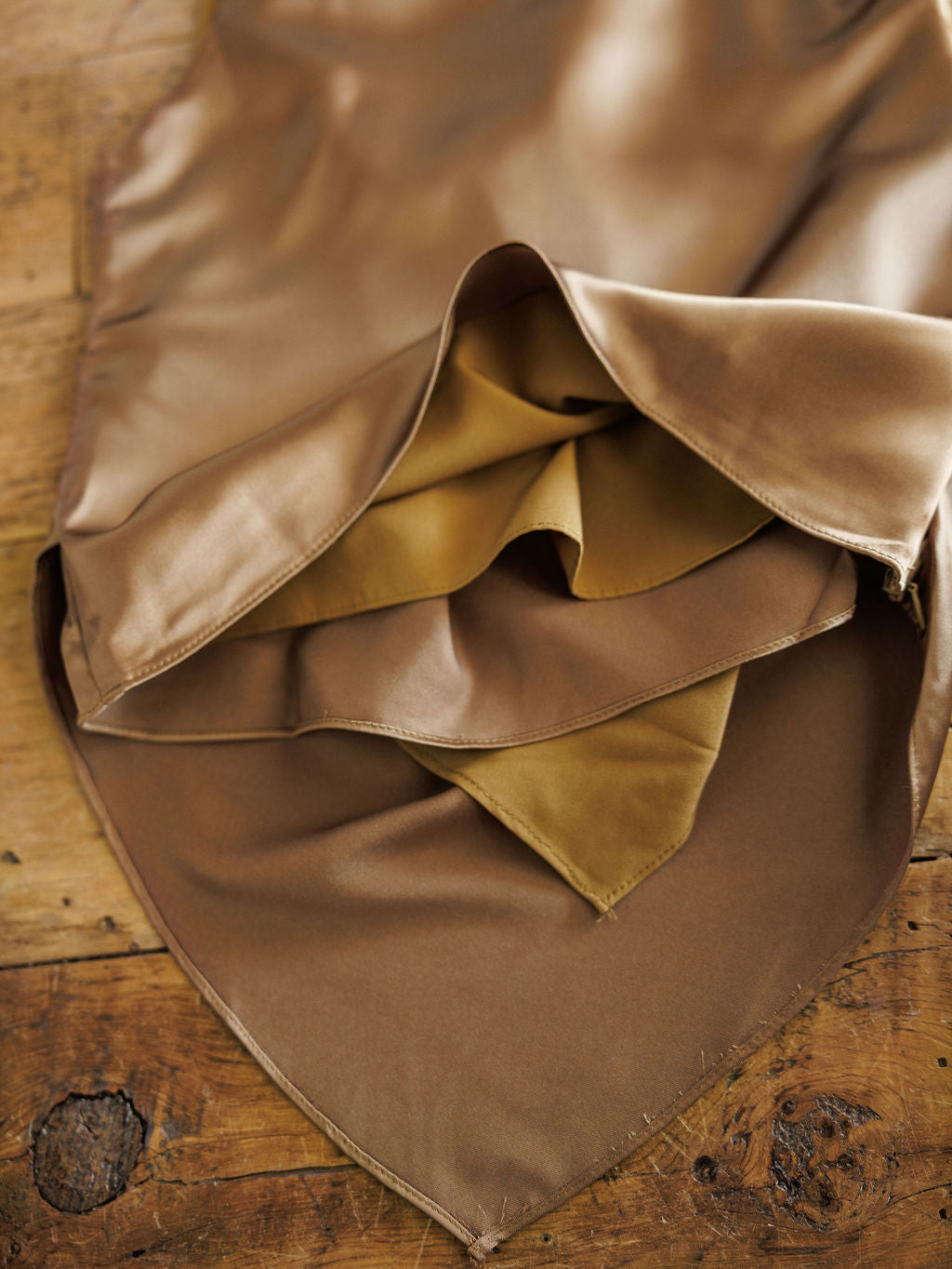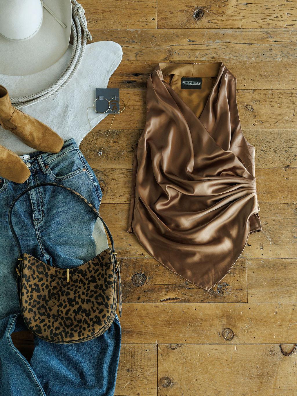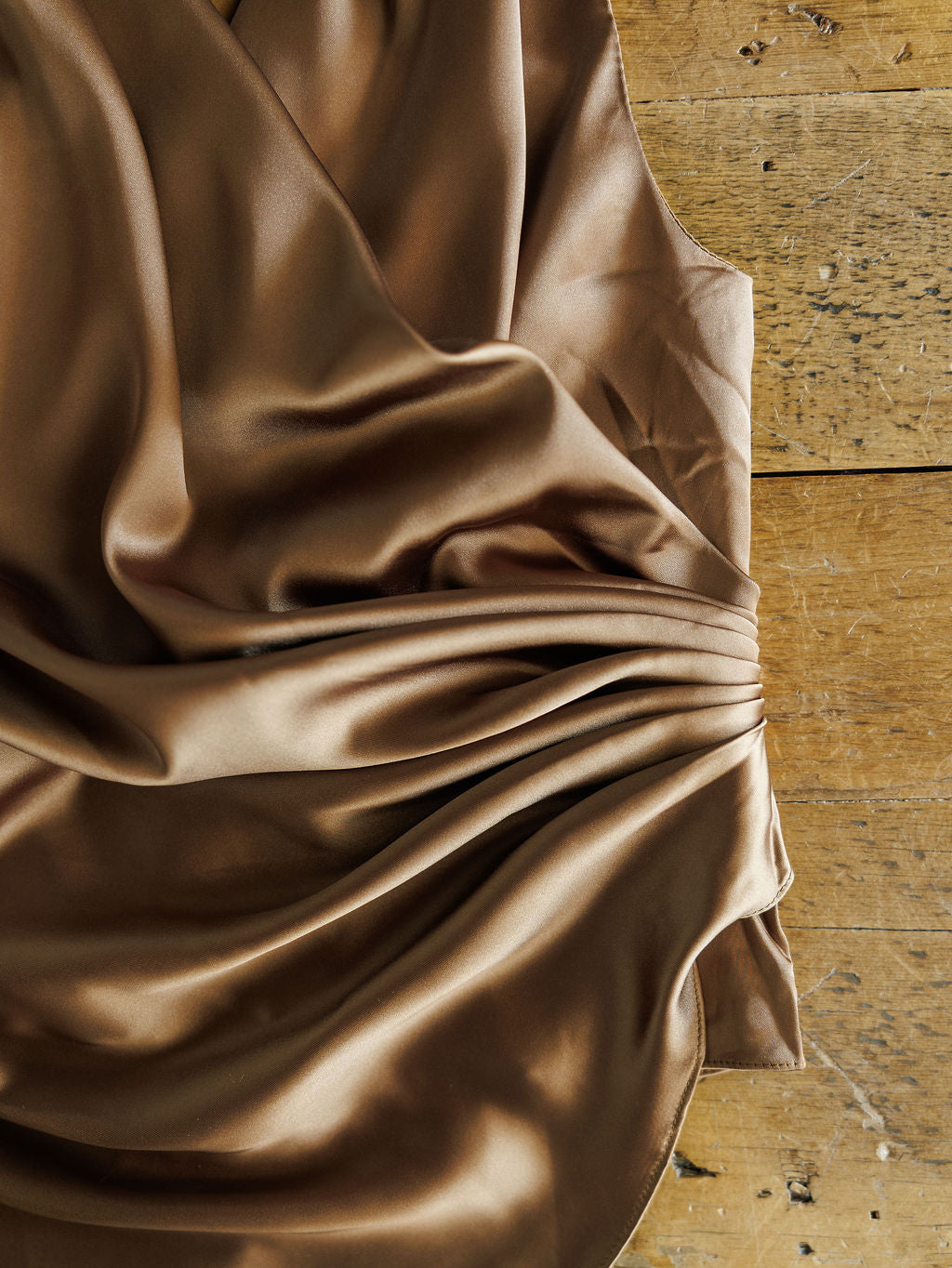 Caramel satin sleeveless top.