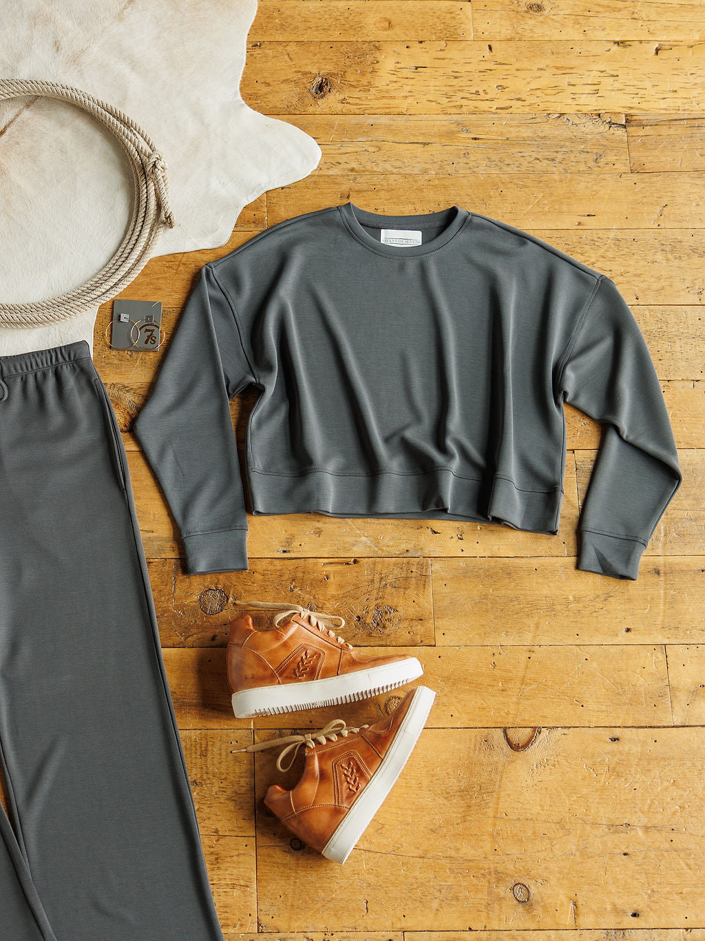 Charcoal modal long sleeve pullover and high waisted pants set.