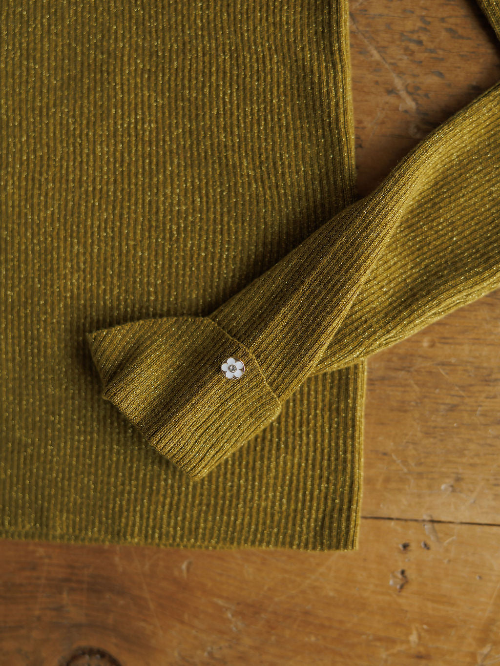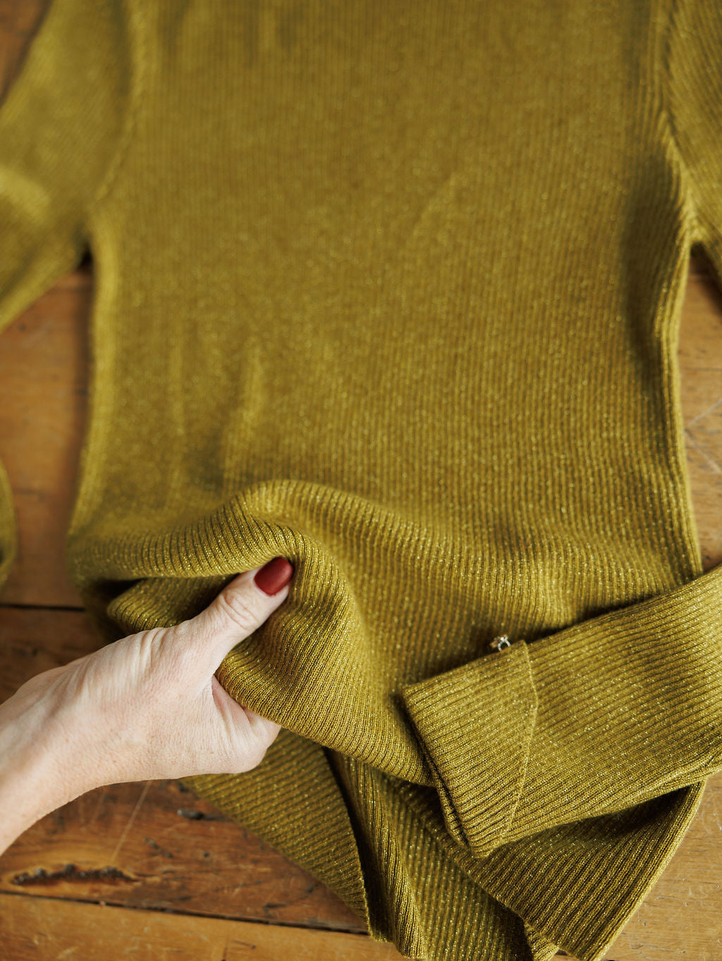 Chartreuse olive metallic long sleeve top.