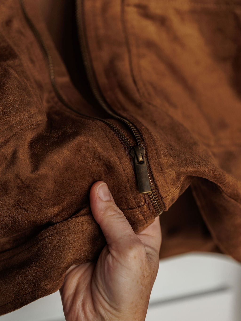 Hazelnut chocolate faux suede jacket.