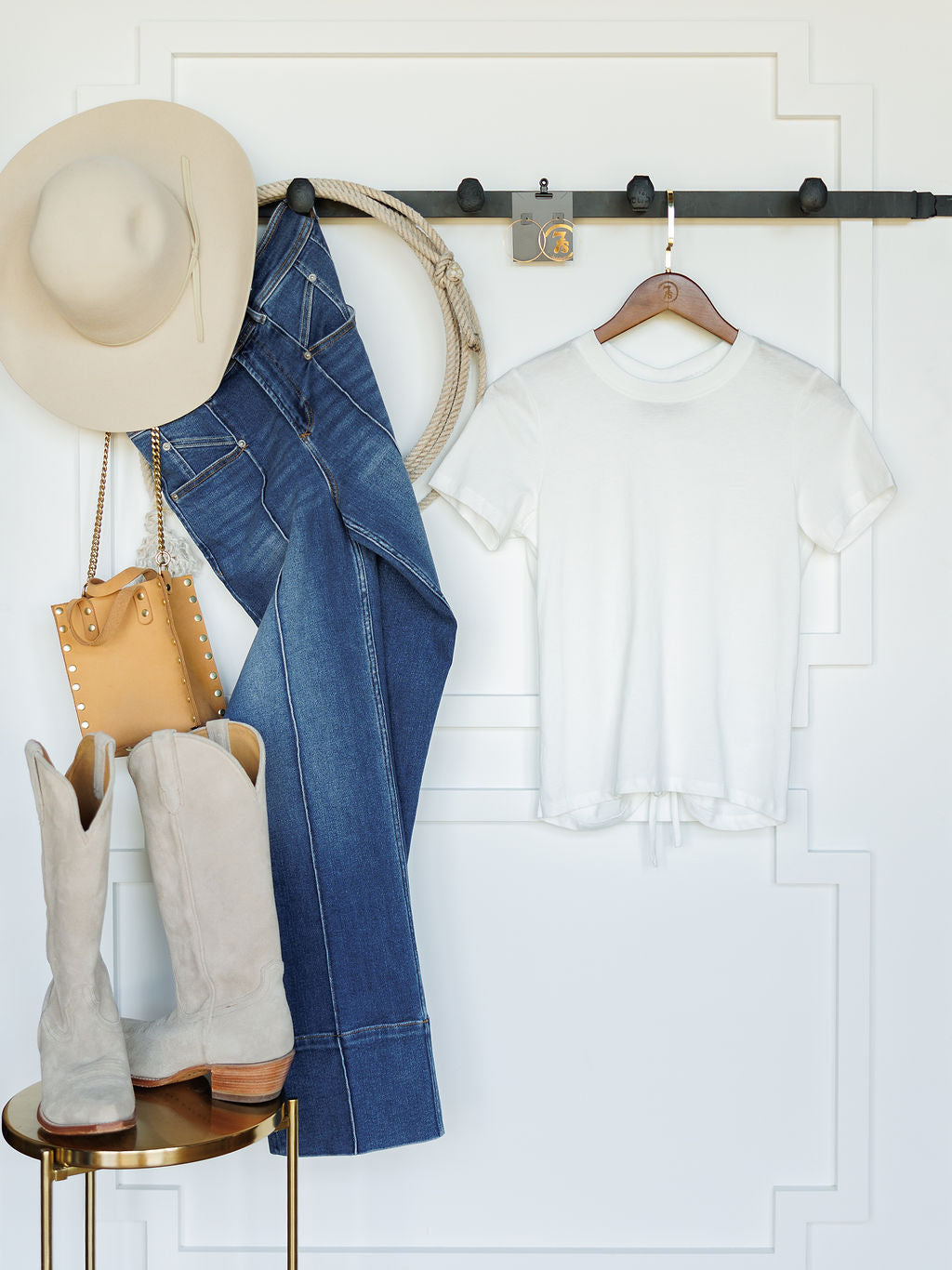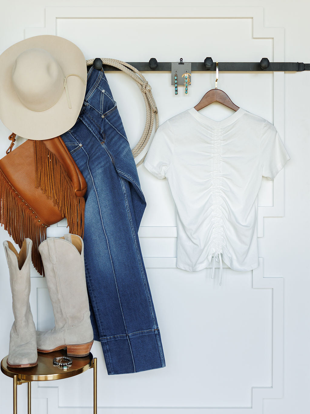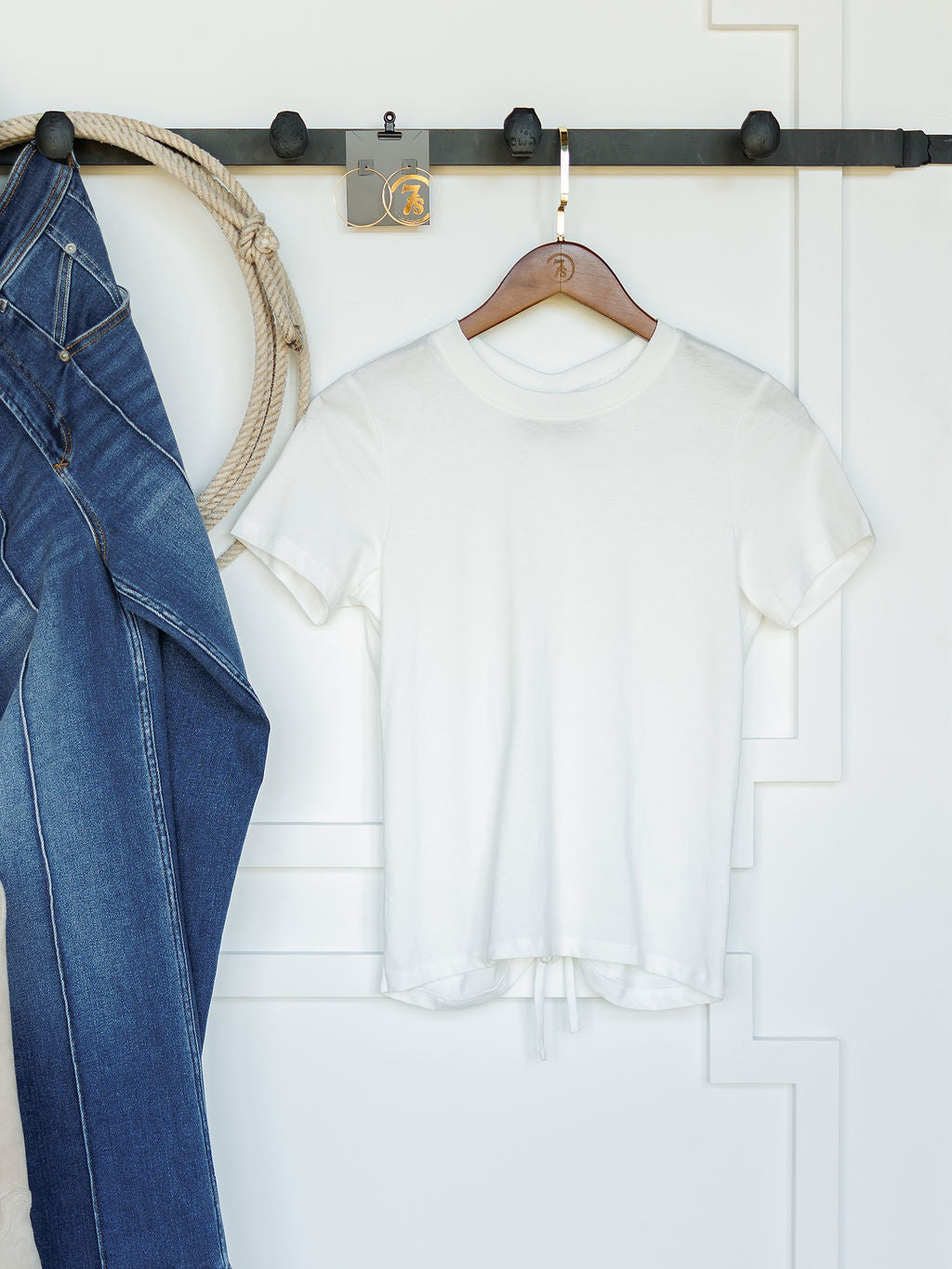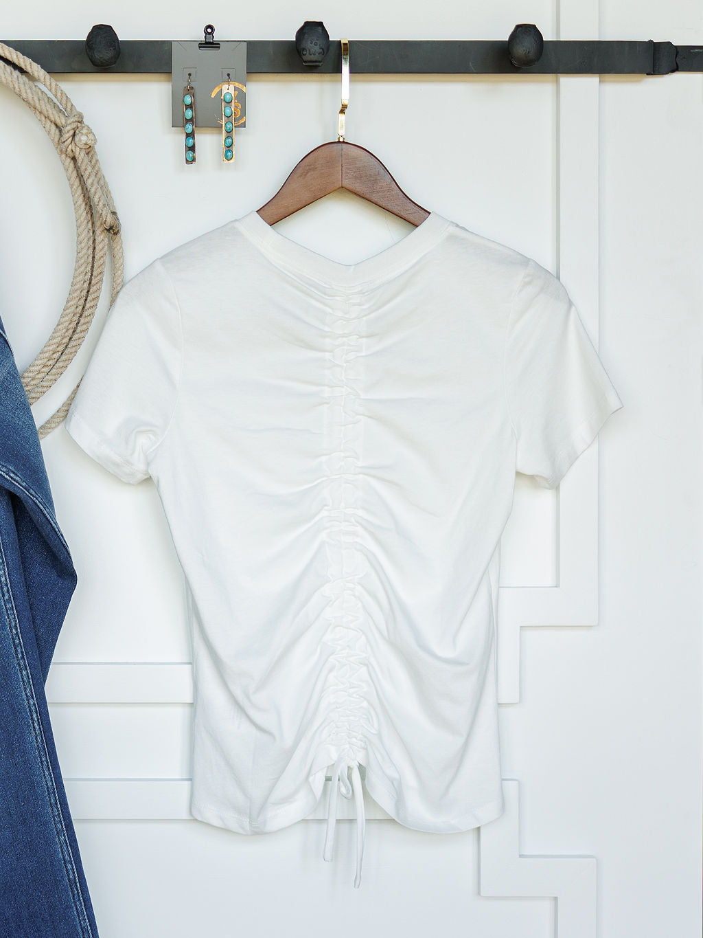 Adjustable ruched cinch back detail; can be made into crop fit.