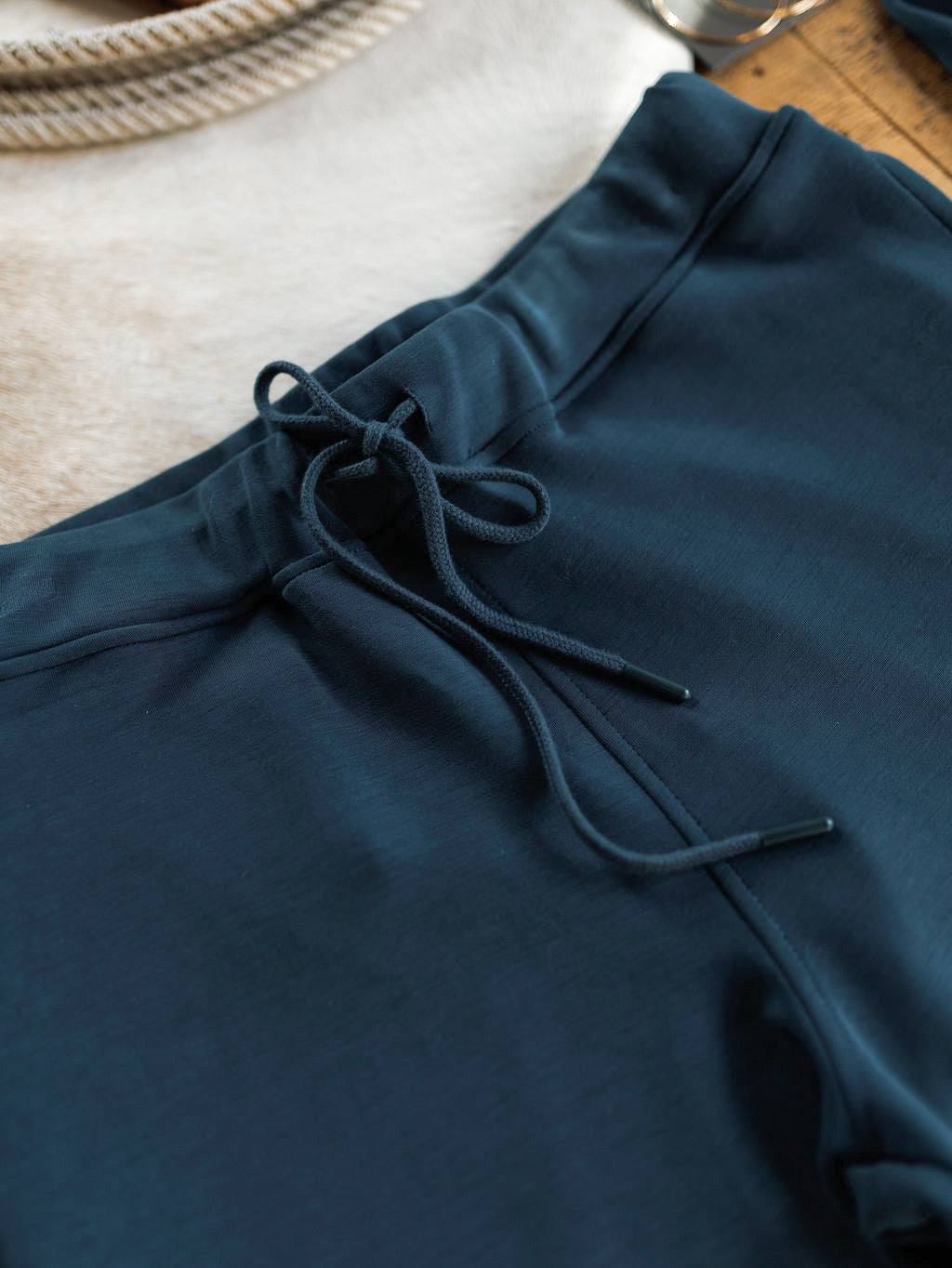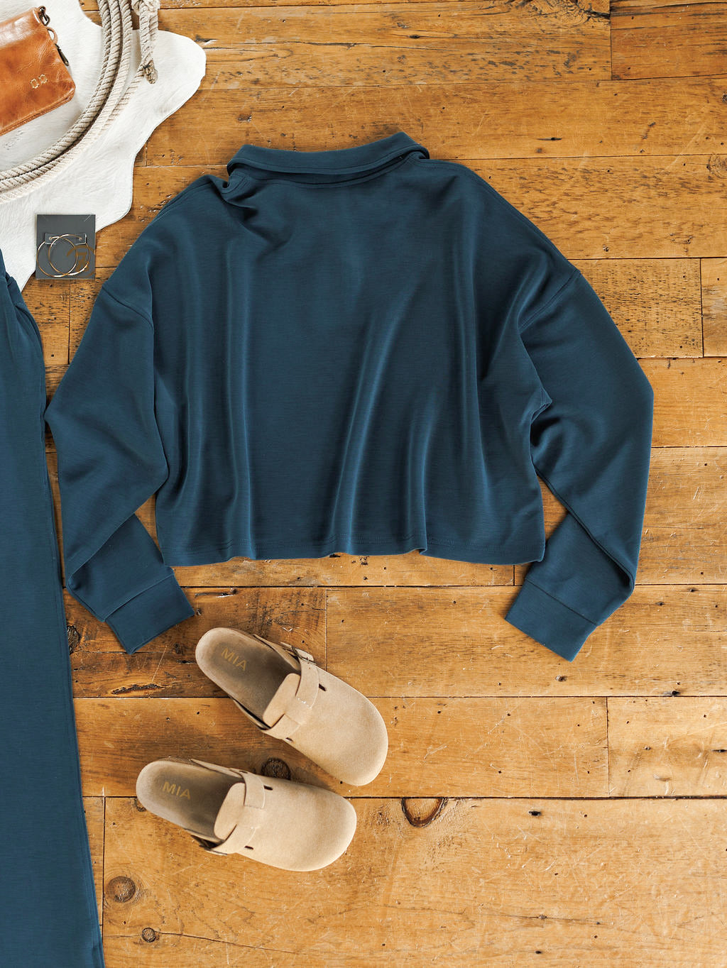 Dark blue teal long sleeve quarter button top and high waisted pants activewear set.