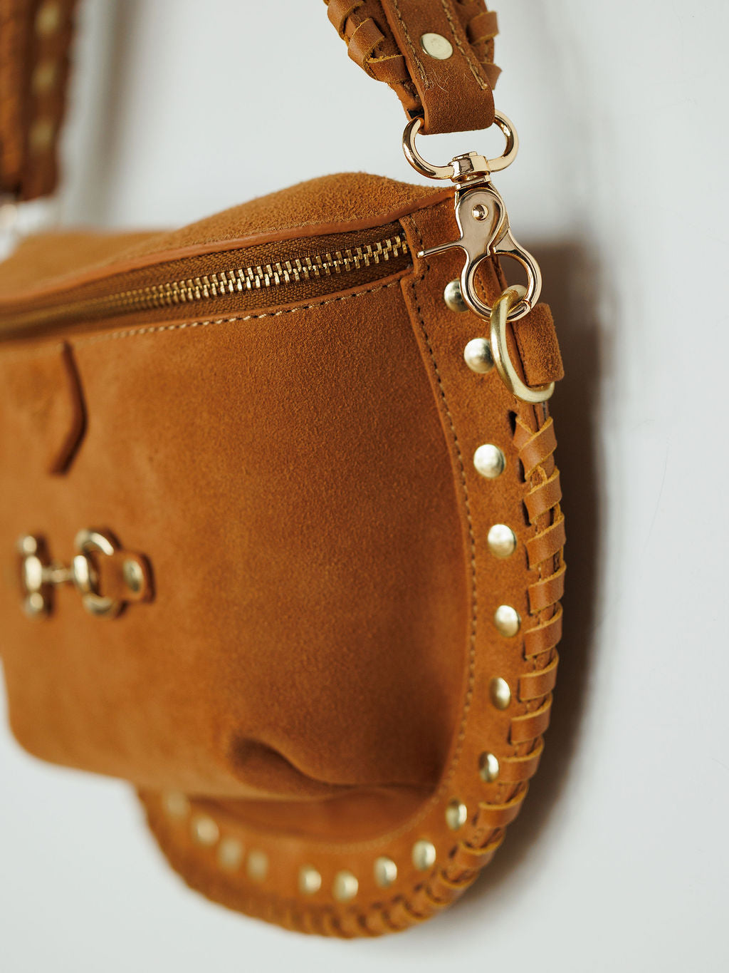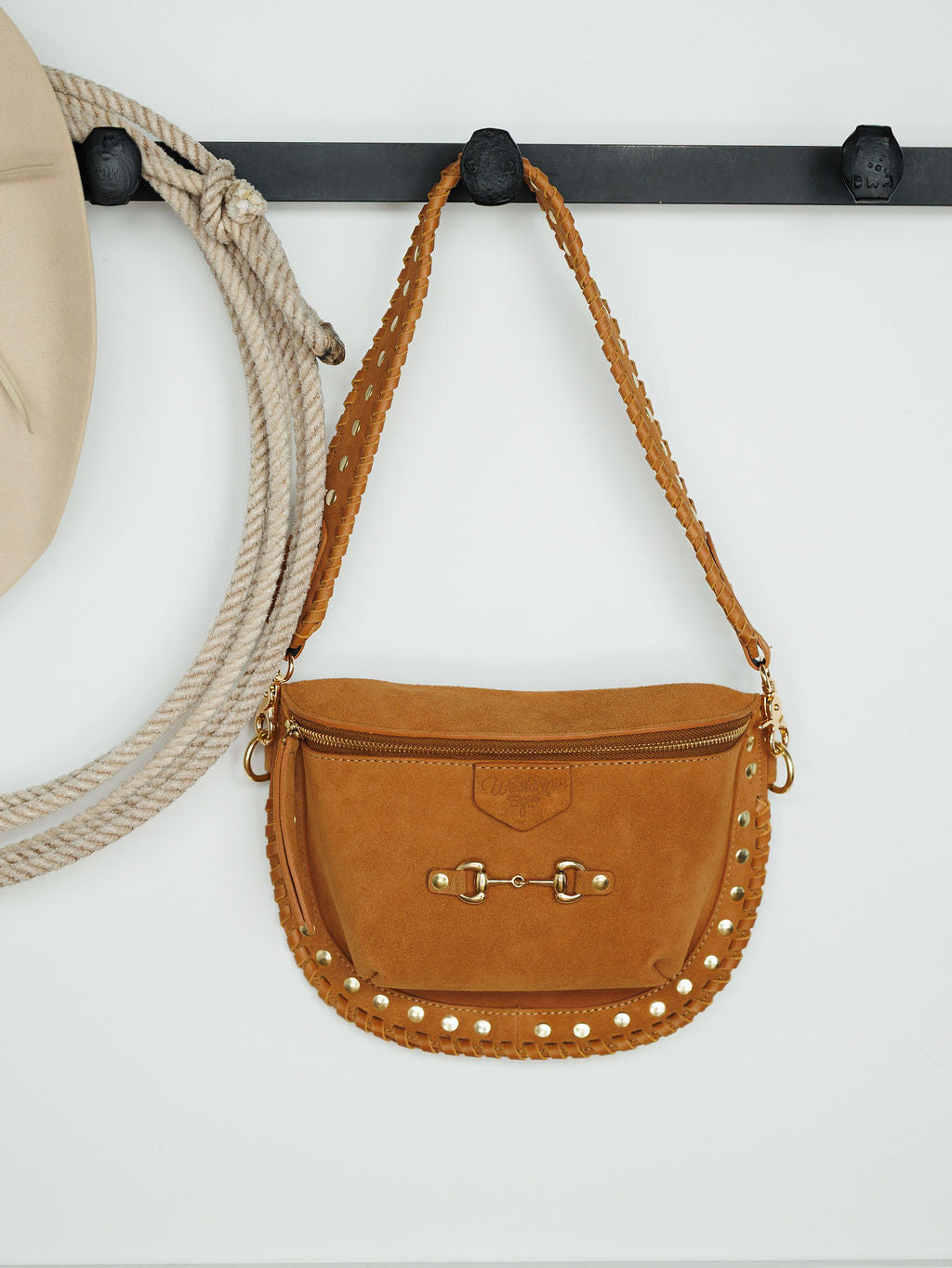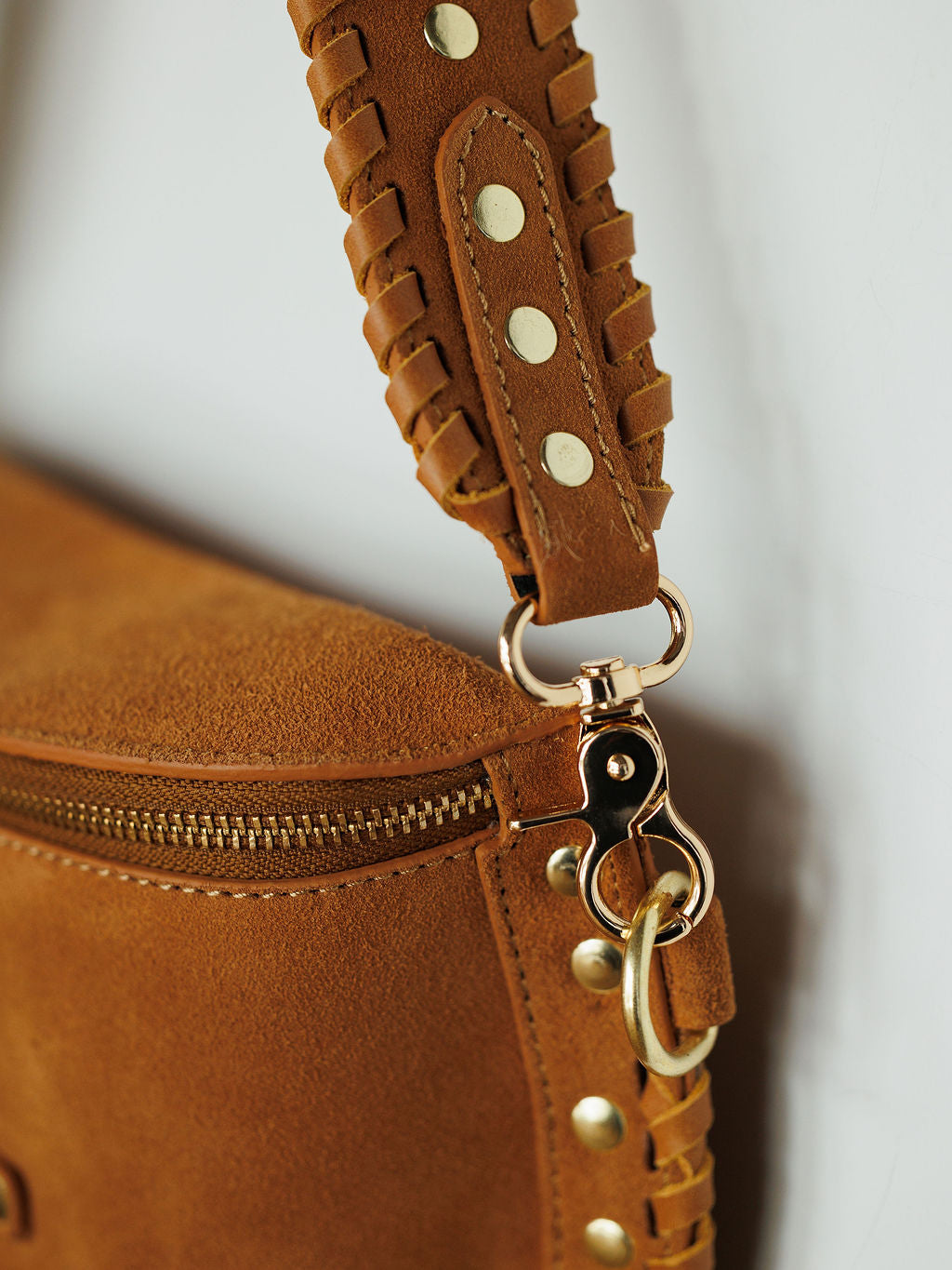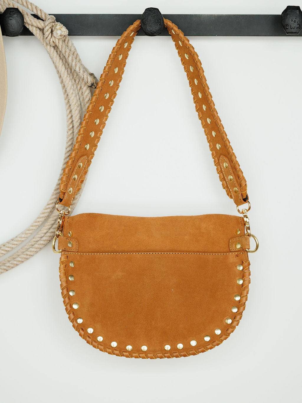 2 detachable straps included; one is rough out leather shoulder strap with whip stitch and stud detail, the other is an adjustable durable fabric crossbody strap with leather trim and stud detail.