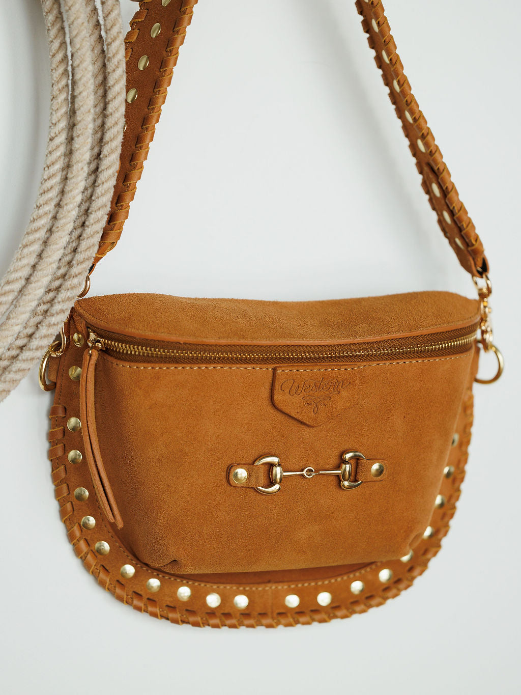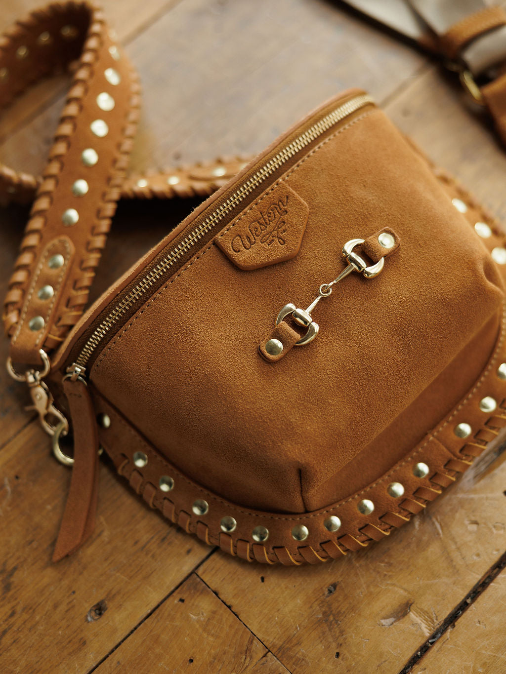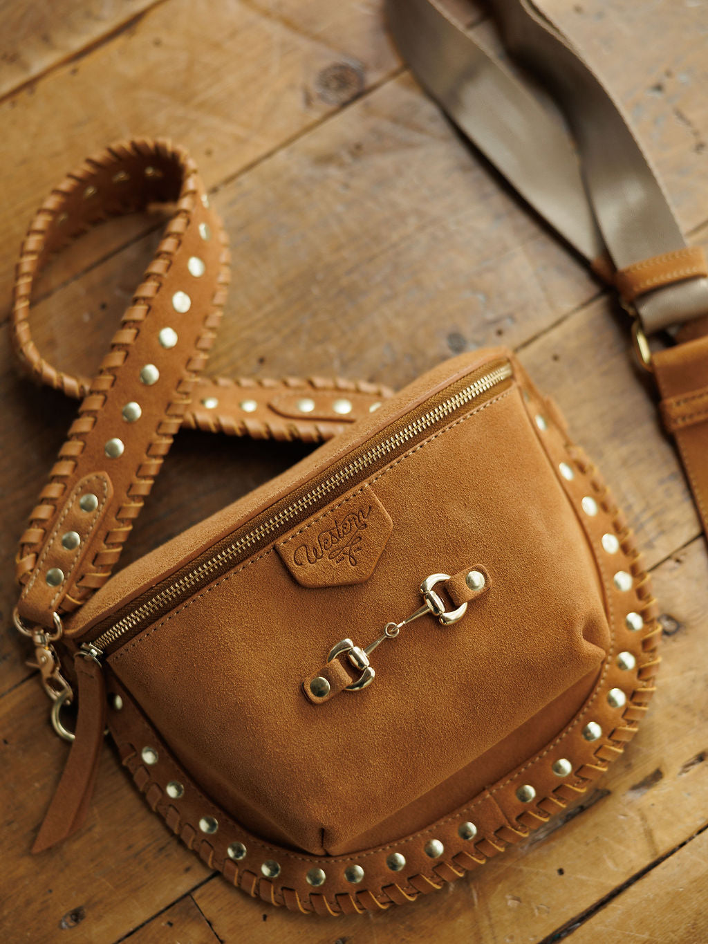 2 detachable straps included; one is rough out leather shoulder strap with whip stitch and stud detail, the other is an adjustable durable fabric crossbody strap with leather trim and stud detail.