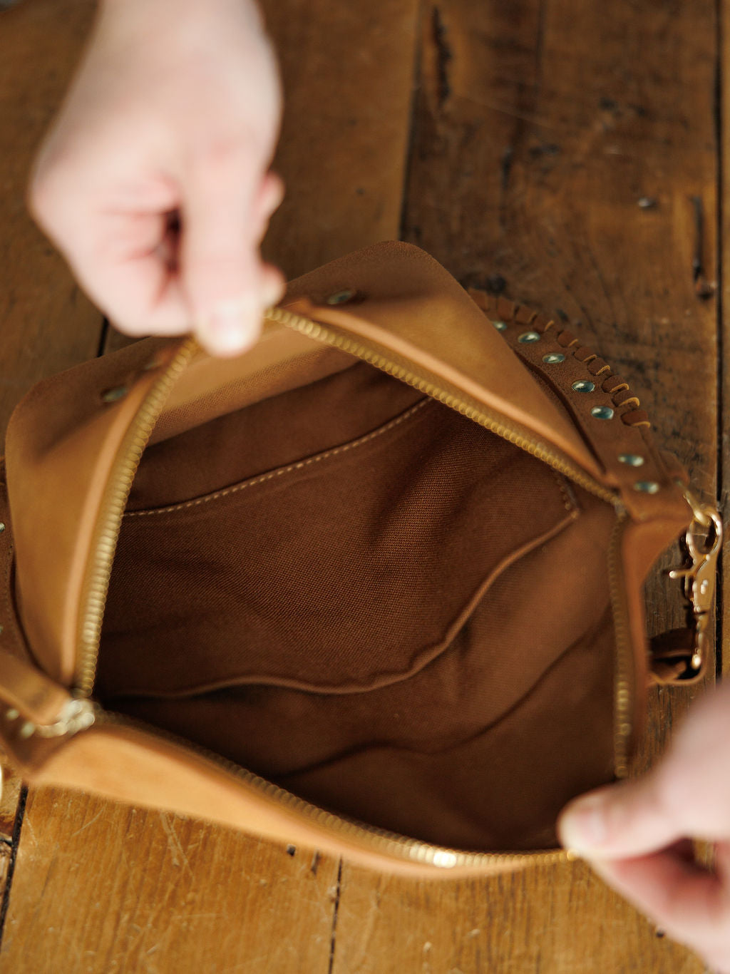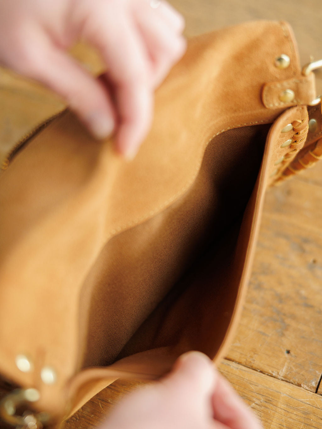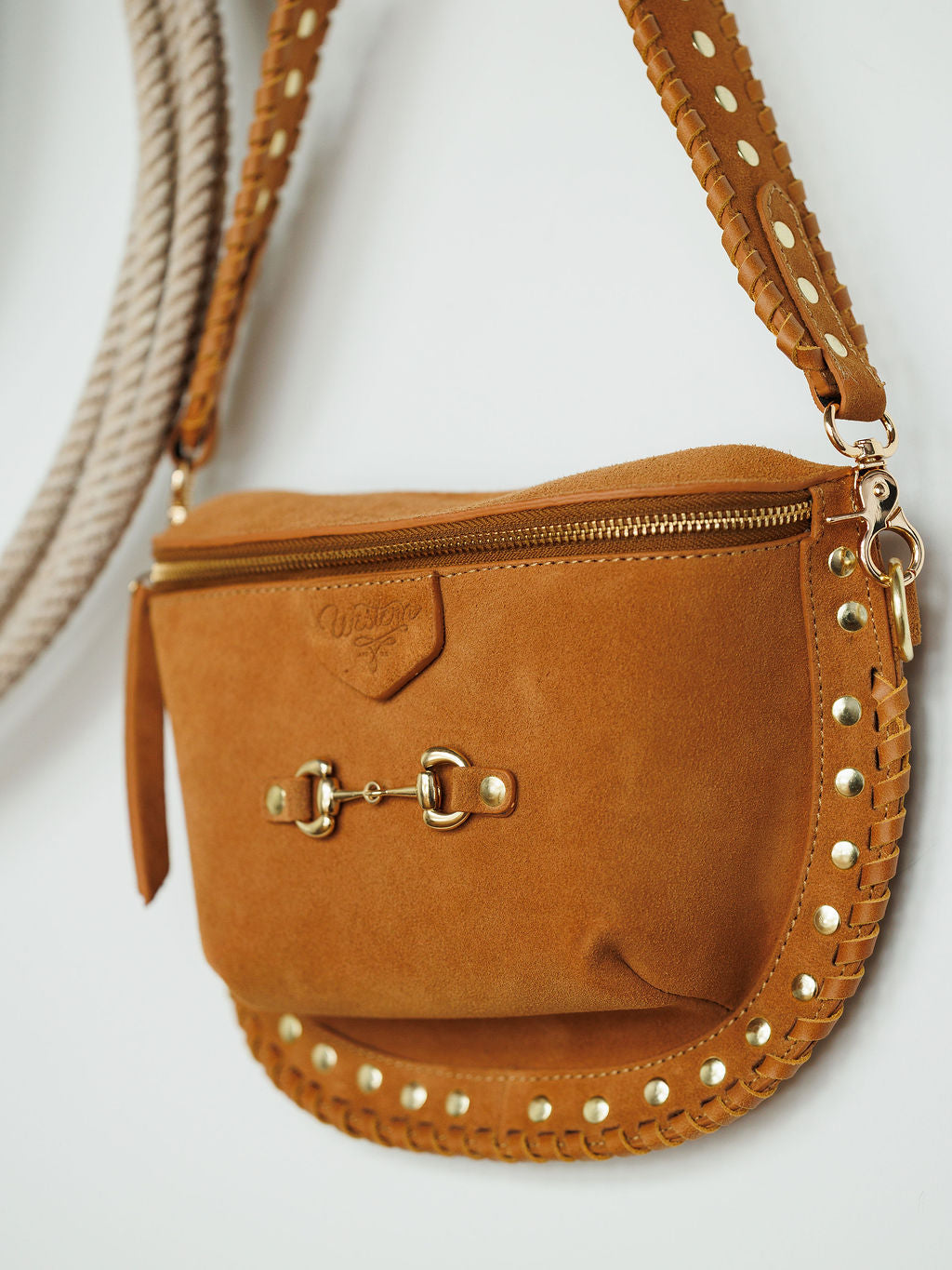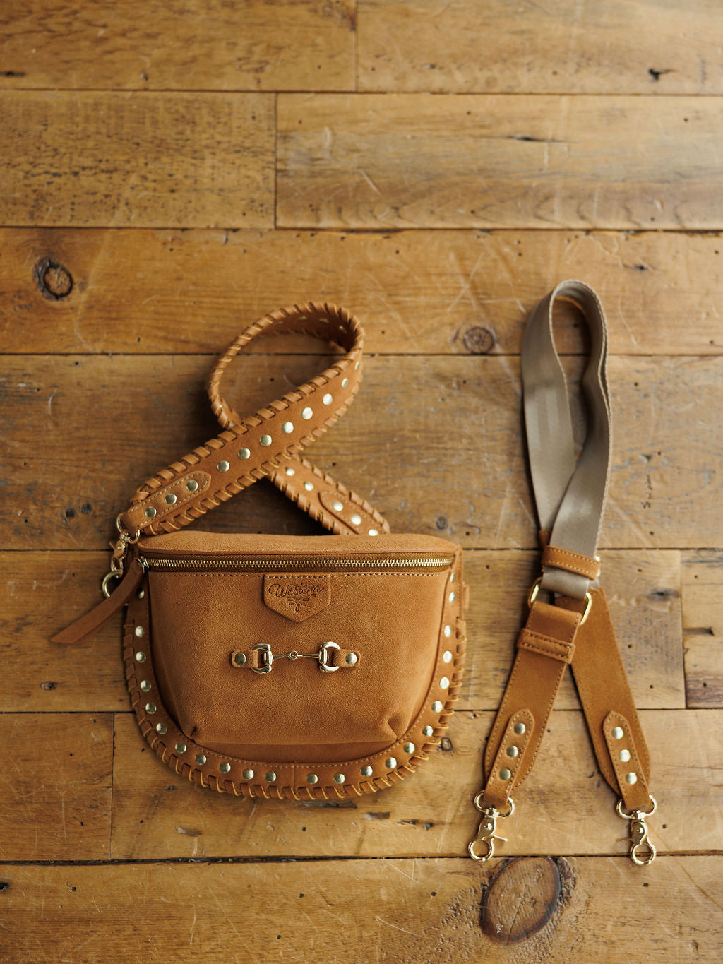2 detachable straps included; one is rough out leather shoulder strap with whip stitch and stud detail, the other is an adjustable durable fabric crossbody strap with leather trim and stud detail.