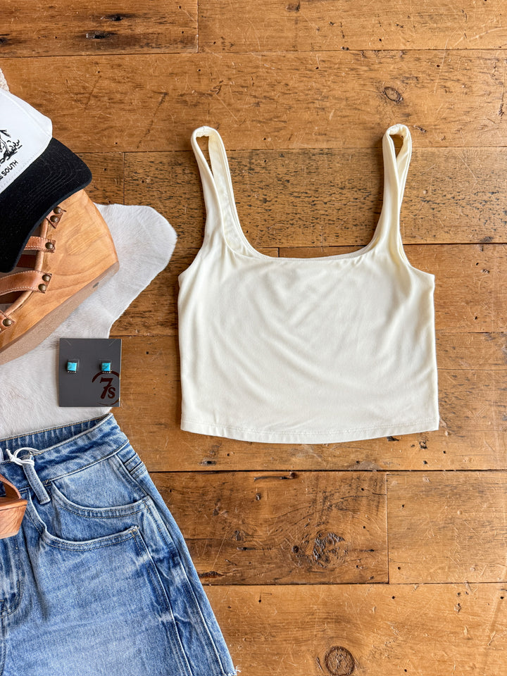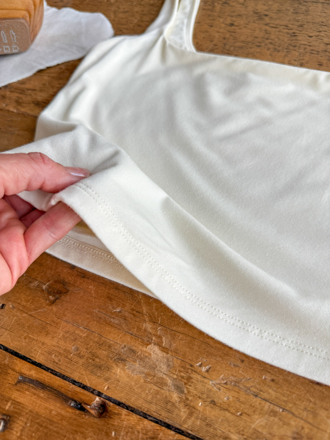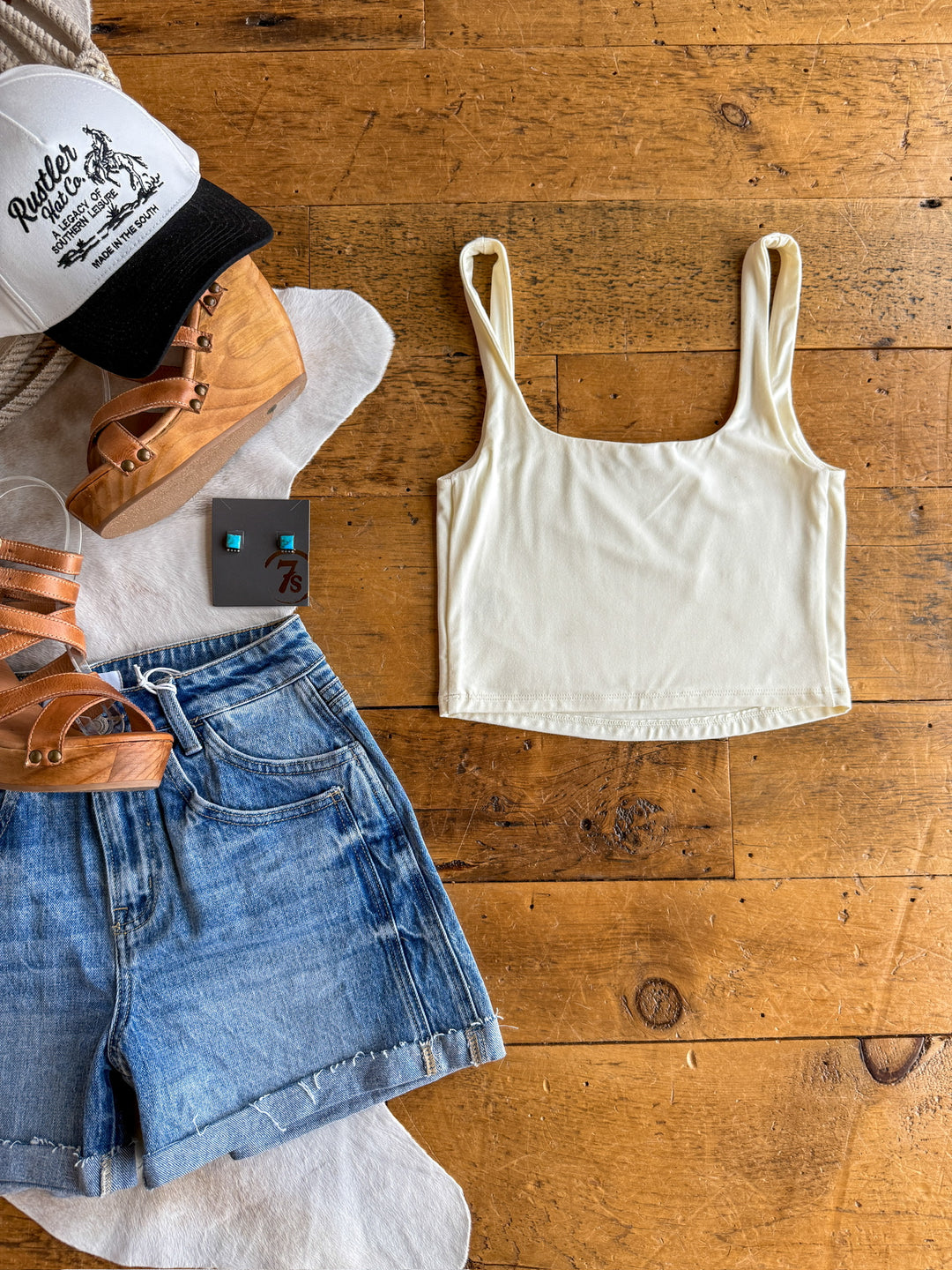 Hits at the true waist; shows little skin if worn with high rise denim.