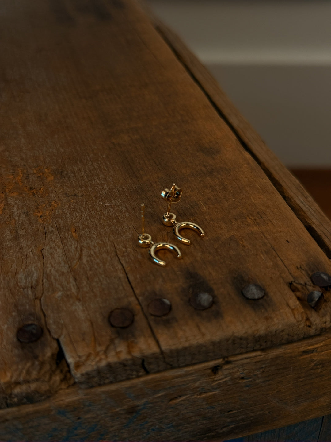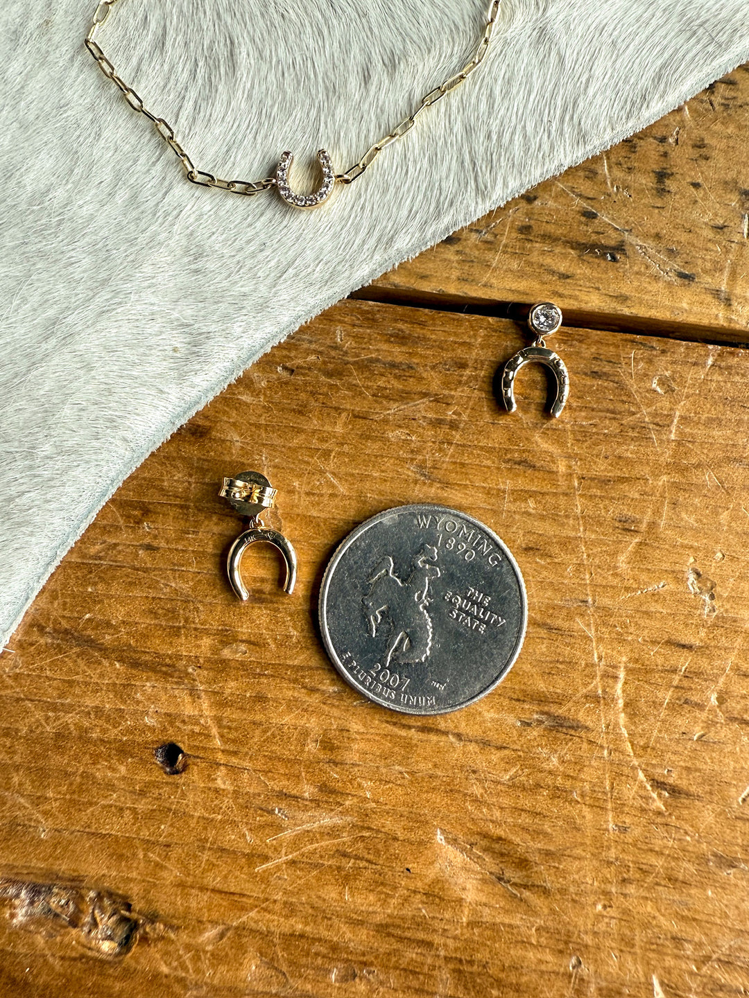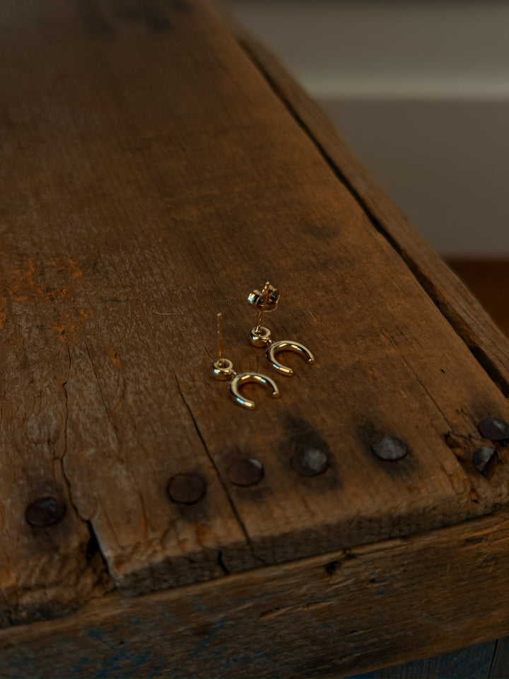 14K yellow gold diamond horseshoe drop earrings.