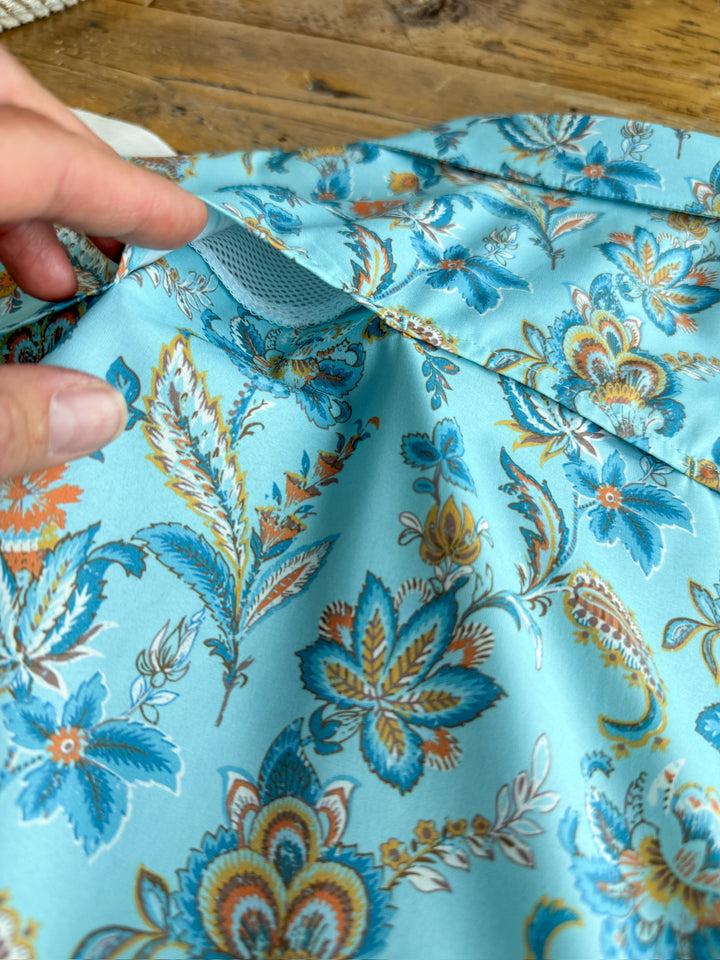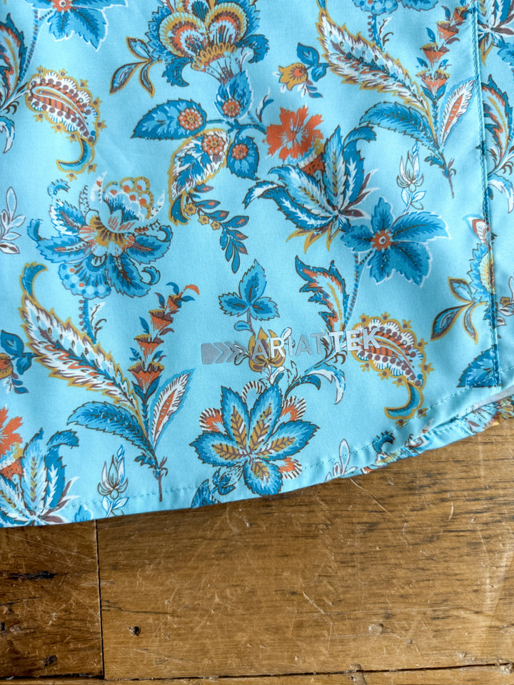 Aqua with teal, and orange floral paisley.