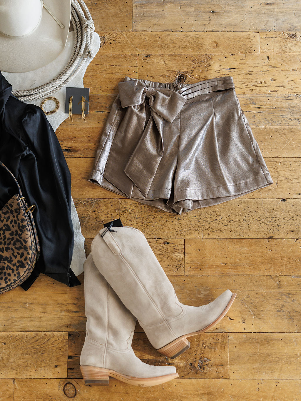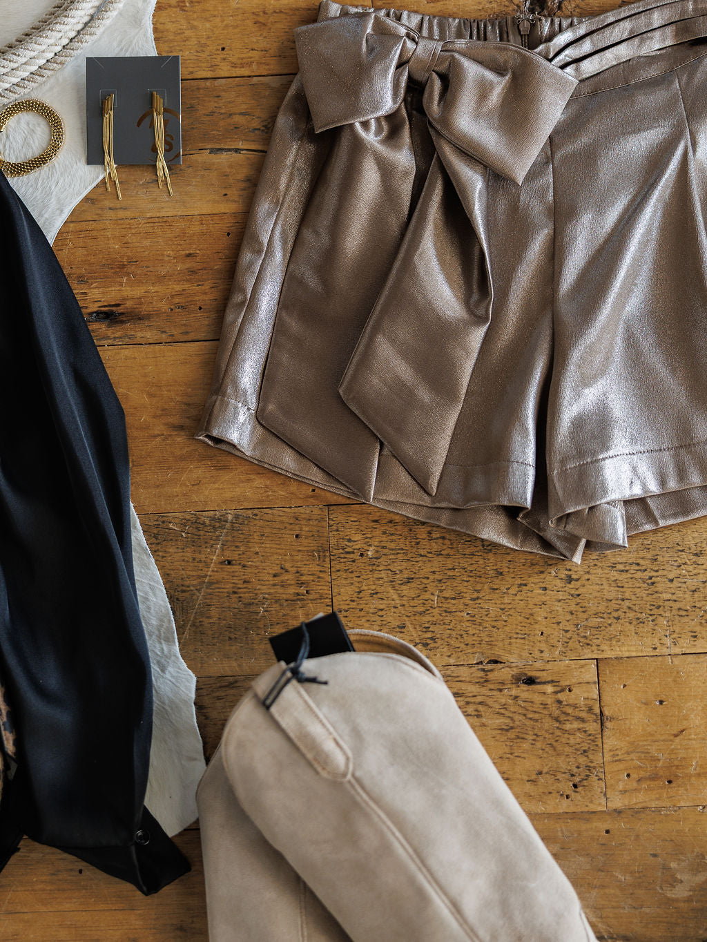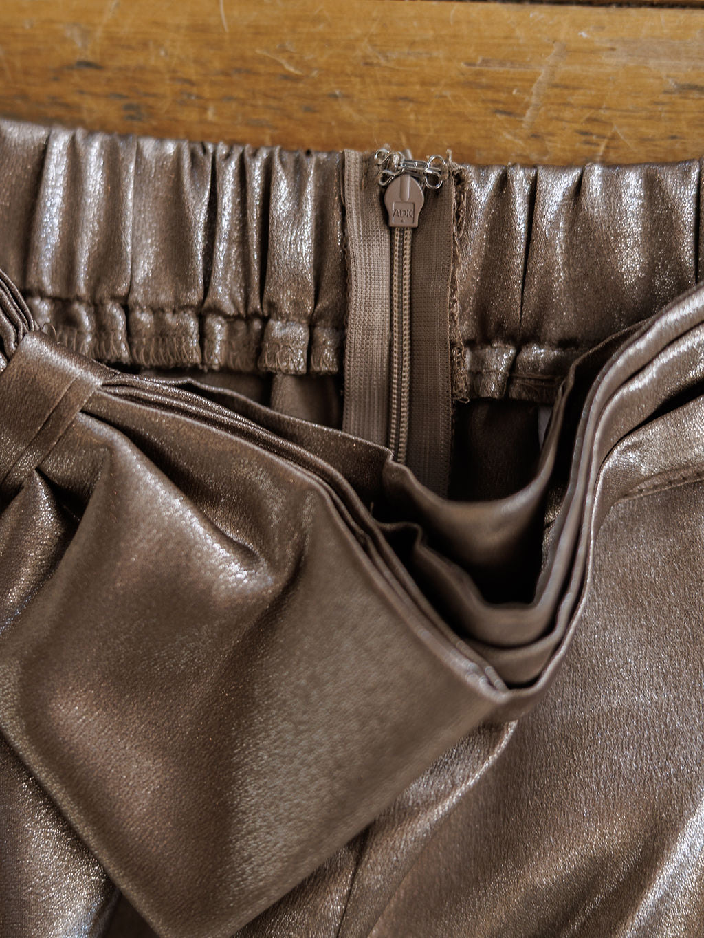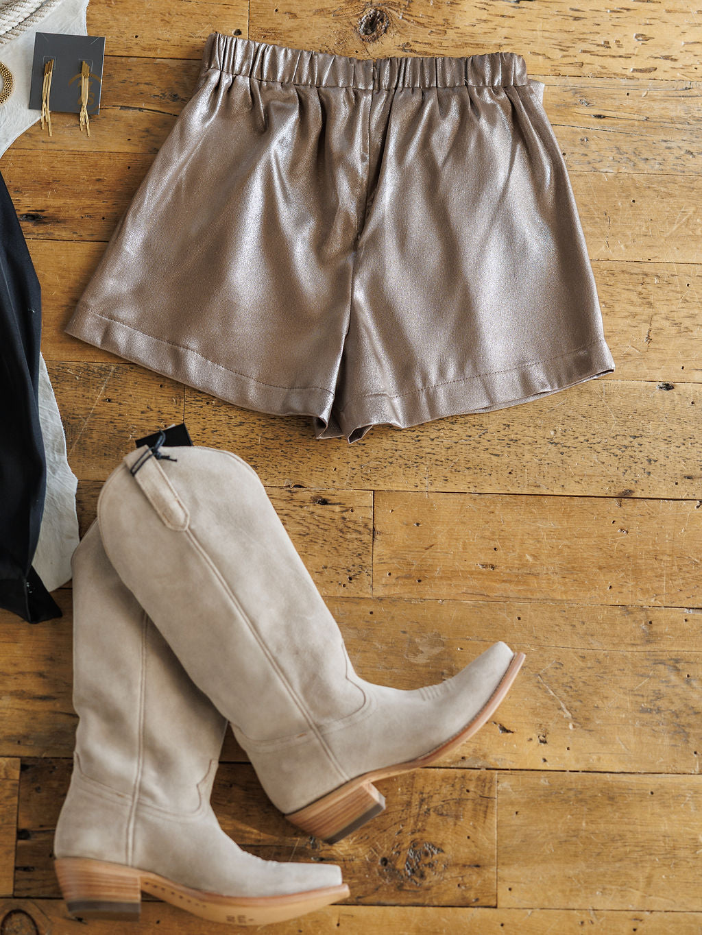 Champagne soft textured satin fabric with woven silver metallic detail.