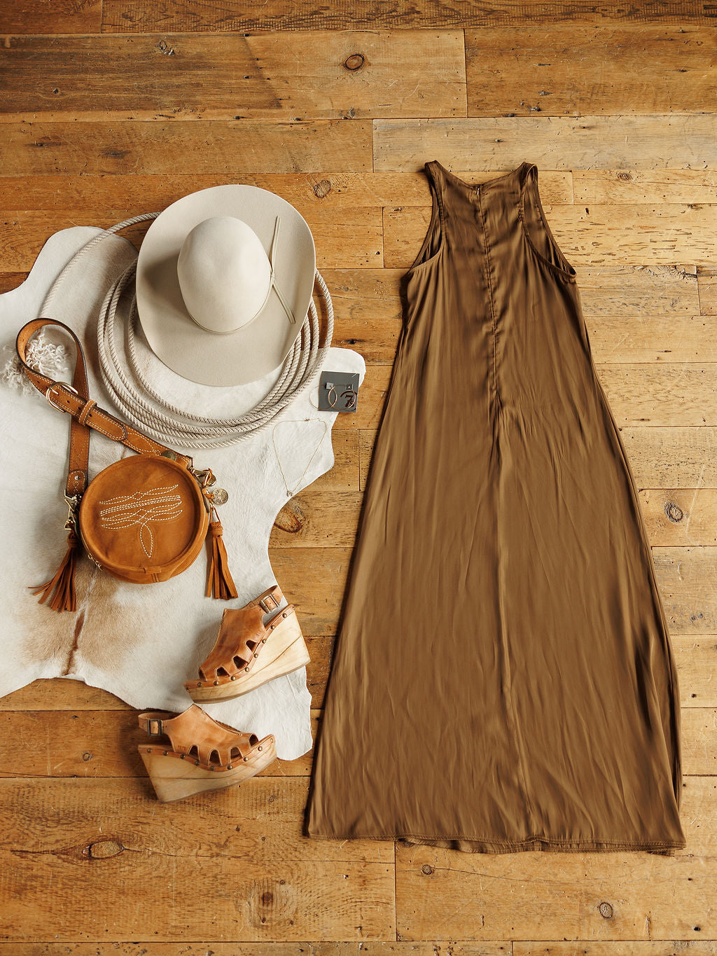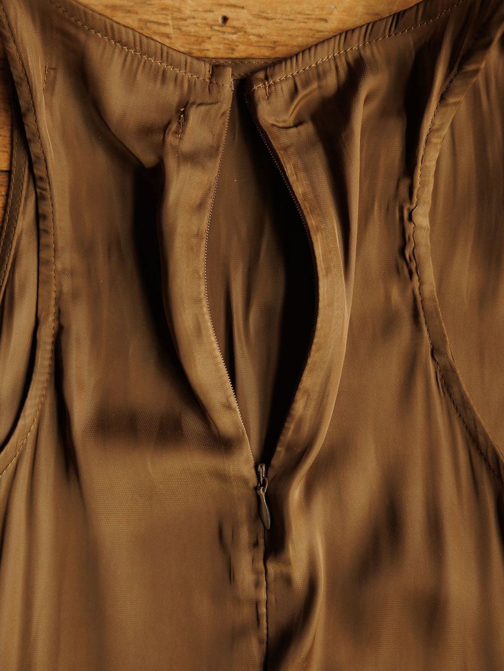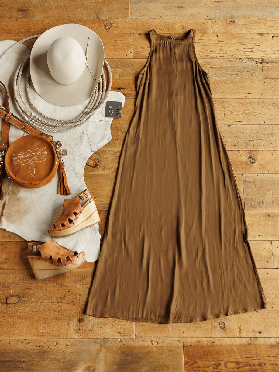 Fitted through the bodice becoming more relaxed from the upper thigh down.