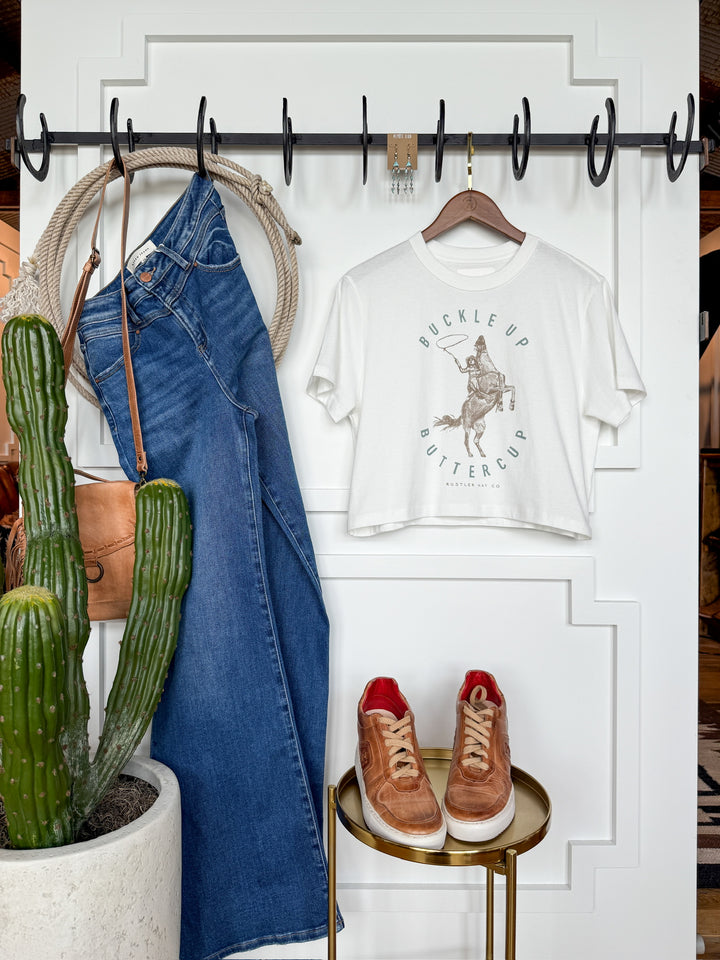 Longer crop fit, shows little to no skin if worn with high rise denim.
