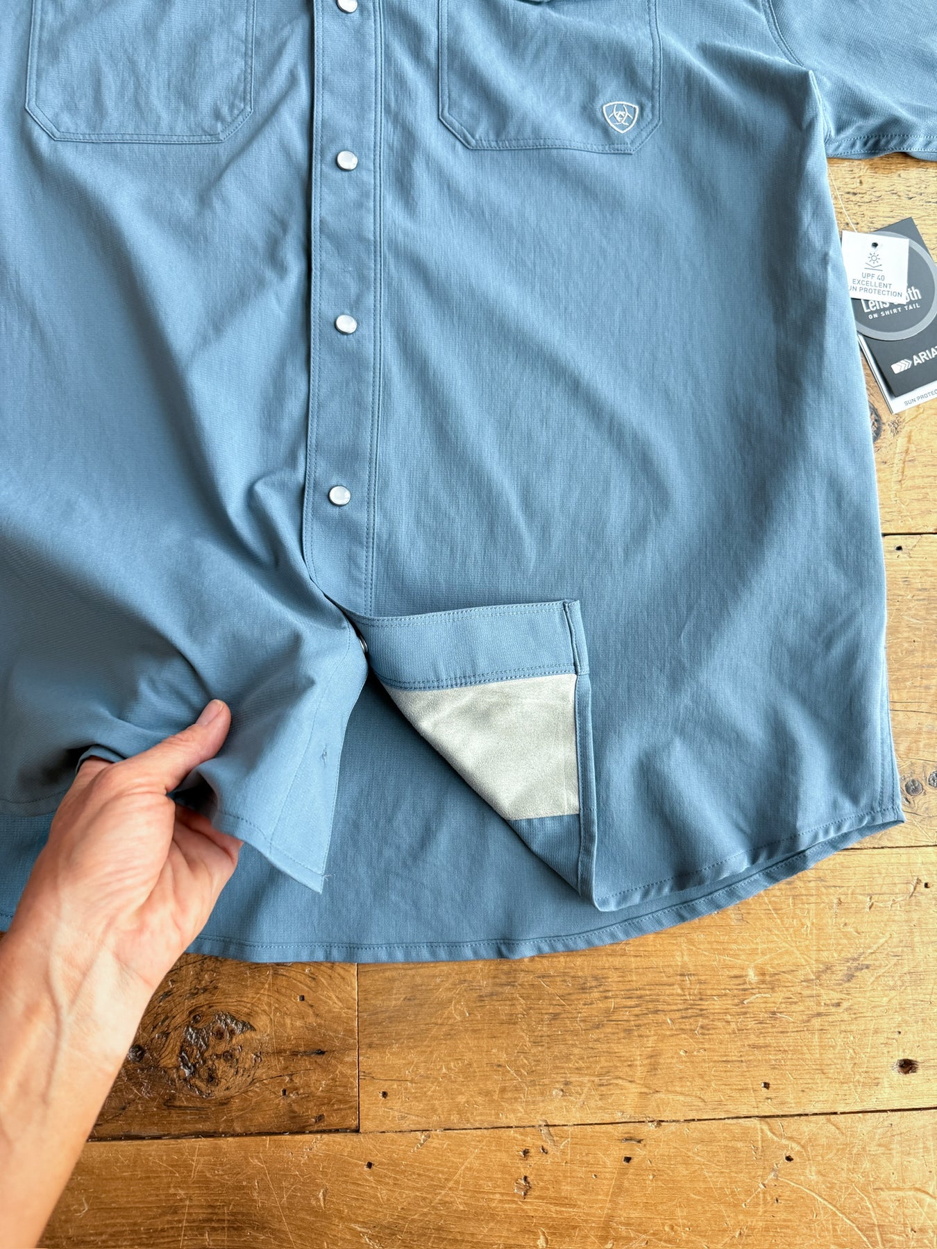 Hidden microfiber lens cloth on shirt tail.