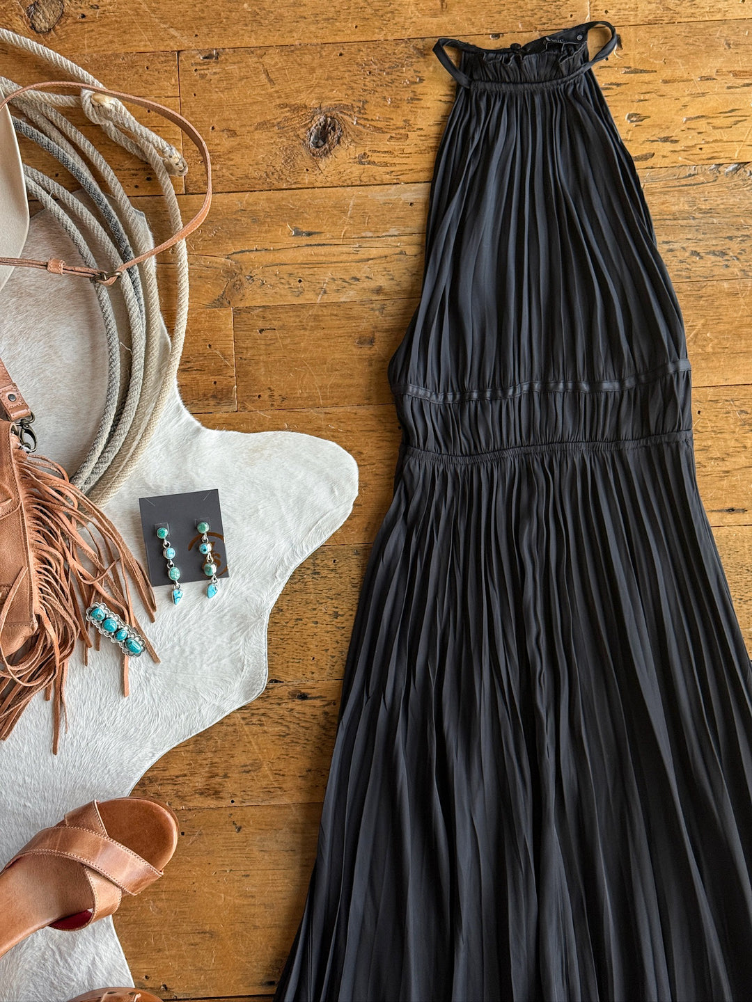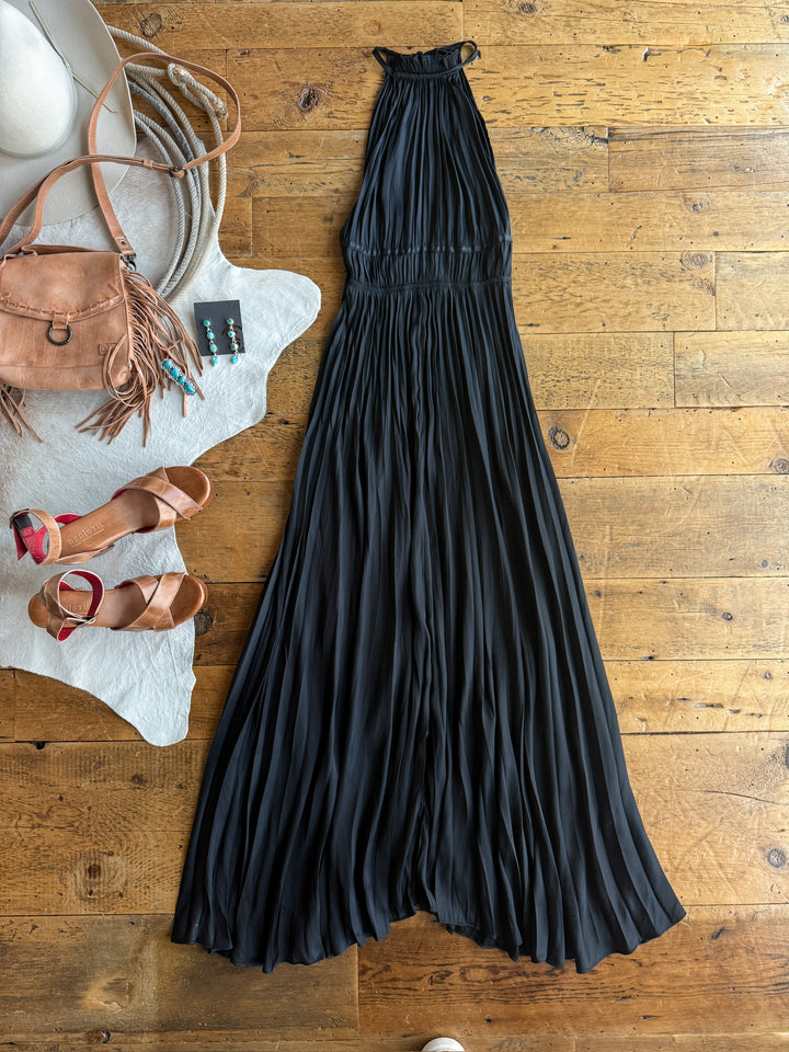 Black satin halter neck maxi dress.