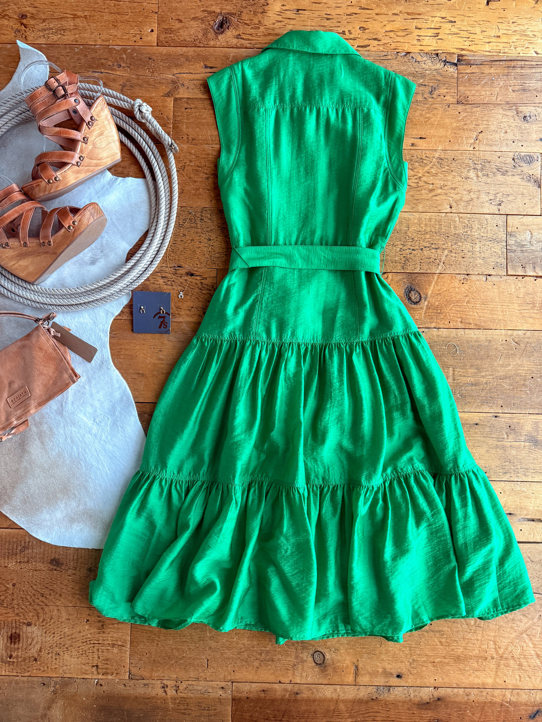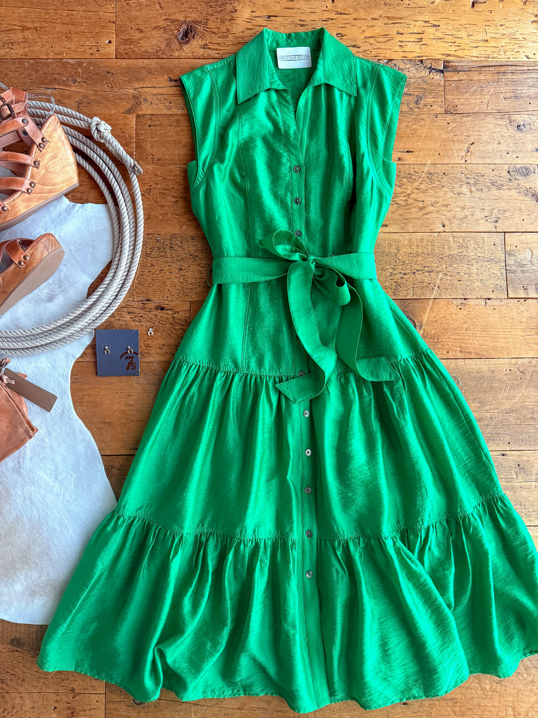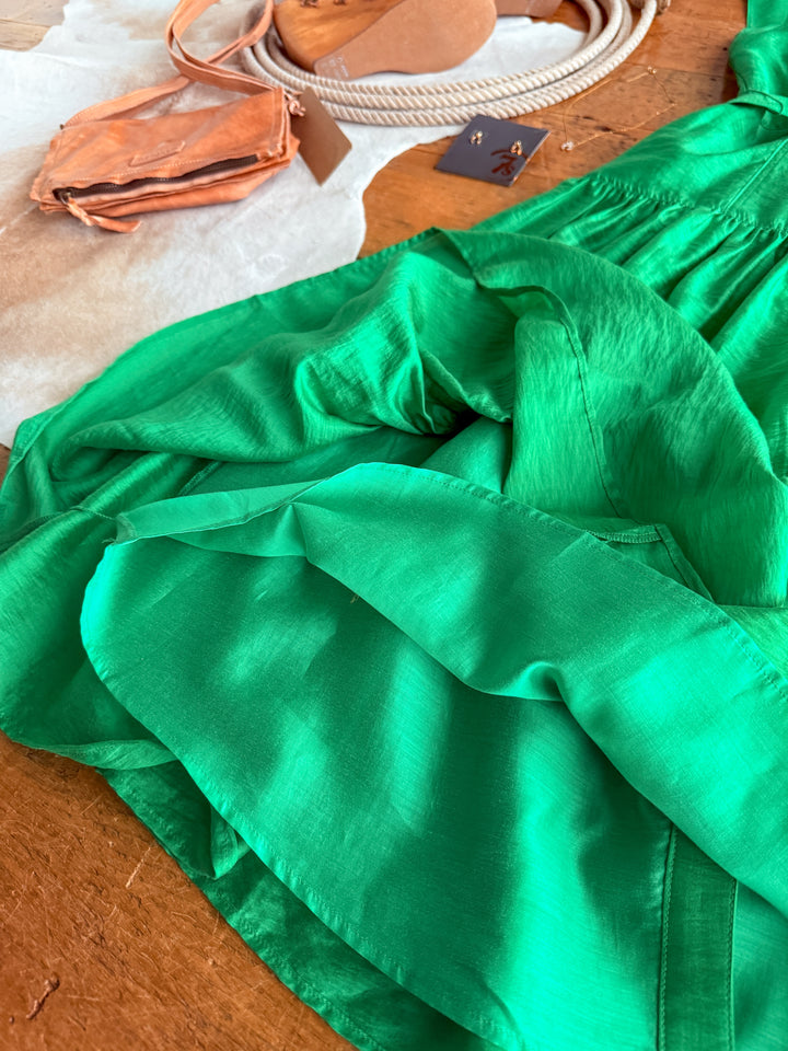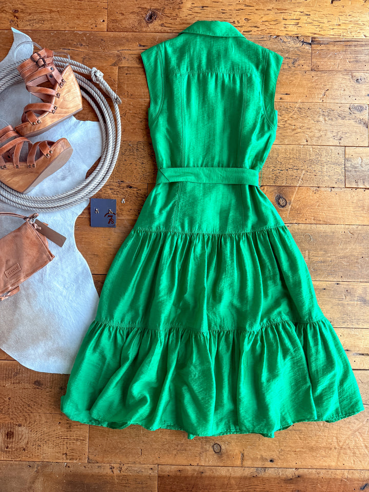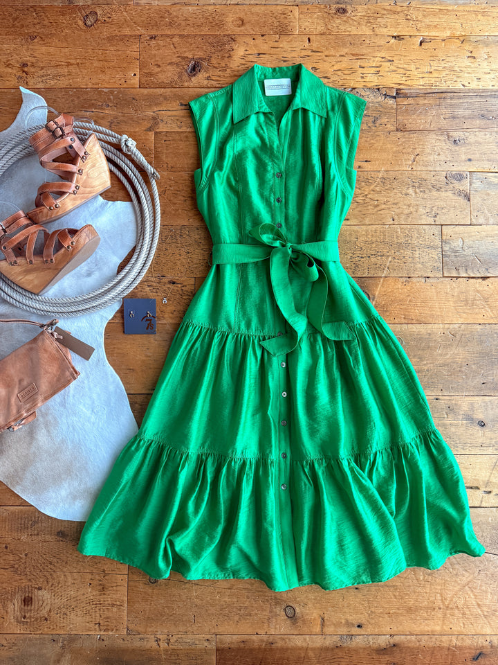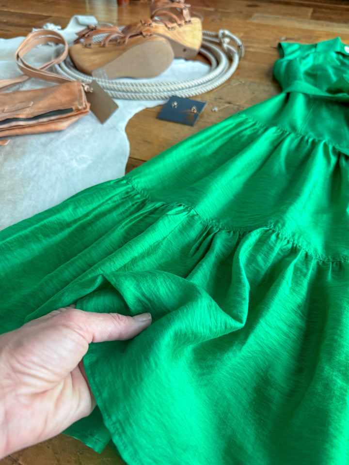 Jade green cap sleeve button up midi dress.