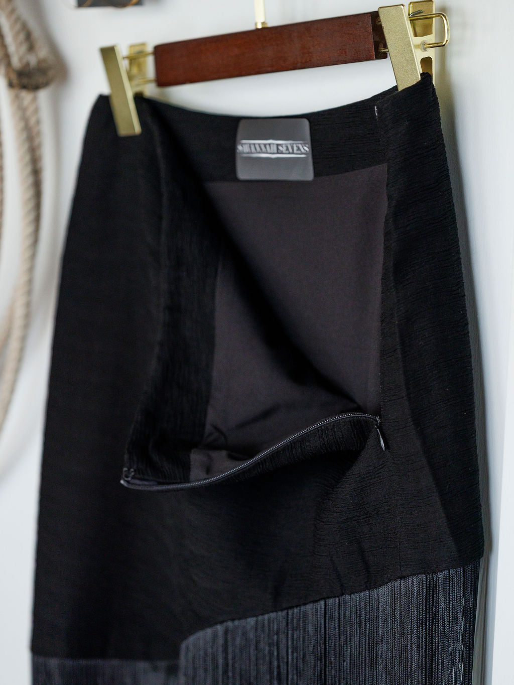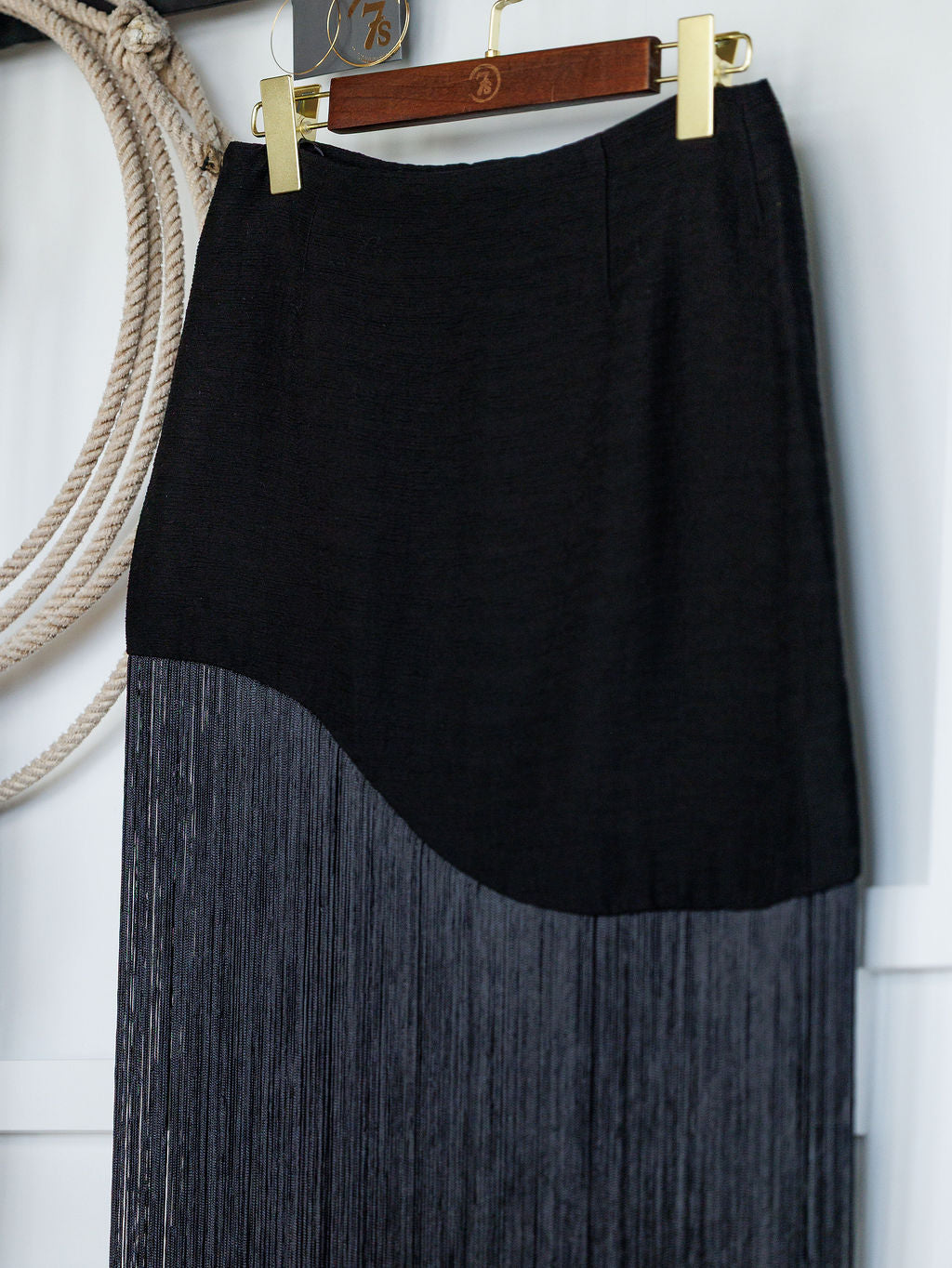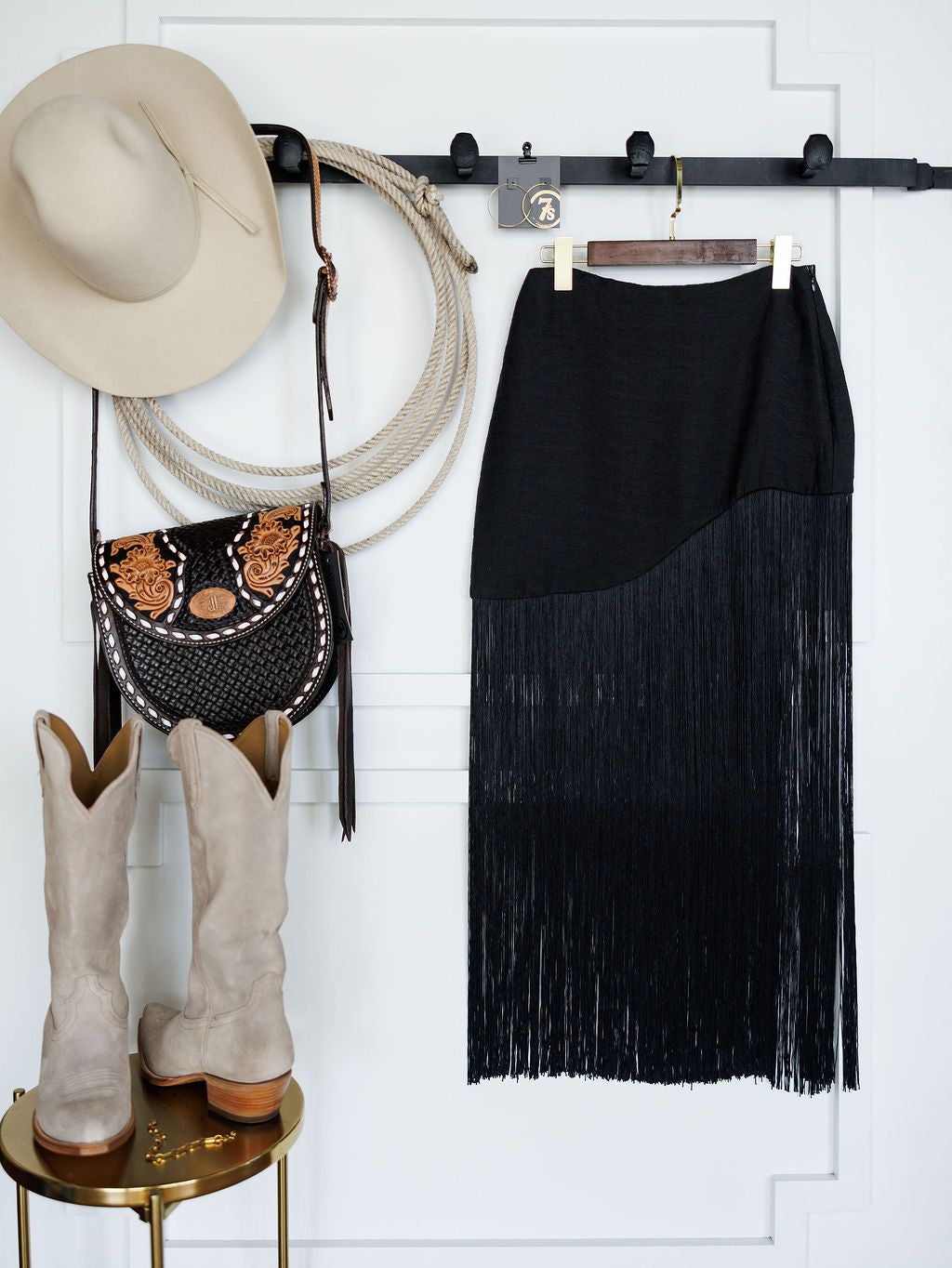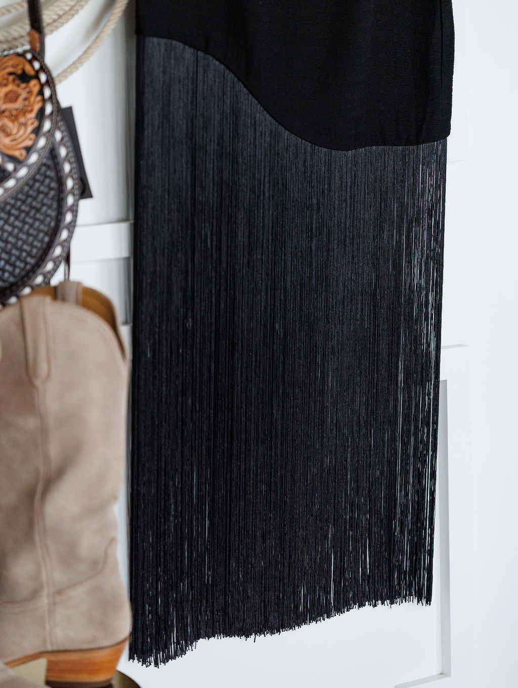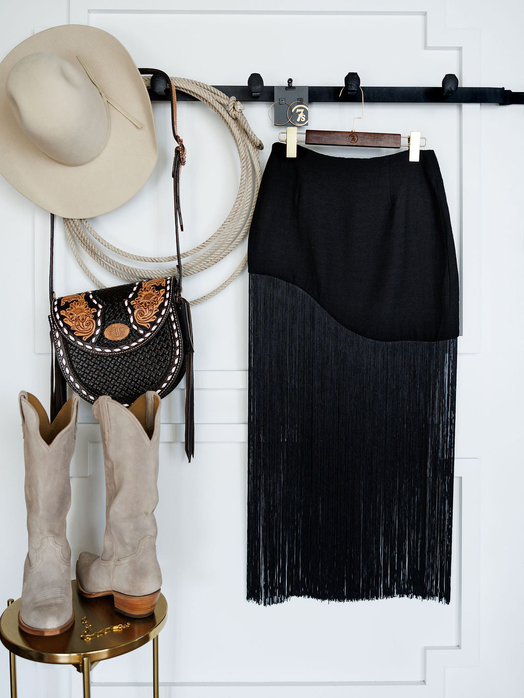 Hits upper thigh at the highest point, mid thigh at the lowest; fringe hits at the ankle on our 5'7" woman.