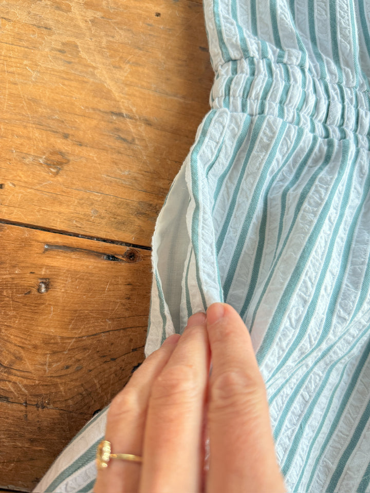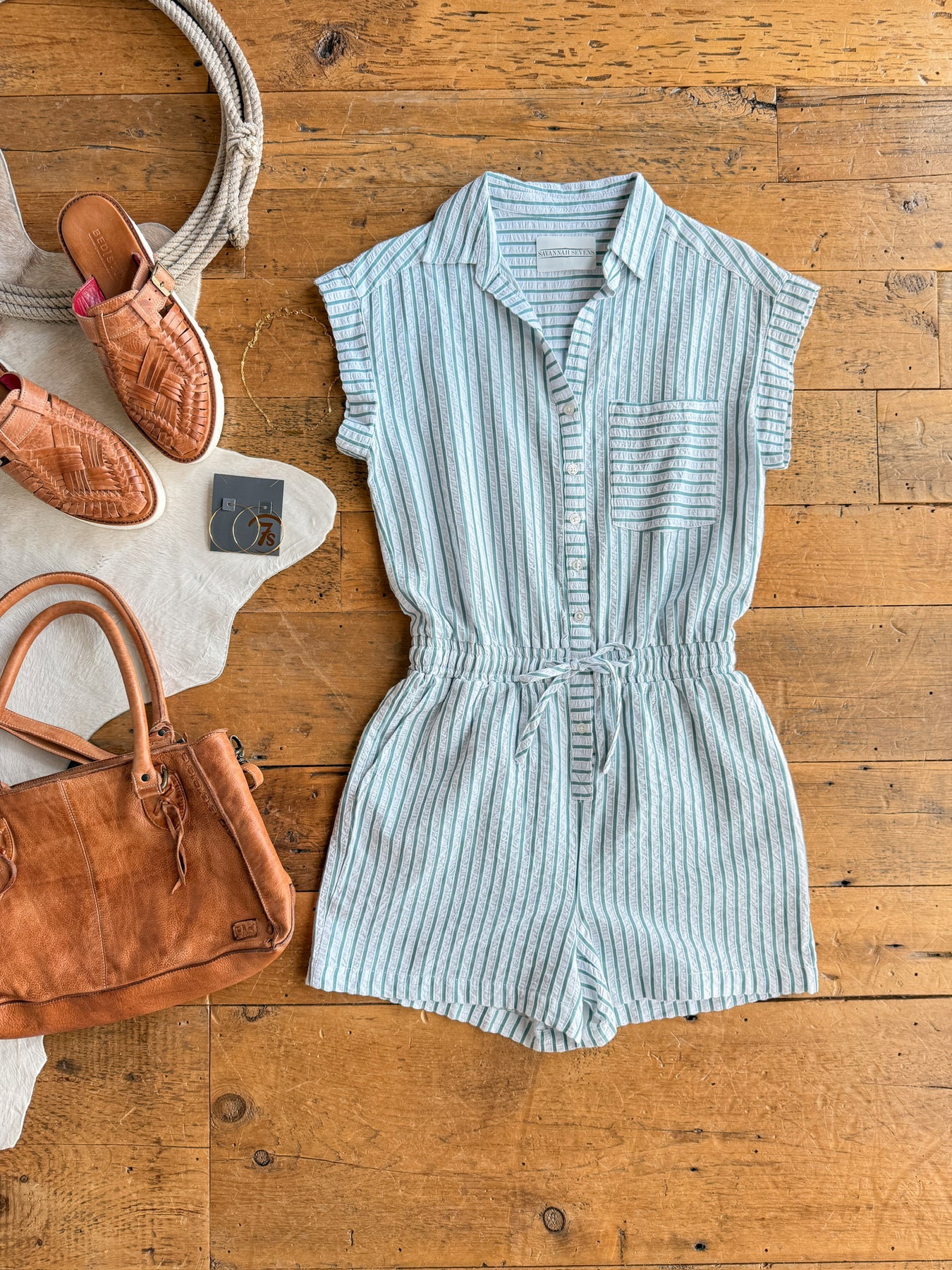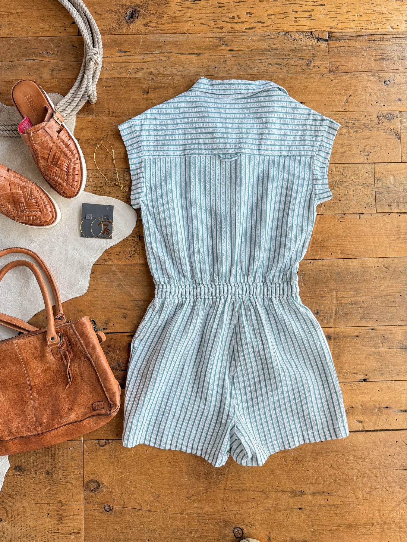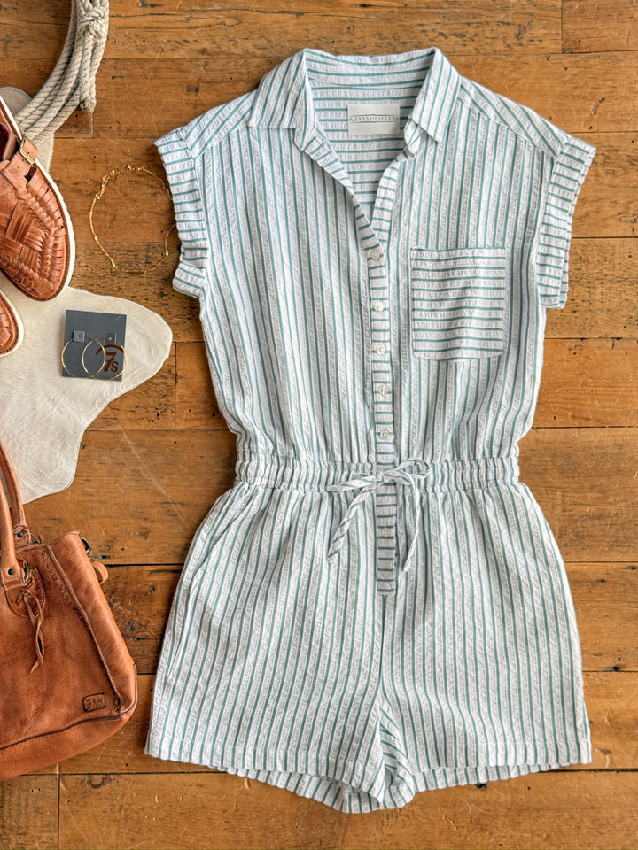 • Striped short sleeve button up romper.