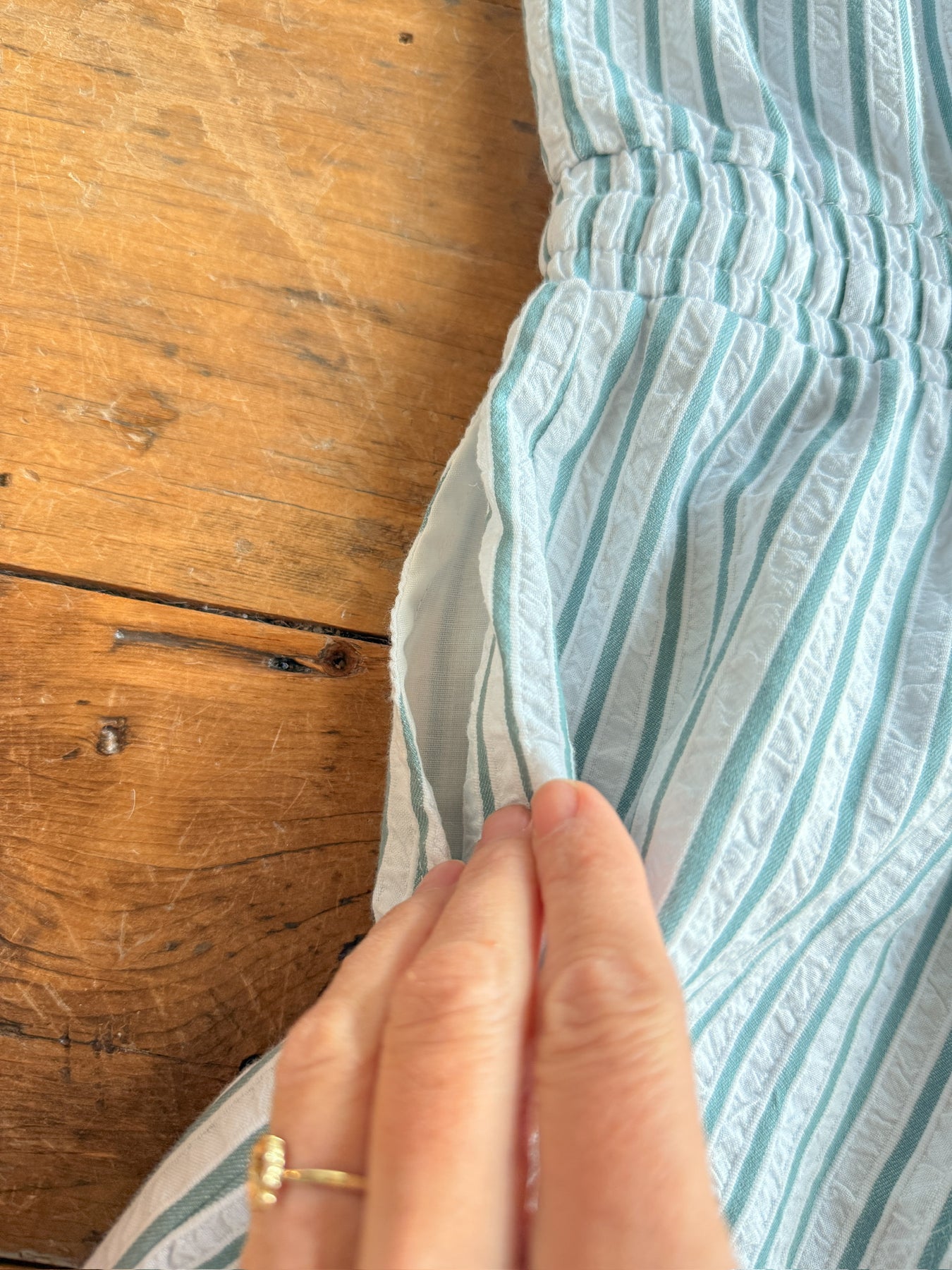 • White with a sea sage stripe pattern.