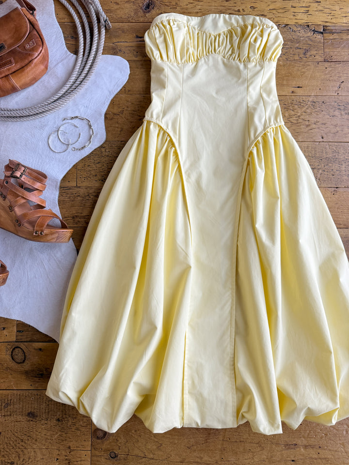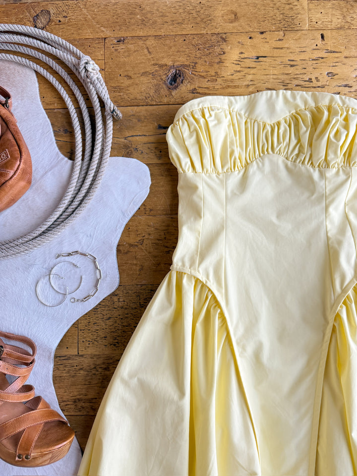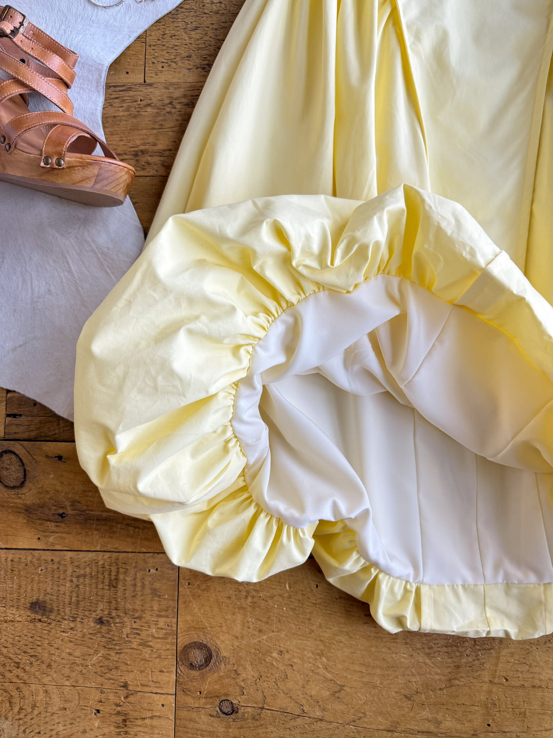 A-Line silhouette with gathered fabric detail at the hips that creates a flared silhouette.